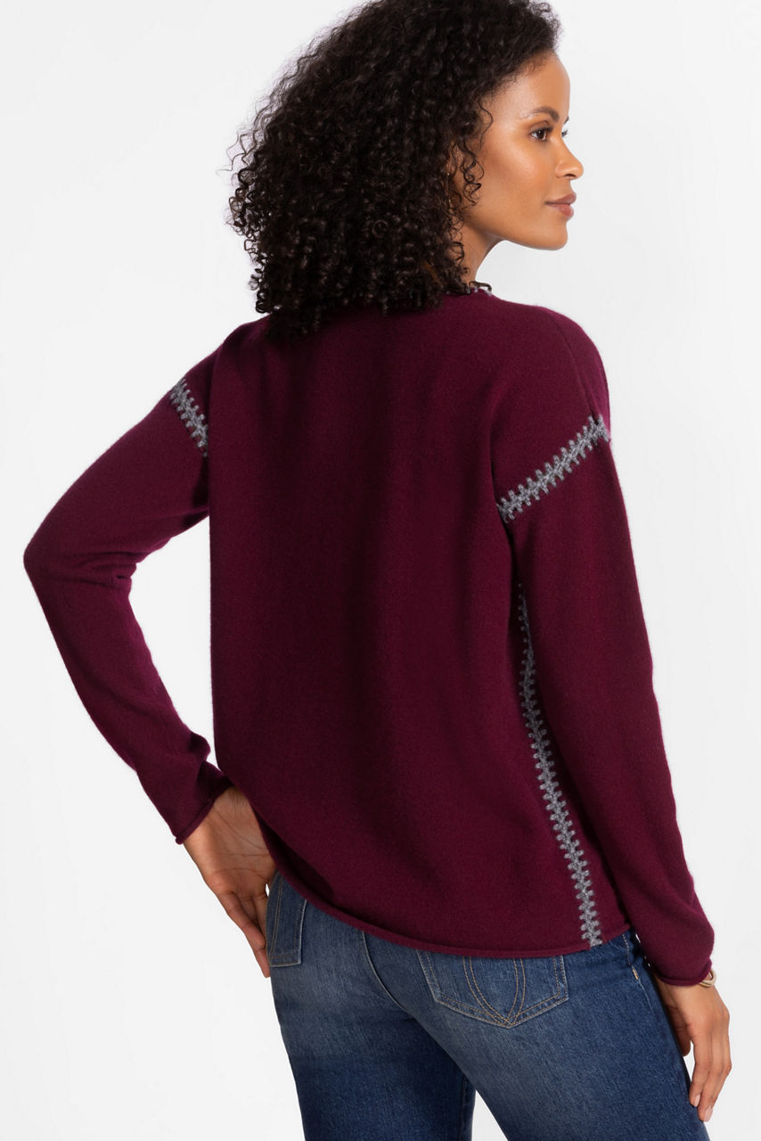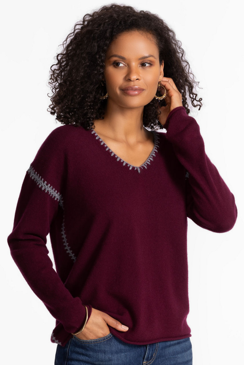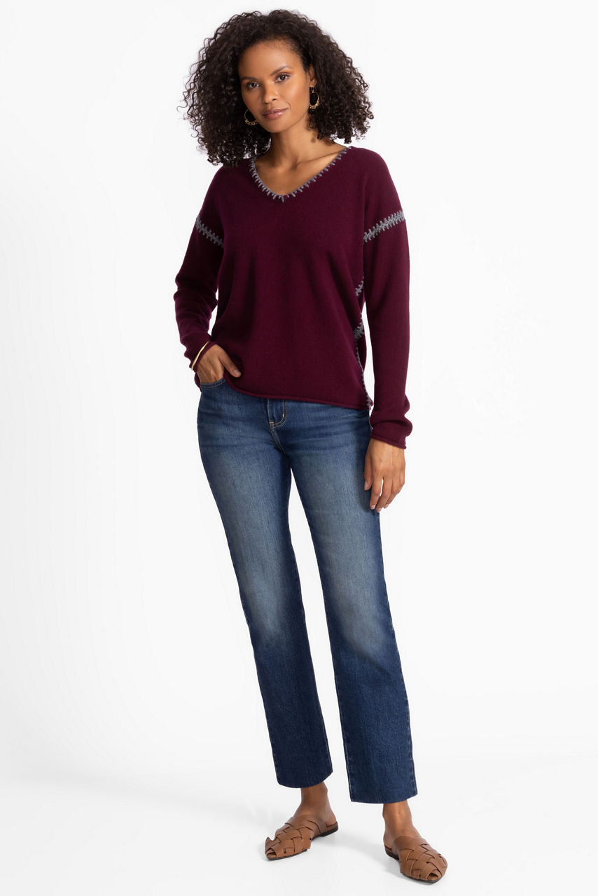 The Whipstitch V-Neck Sweater is crafted from 100% cashmere, blending plush comfort with unmistakable style. Designed with a V-neckline and dropped shoulders, this cozy pullover is embellished at the seams with a decorative whipstitch. Pair with a bold maxi skirt and tall boots for a timeless evening look.