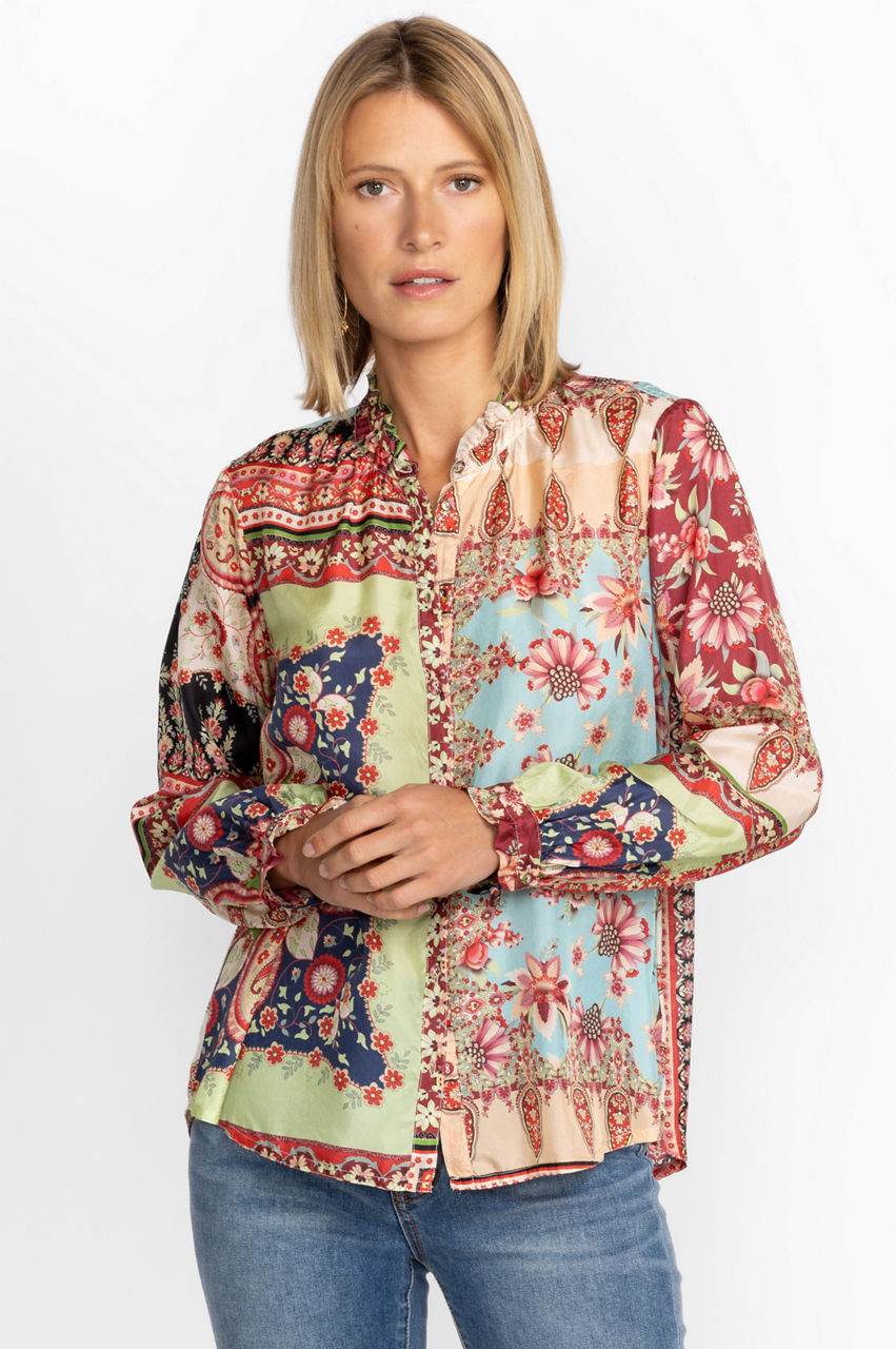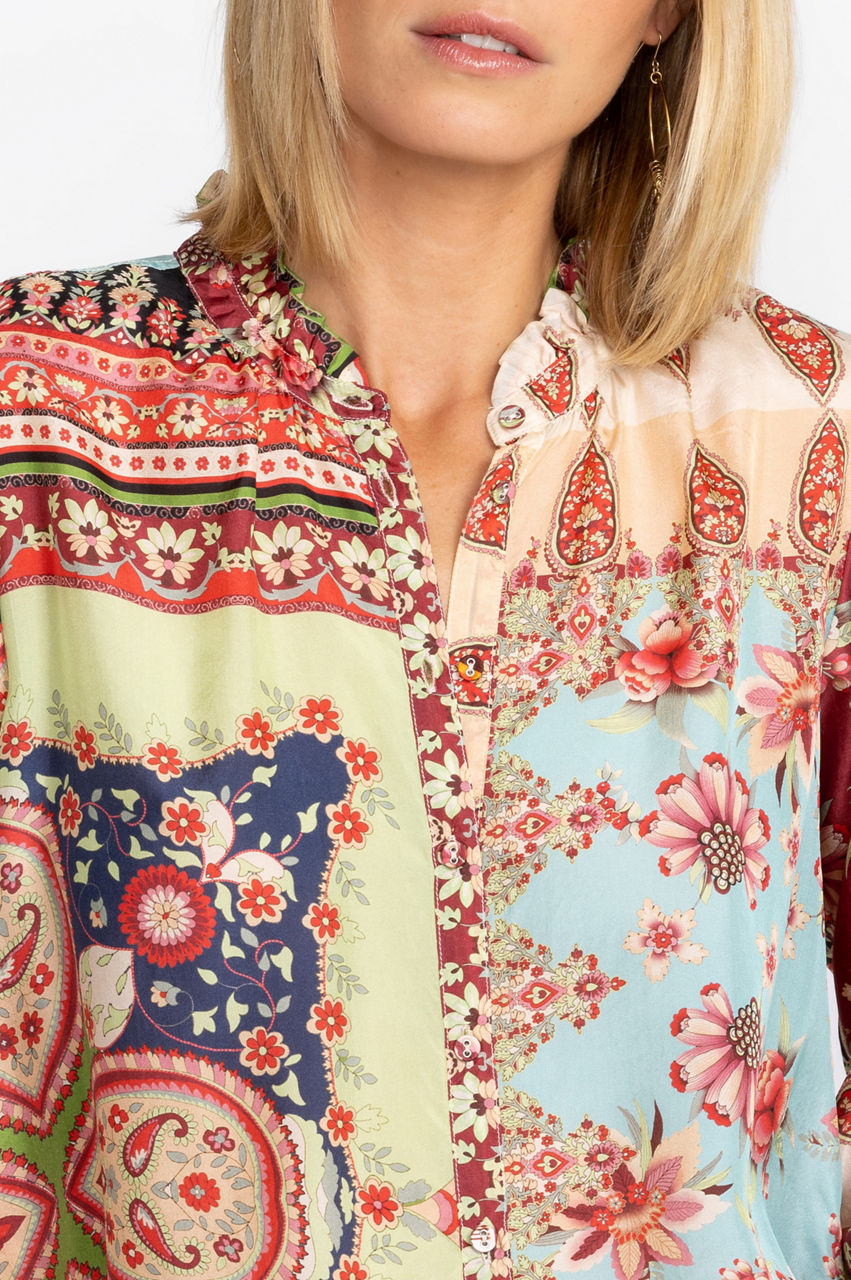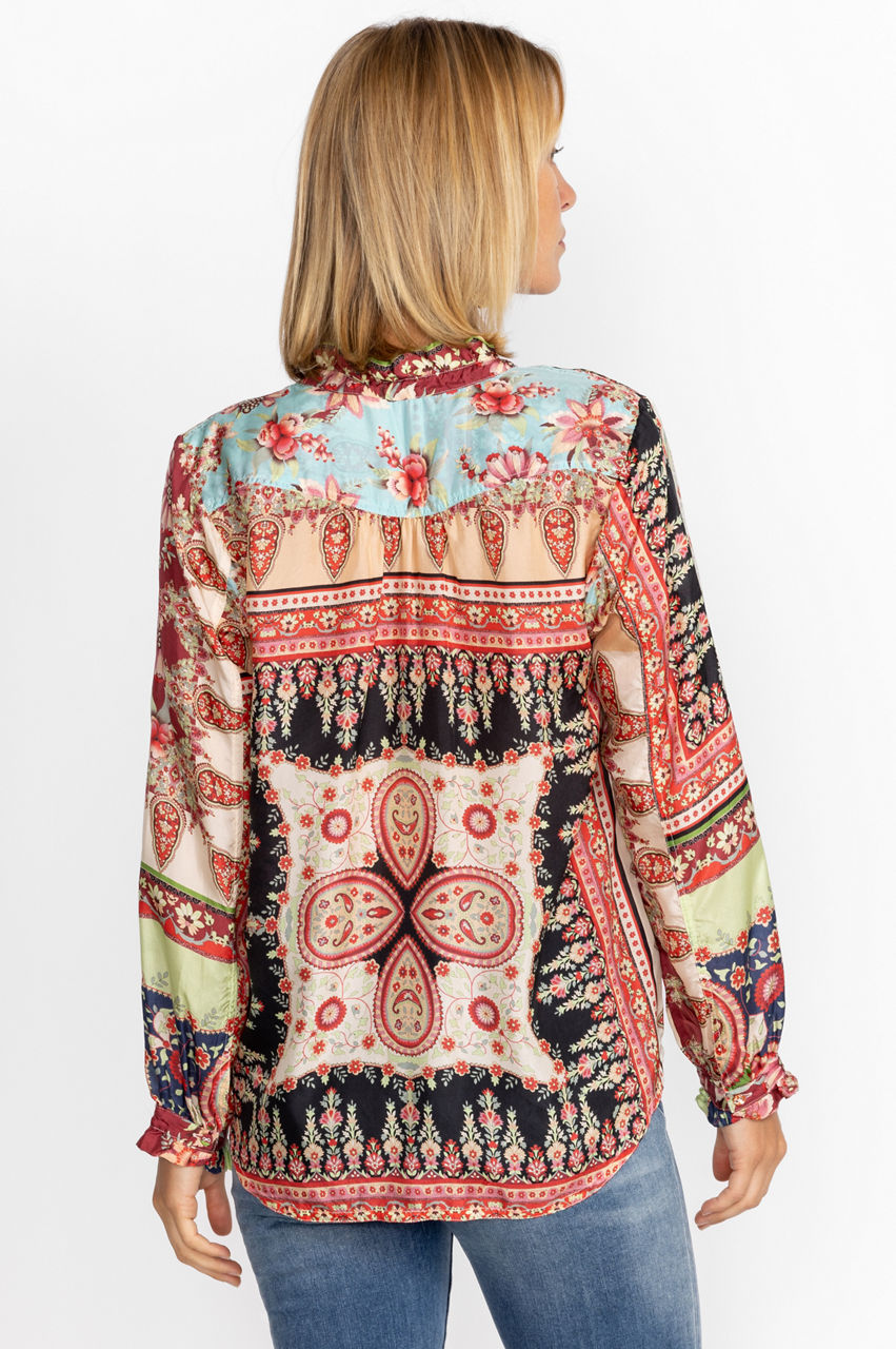 Pops of bold colors and bohemian-inspired prints bring the Thena Ambel Blouse to life. Spun from sumptuous silk, this elegant blouse encapsulates an antique charm complete with a front button closure, long sleeves, and a ruffle collar and sleeves for a fanciful touch. Dress up your ensemble by pairing this blouse with tailored pants and heels.