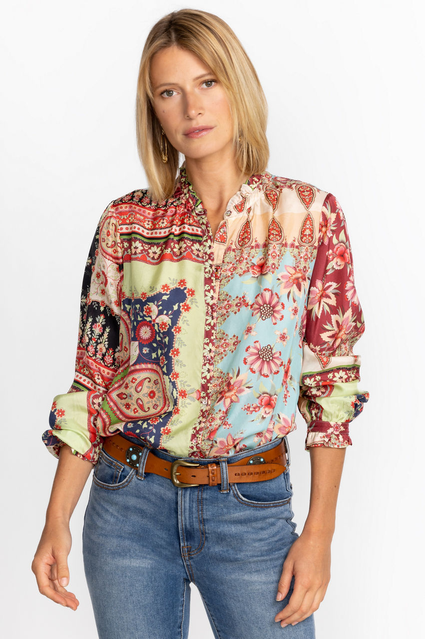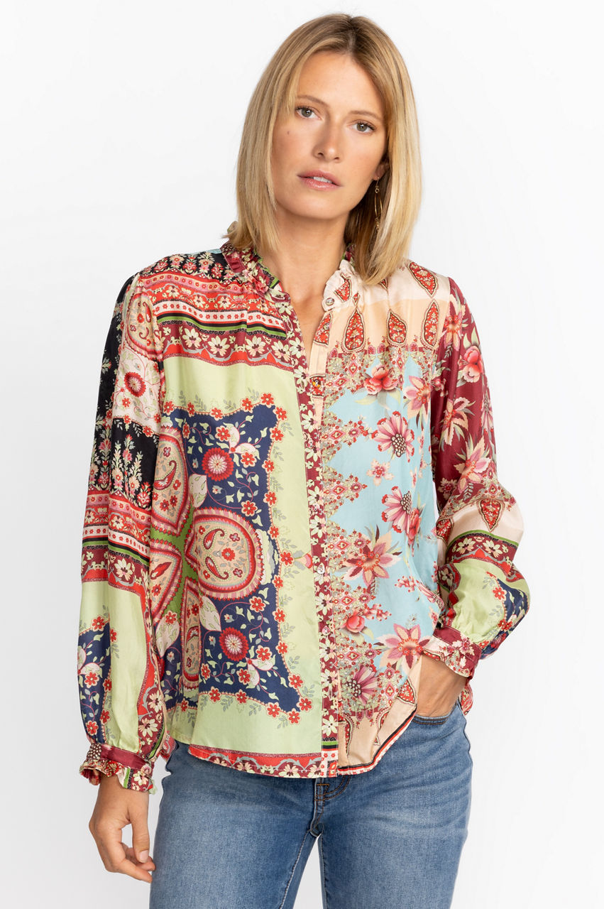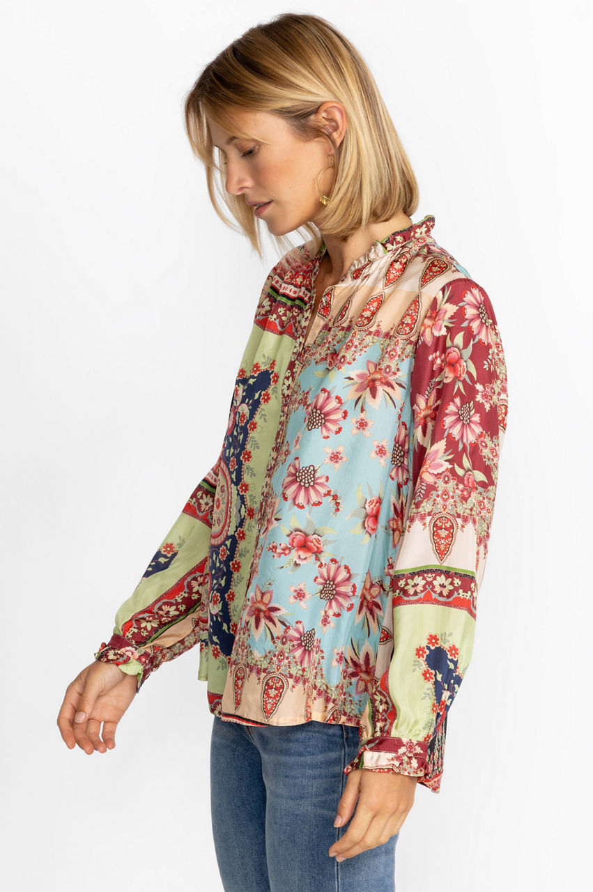 Pops of bold colors and bohemian-inspired prints bring the Thena Ambel Blouse to life. Spun from sumptuous silk, this elegant blouse encapsulates an antique charm complete with a front button closure, long sleeves, and a ruffle collar and sleeves for a fanciful touch. Dress up your ensemble by pairing this blouse with tailored pants and heels.