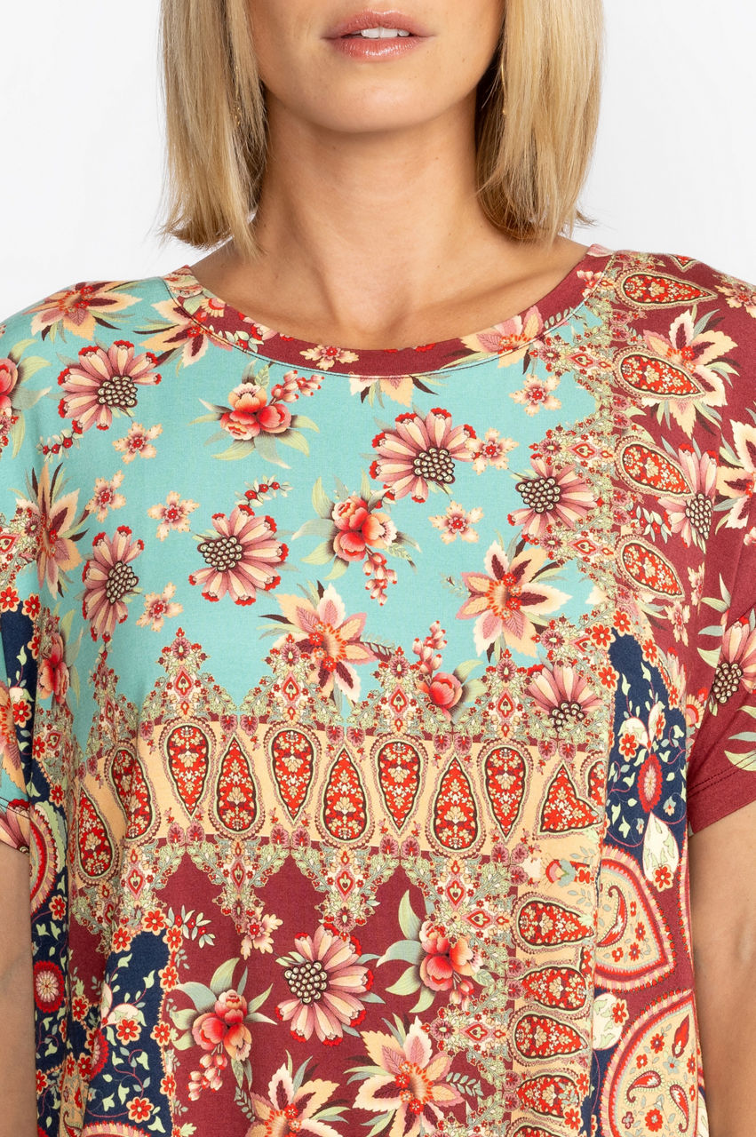 Ornately detailed with blocks of stunning color embellished with colorful floral displays, the Thena Box Pleat Swing Tee is an effortless wardrobe option. Featuring carefully placed box pleats that create a relaxed fit, this design allows the tee to move freely as you move. Pair with fitted pants or leggings to highlight the flowing top.