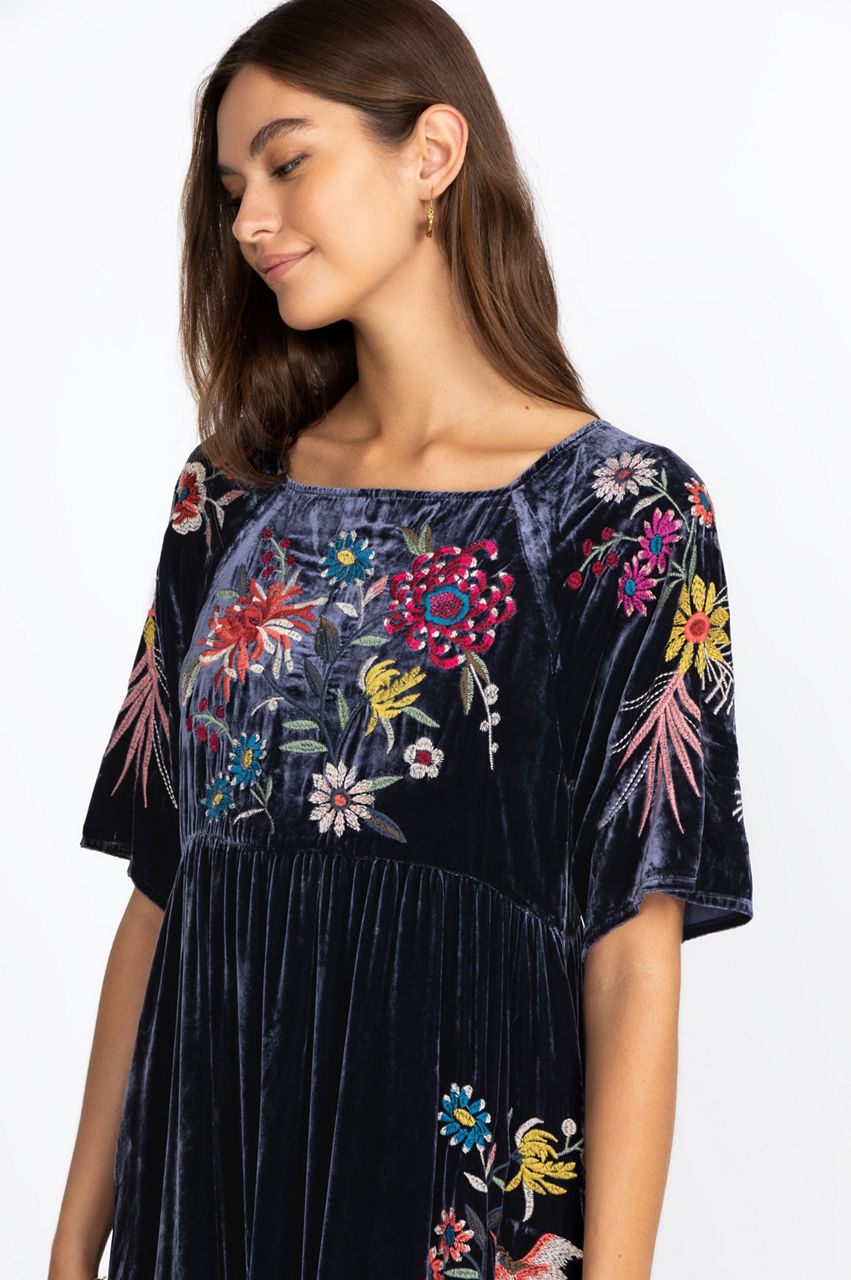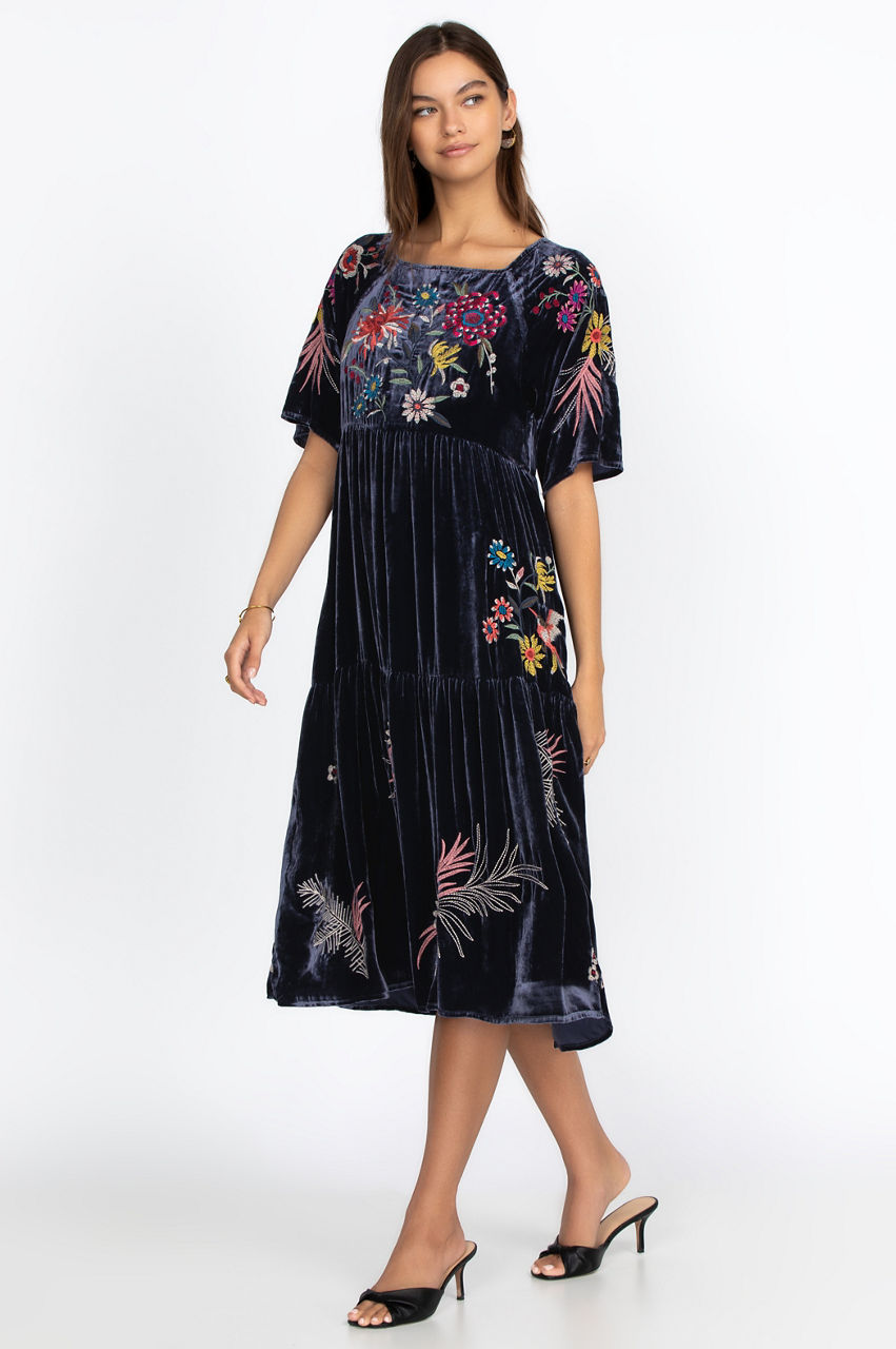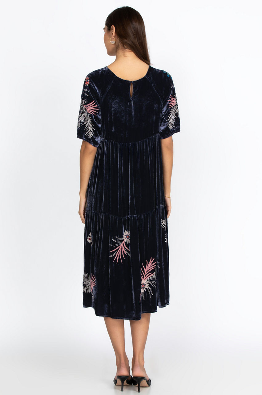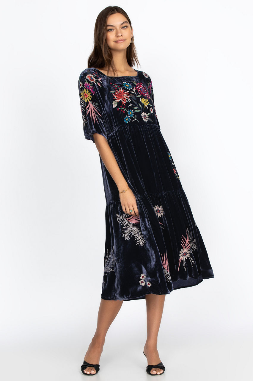 The Tiarei Velvet Raglan Tiered Dress features a chic square neckline, detailed floral embroidery, and original tiered construction. This gorgeous dress creates a flowy silhouette and moves with you thanks to its tiered cut. The wide sleeves are great for showcasing metallic bangles and bracelets, while the print will stand out if you use a neutral cardigan as a top layer before adding a floral bag.