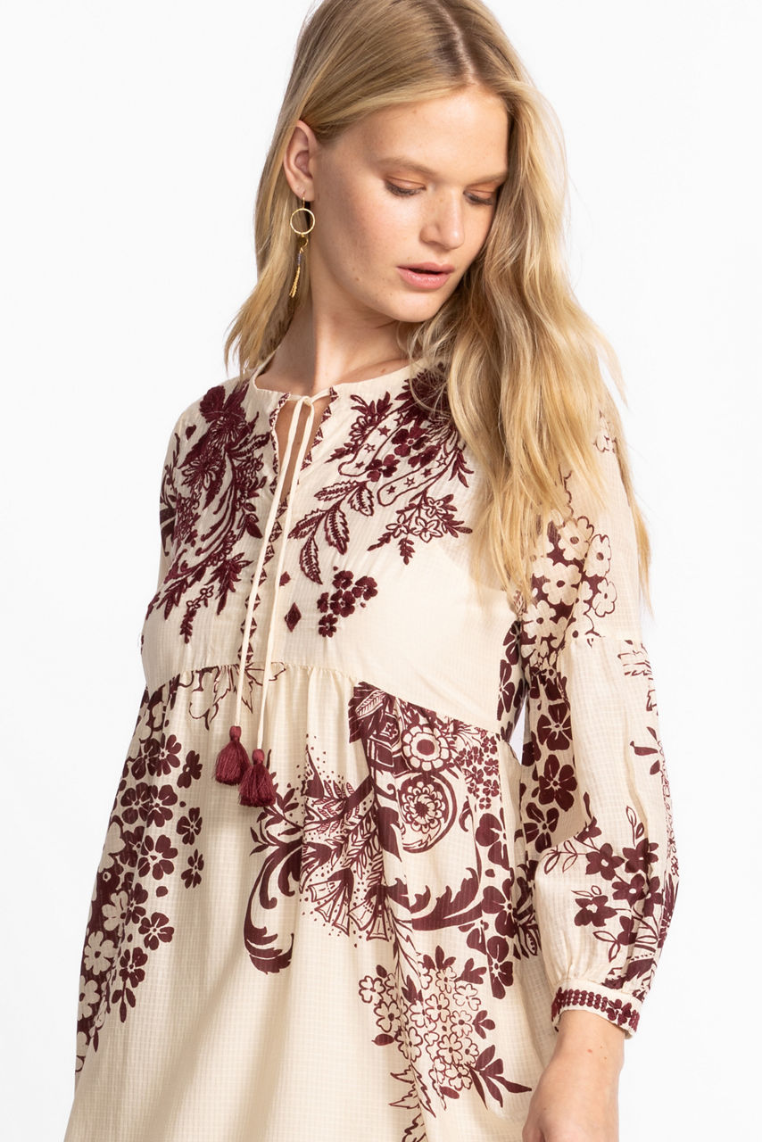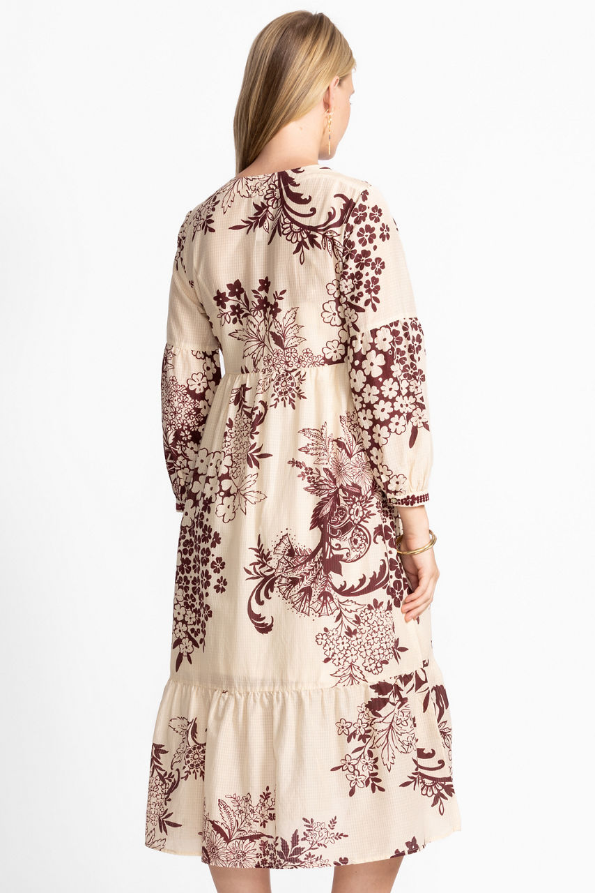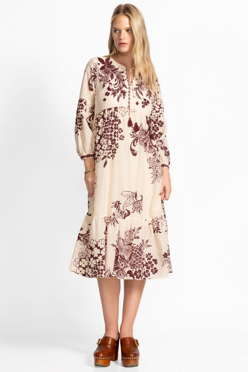 Beautifully adorned with a brilliant arrangement of floral blooms, the Aquijio Tiered Bishop Sleeve Dress is the perfect blend of comfort and feminine beauty. Designed with a split V-neckline and 3/4 bishop sleeves, this flowing tiered dress is embellished with intricate tonal embroidered detailing. Pair with coordinating espadrille wedges and eclectic jewelry for a boho feel.