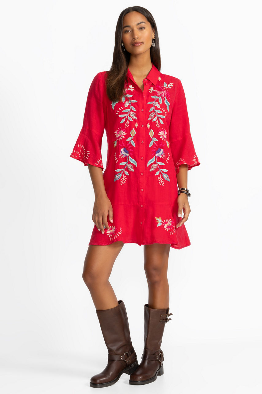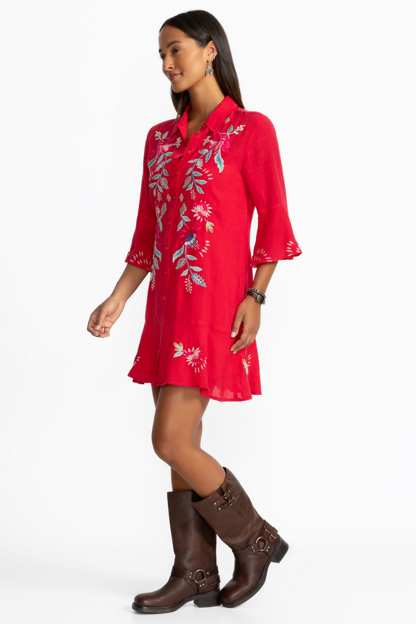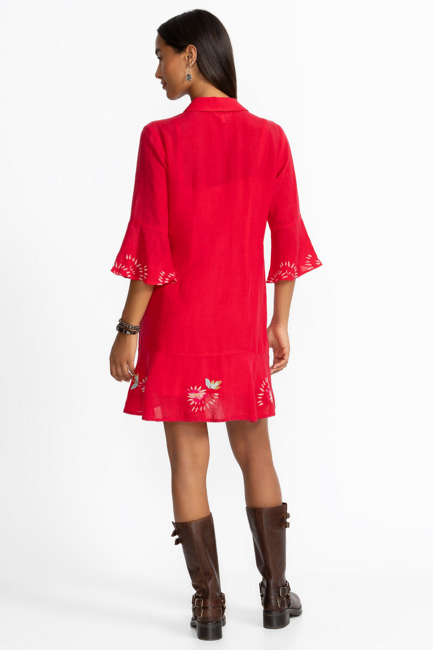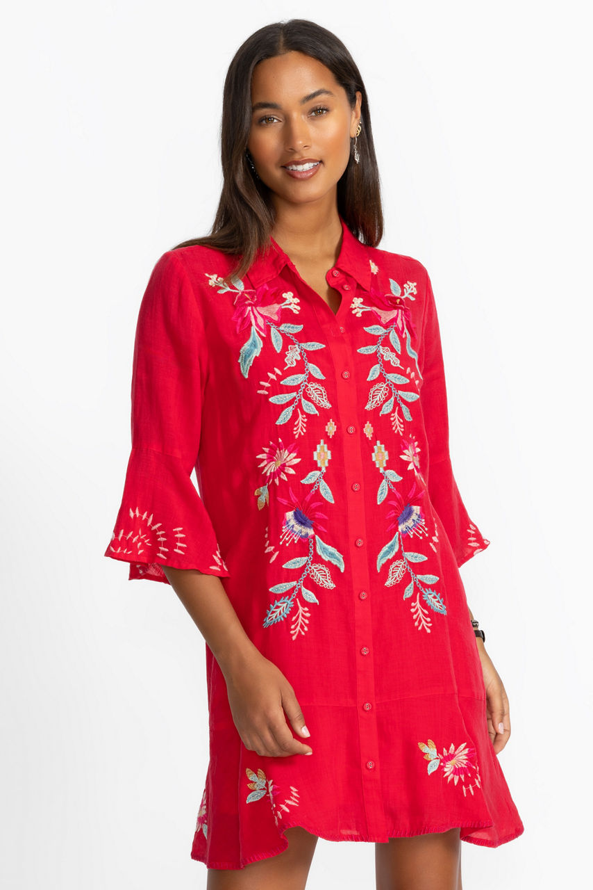 Beautifully embroidered with colorful floral designs, the Tiered Flounce Dress expertly combines bold color and casual comfort. Crafted from a lightweight flowing fabric, this slip-lined dress features a button-front closure and is finished with flounce sleeves and hemline for added texture. Pair with coordinating sandals and a crossbody bag for a day of sightseeing.