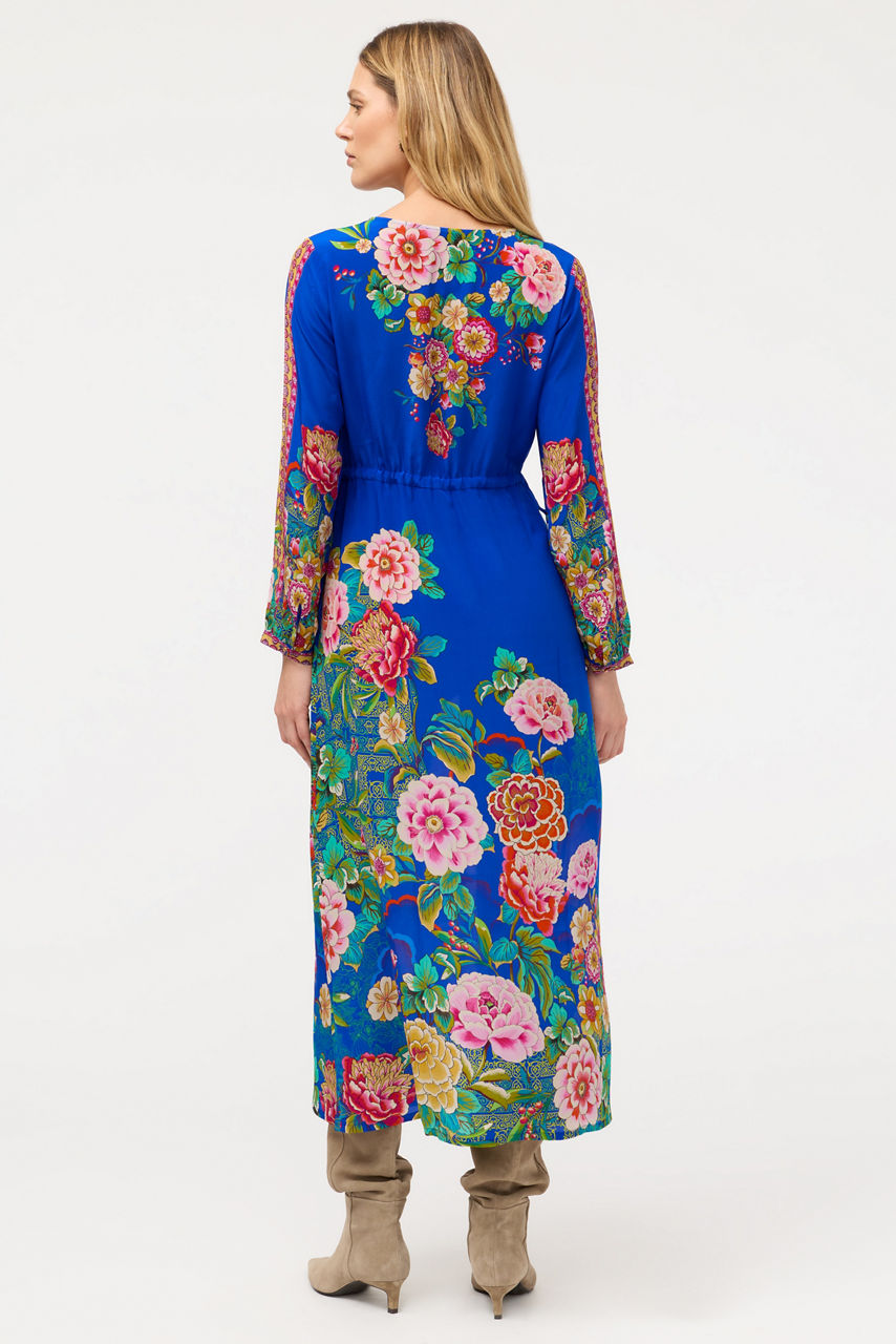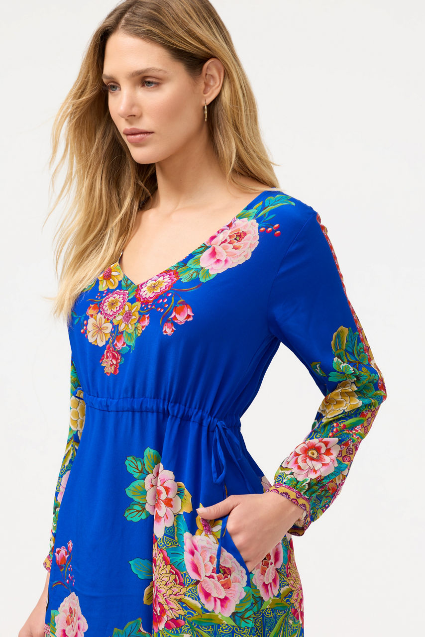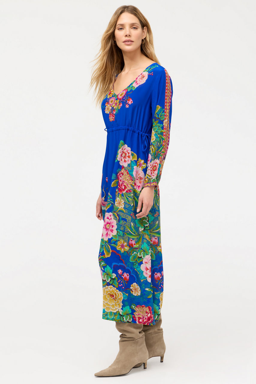 Beautifully embellished with a vibrant floral pattern on a rich blue backdrop, the Tieni Maxi Dress is crafted from 100% flowing silk. Designed with a V-neckline and gently puffed bishop sleeves, this stunning slip-lined dress features on-seam pockets and is finished with a full-length maxi skirt. Pair with espadrille wedges and a clutch for an elegant resort-inspired look.