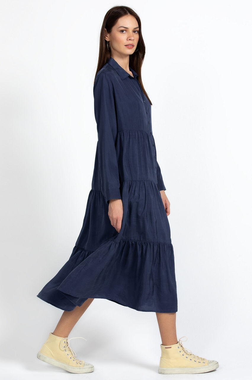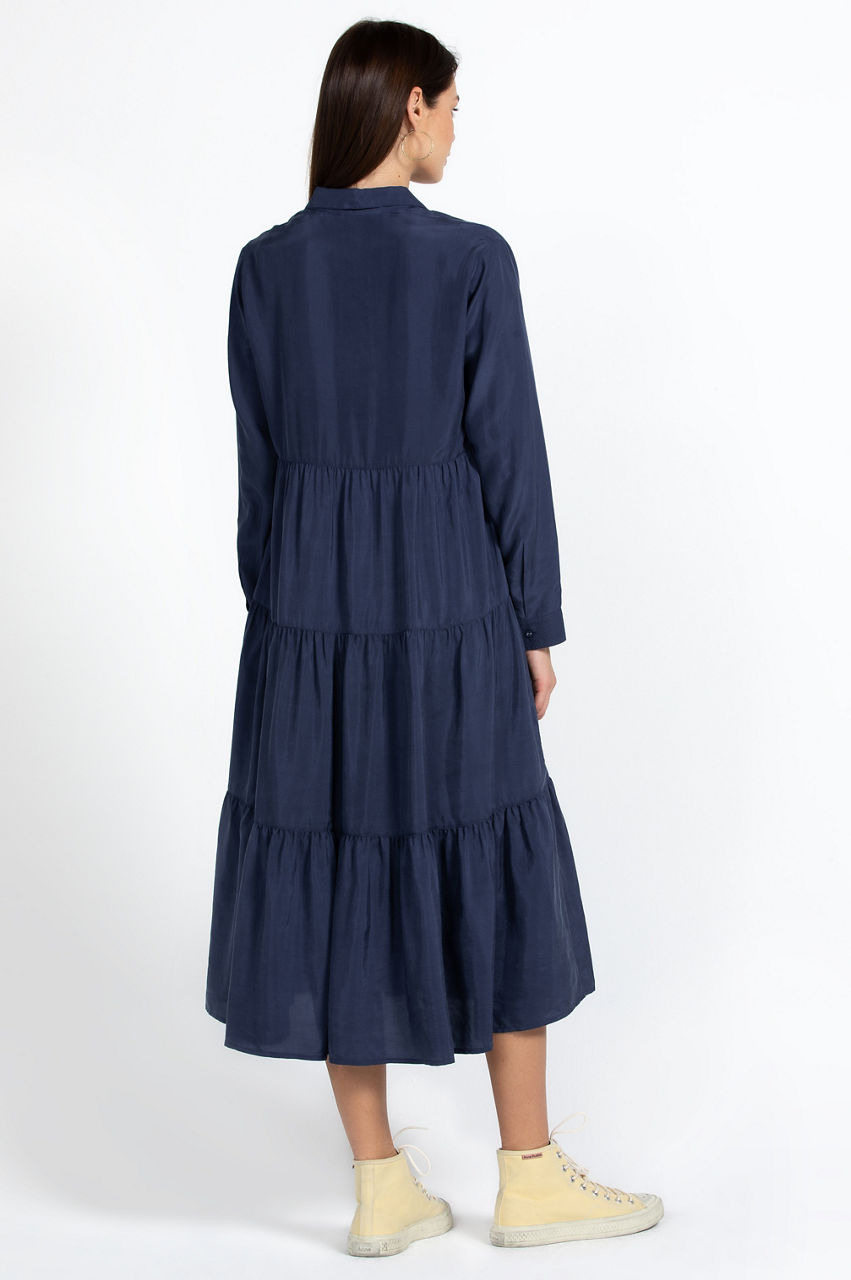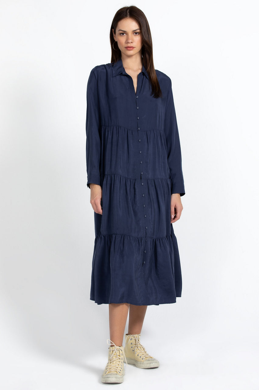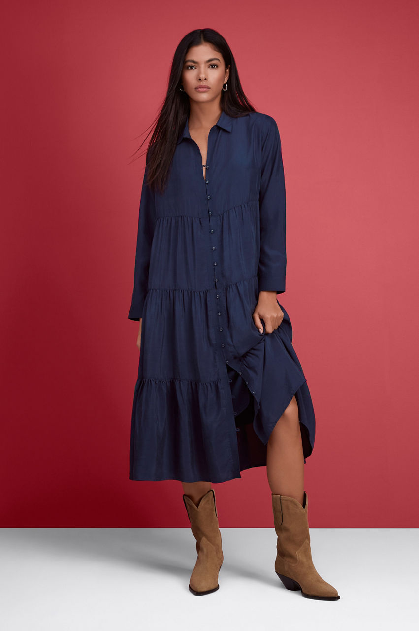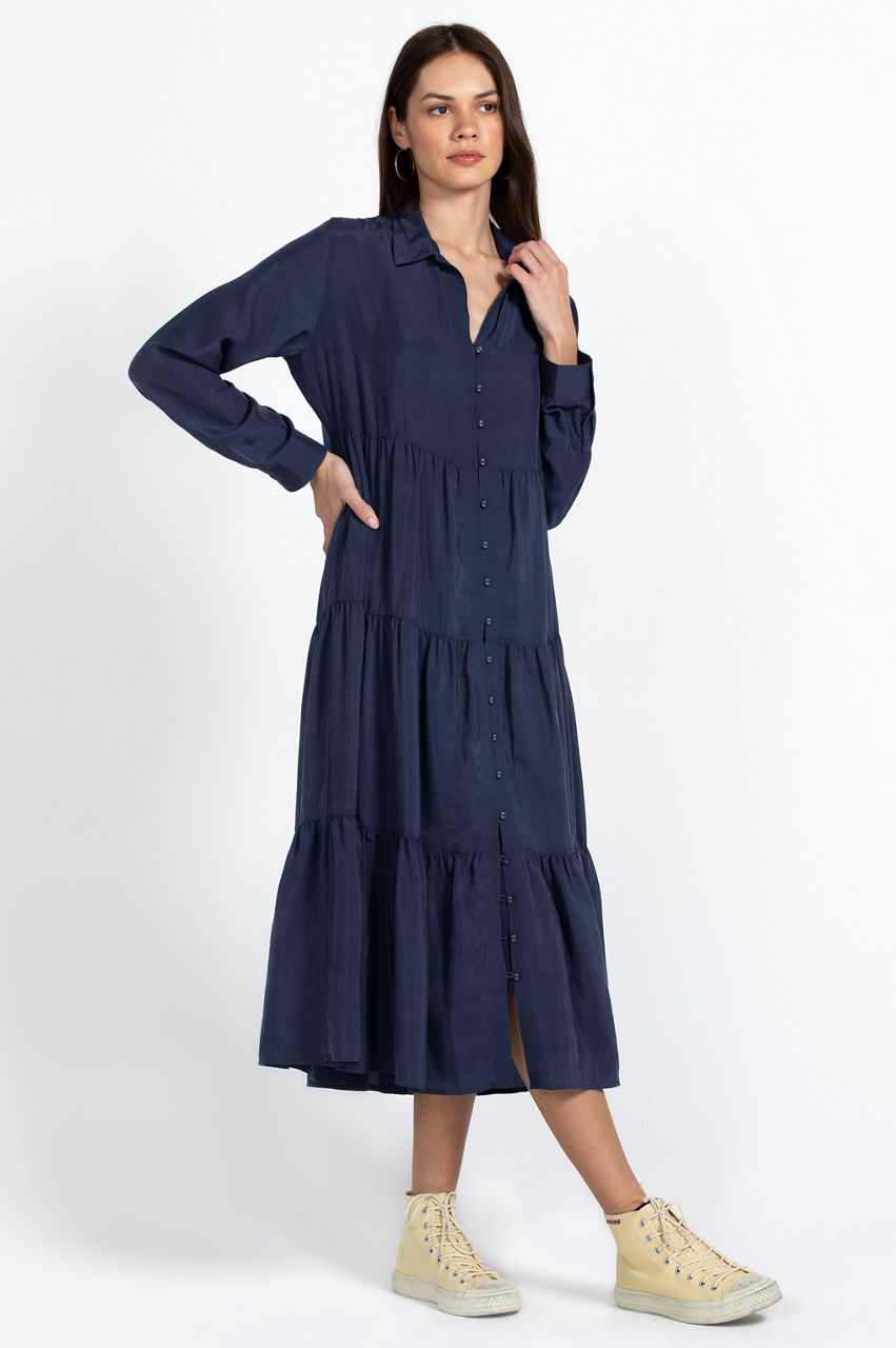 Designed with a bohemian edge, the Tiered Wanderer Dress fuses luxurious silk with a relaxed silhouette. Perfect for gatherings and vacations, this tiered dress is cut in an A-line fit and features a collar, long sleeves with button cuffs, a separate slip, and a front rouleau button fastening. Elevate this dress with heels or opt for flats and a handbag for a chic lunch ensemble.