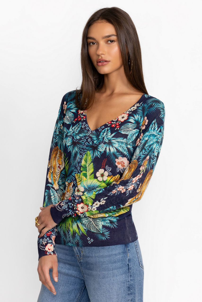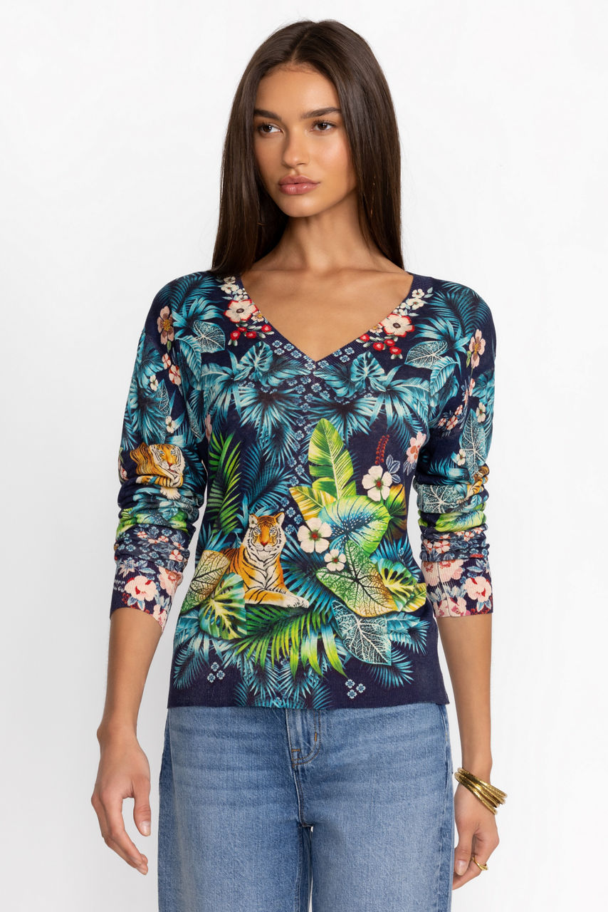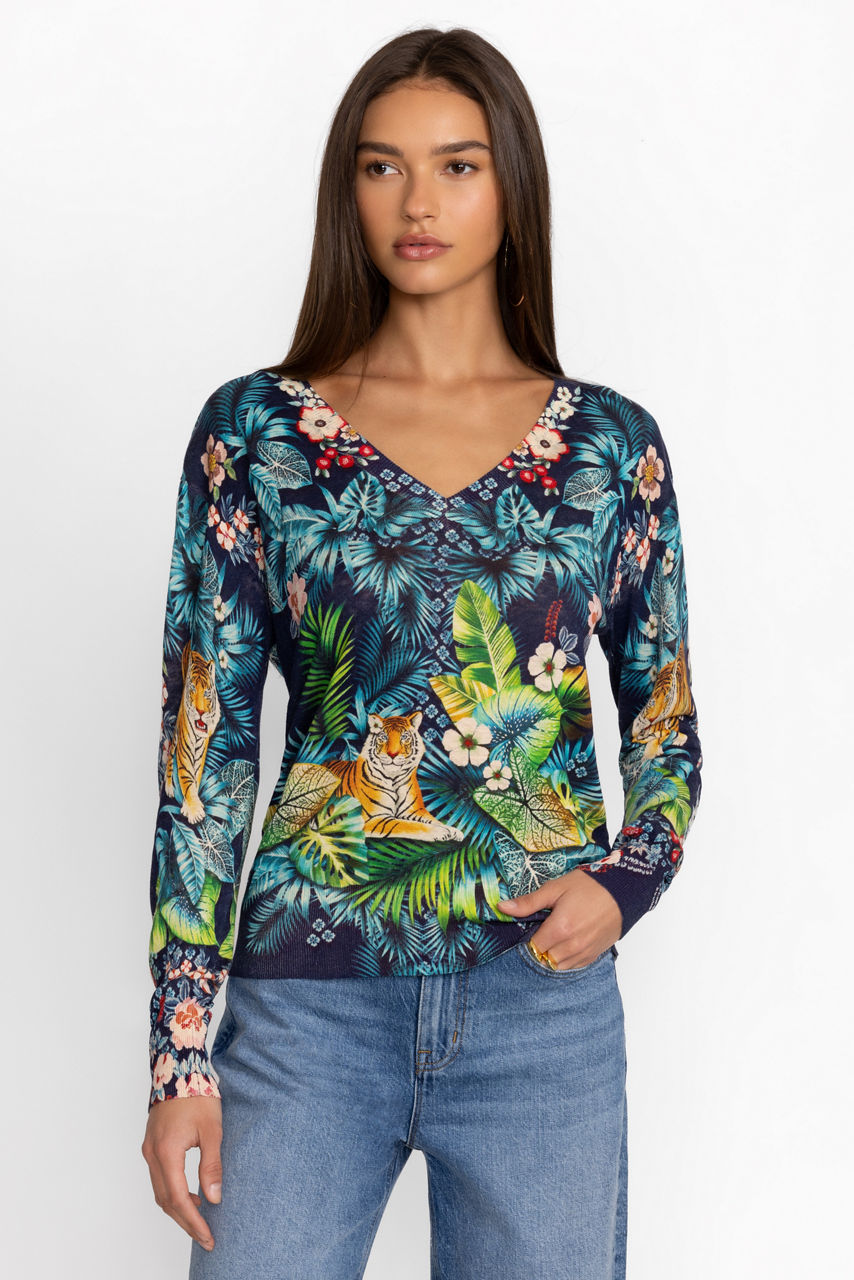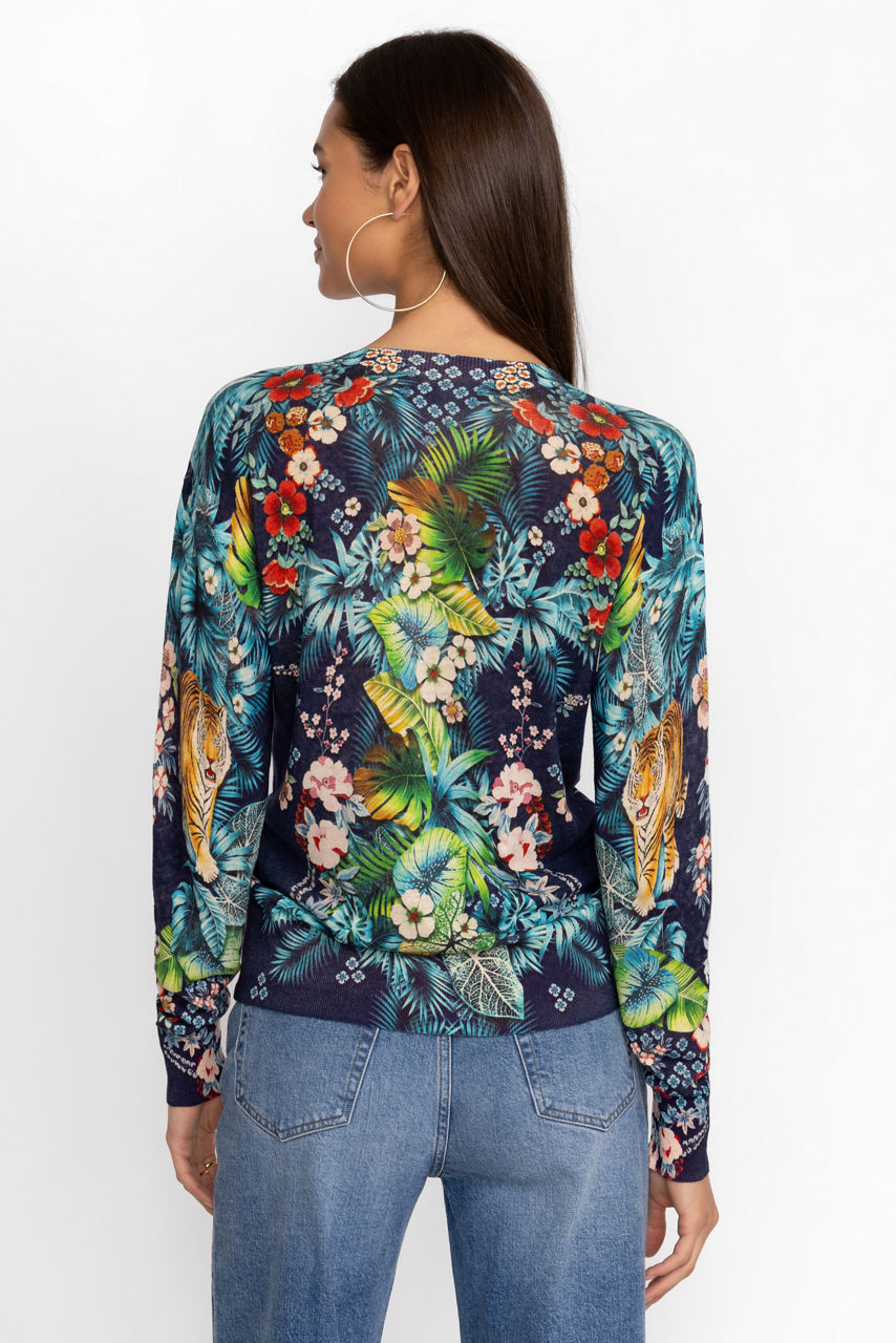 Crafted from a luxurious silk and linen blend, the Tigres Printed Pullover adds color and a spirit of adventure to your wardrobe. Featuring a V-neckline and fitted bodice, this long sleeve pullover is defined by vibrant depictions of bold flora and fauna. Layer over a classic button-down and pair with dark wash denim for a look saturated with color.