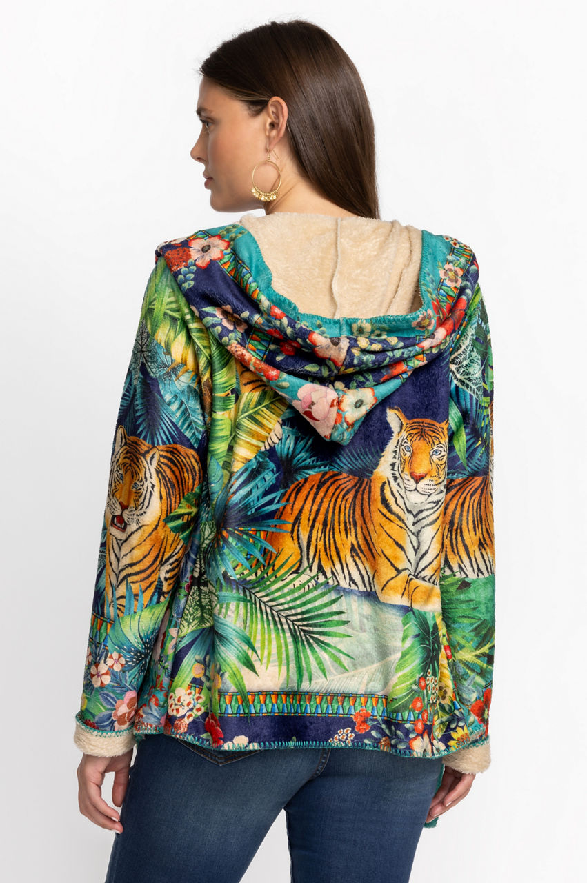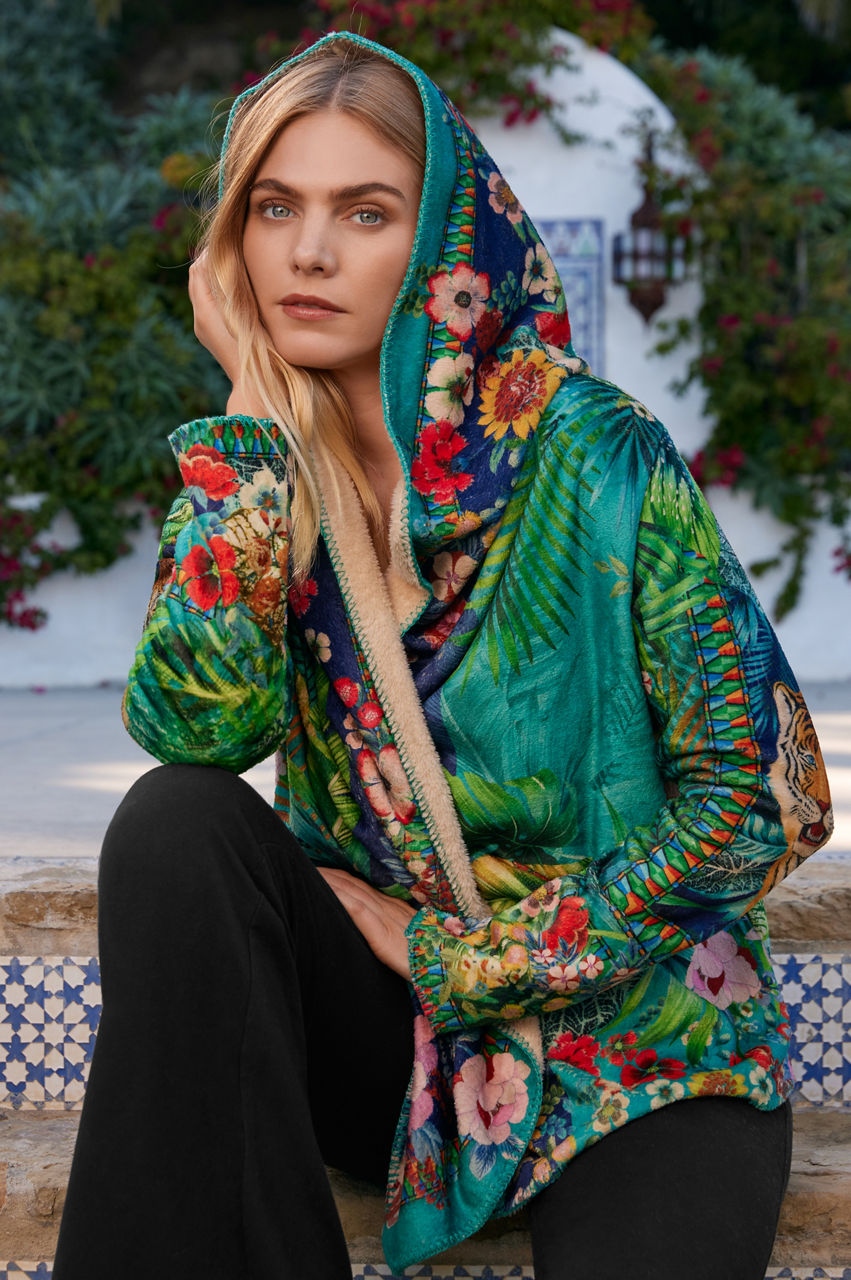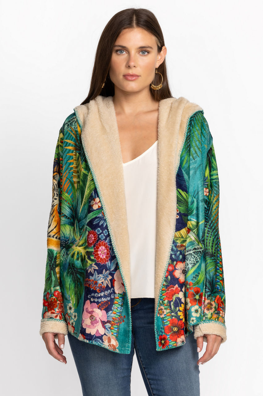 A bold statement-making style, the Tigres Sherpa Jacket comes to life through an eccentric color palette. Crafted from a soft sherpa material, this jacket features a hood, long sleeves, functional front pockets, and a tropical pattern. Layer this jacket over a cozy knit on cooler days or pair with a tee and a maxi skirt during the transeasonal months.