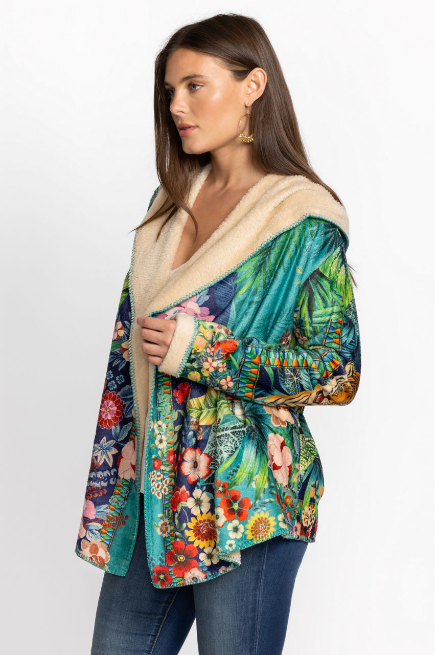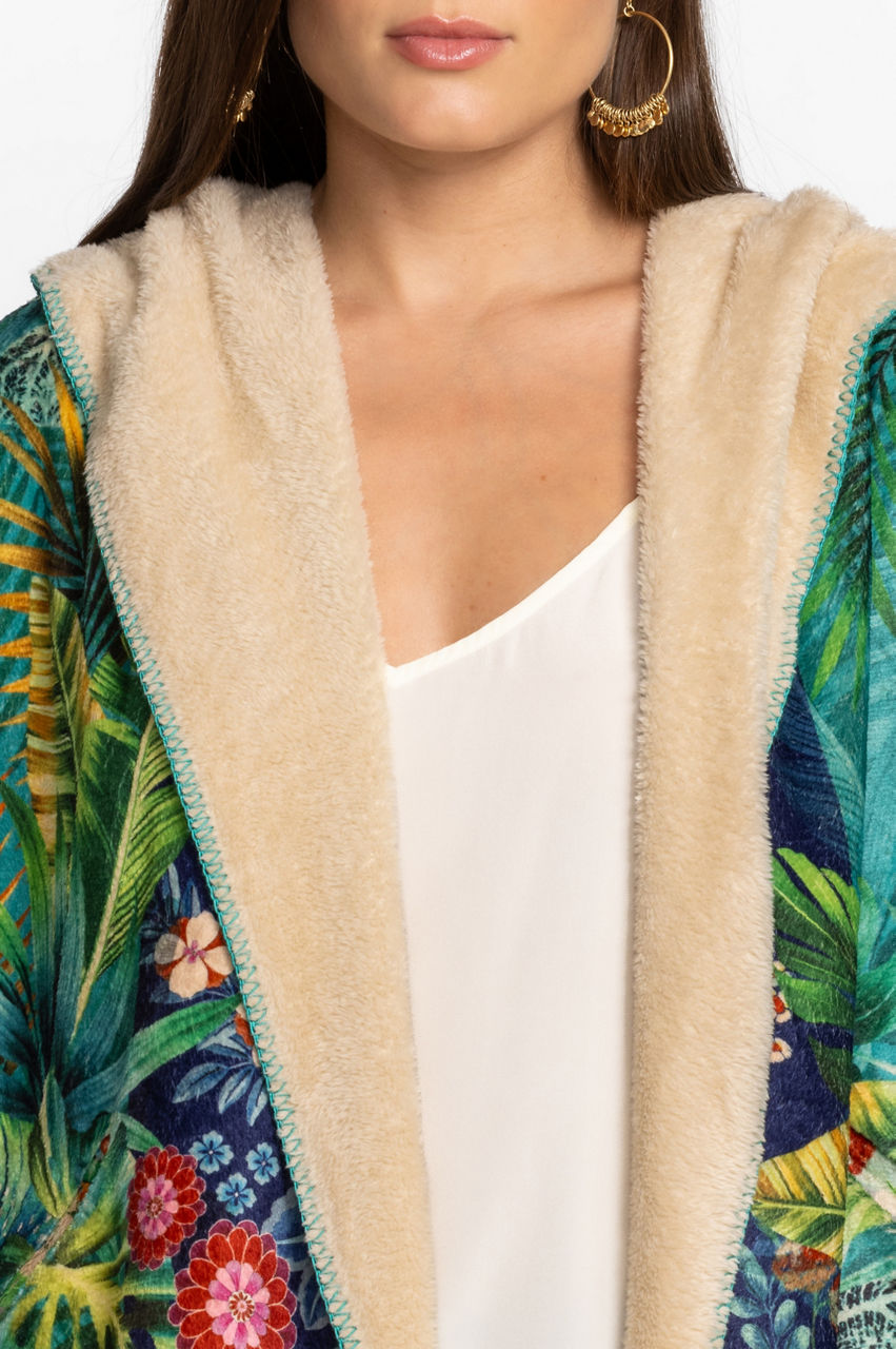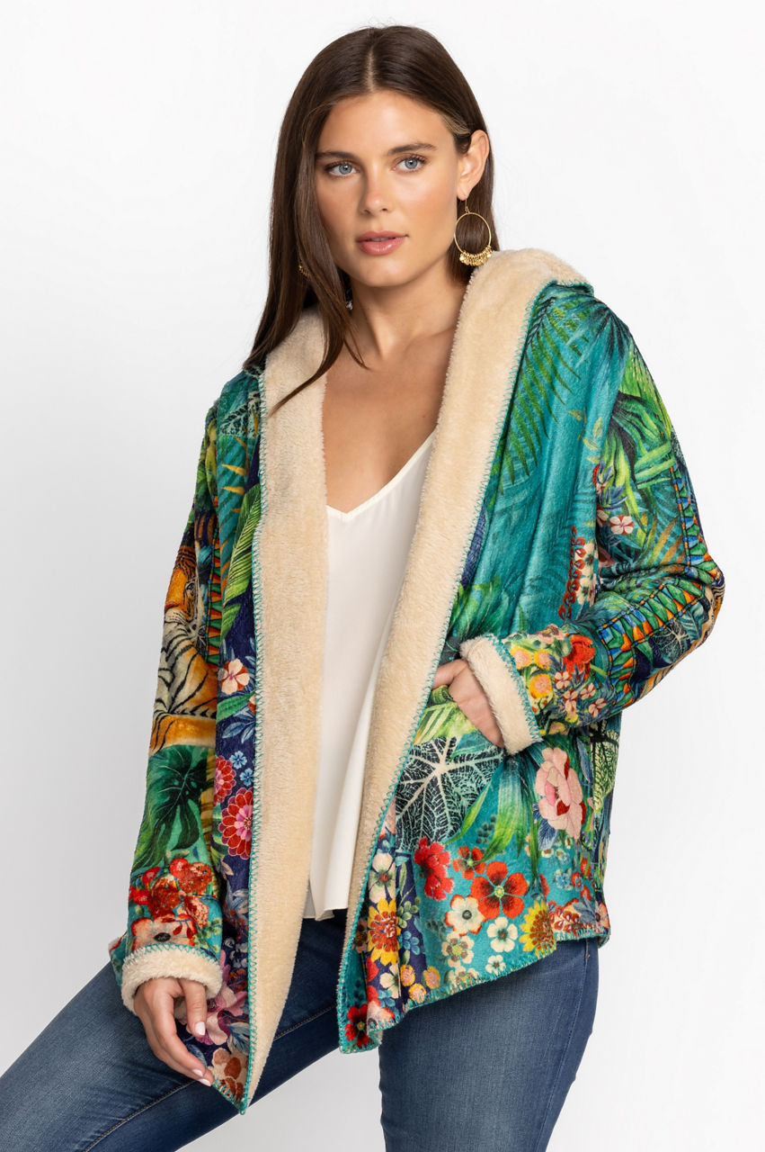 A bold statement-making style, the Tigres Sherpa Jacket comes to life through an eccentric color palette. Crafted from a soft sherpa material, this jacket features a hood, long sleeves, functional front pockets, and a tropical pattern. Layer this jacket over a cozy knit on cooler days or pair with a tee and a maxi skirt during the transeasonal months.