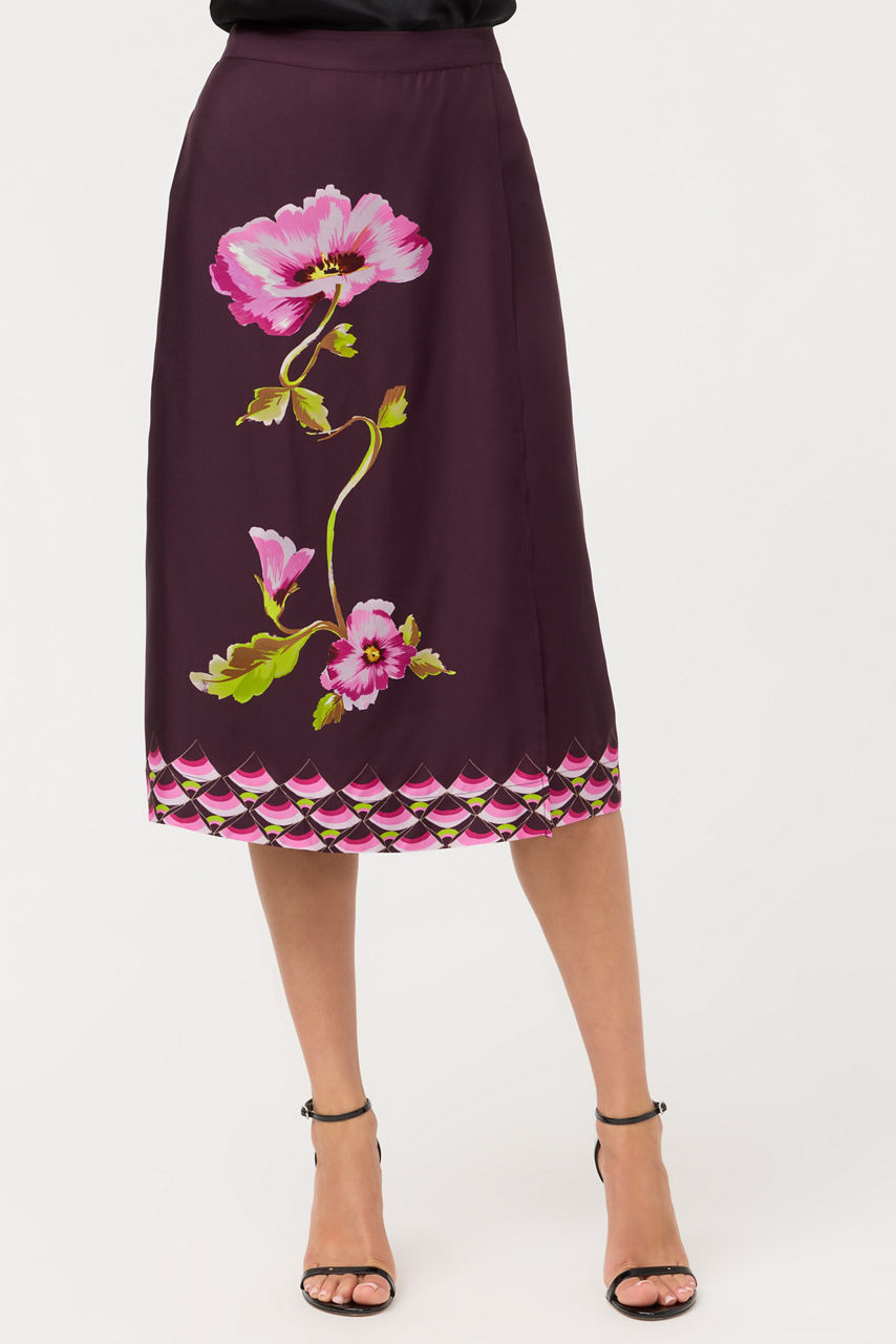 Beautifully crafted from a rich silk blend, the Tilli Faux Wrap Midi Skirt is embellished with a bold floral print. Featuring an elastic back and a faux wrap front, this midi length skirt is finished with a contrasting print at the hemline. Pair with the Normandie Blouse and delicate jewelry pieces for an evening out.