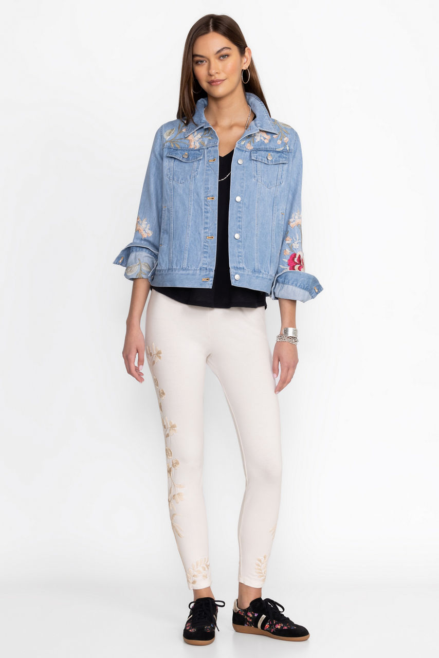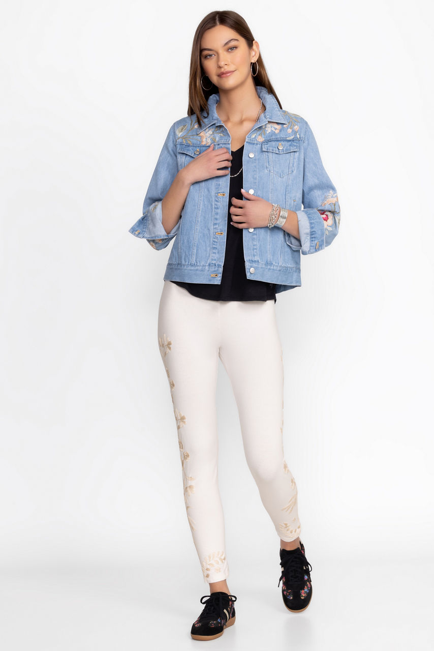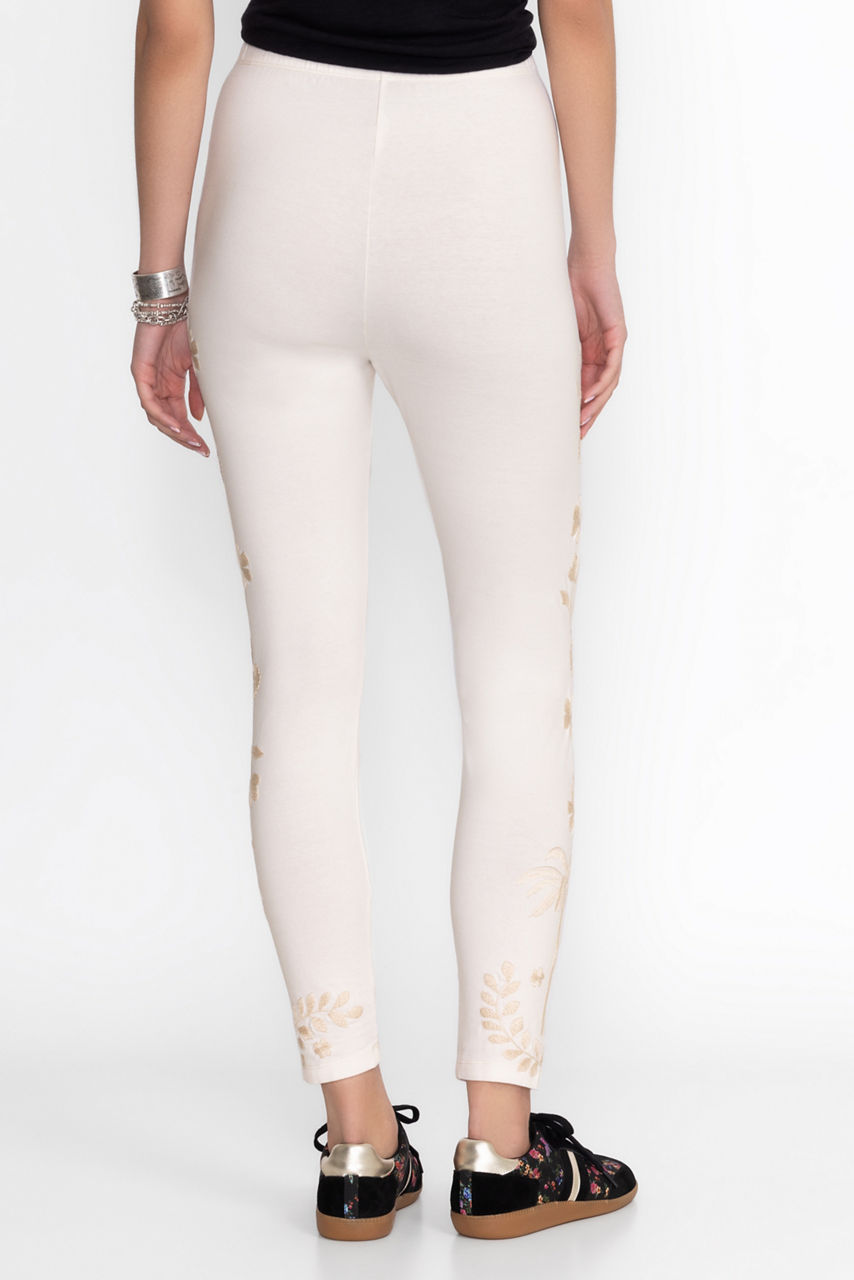 Crafted from a lightweight fabric with a hint of stretch, the Cassia Tonal Leggings are washed in a deep black color. Featuring an elastic waist and a fitted silhouette, these leggings are accented with intricate tone-on-tone embroidery at the leg line. Pair with a tunic top and leather flats for an elevated casual style.