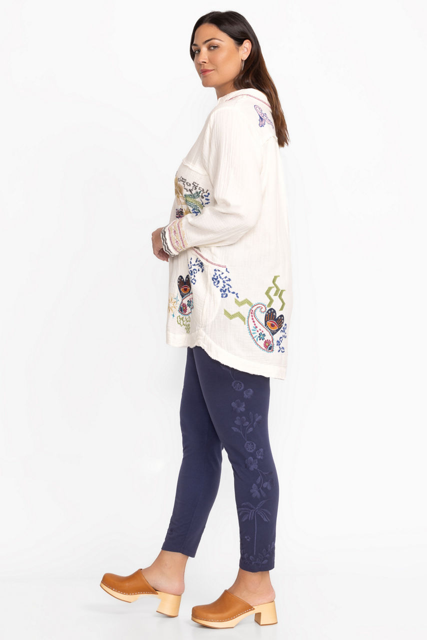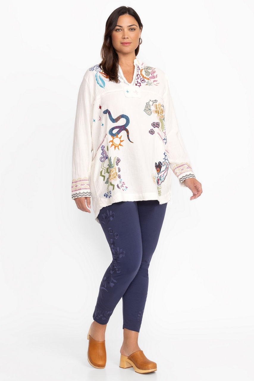 Crafted from a cotton blend with a hint of stretch, the Cassia Tonal Leggings combine fashion and functionality. Featuring an elastic waist and a fitted silhouette, these unique leggings are finished with intricate tone-on-tone floral embroidery at the leg line. Pair with a relaxed fit tee and athletic sneakers for a day at the gym.