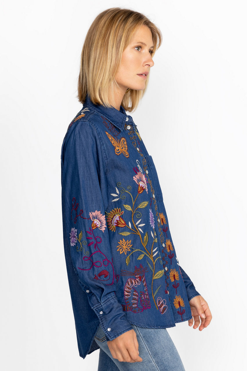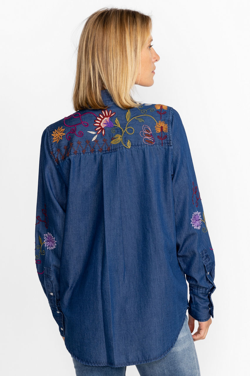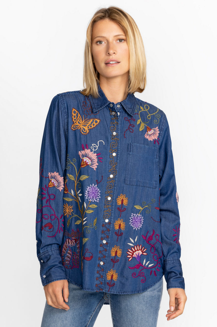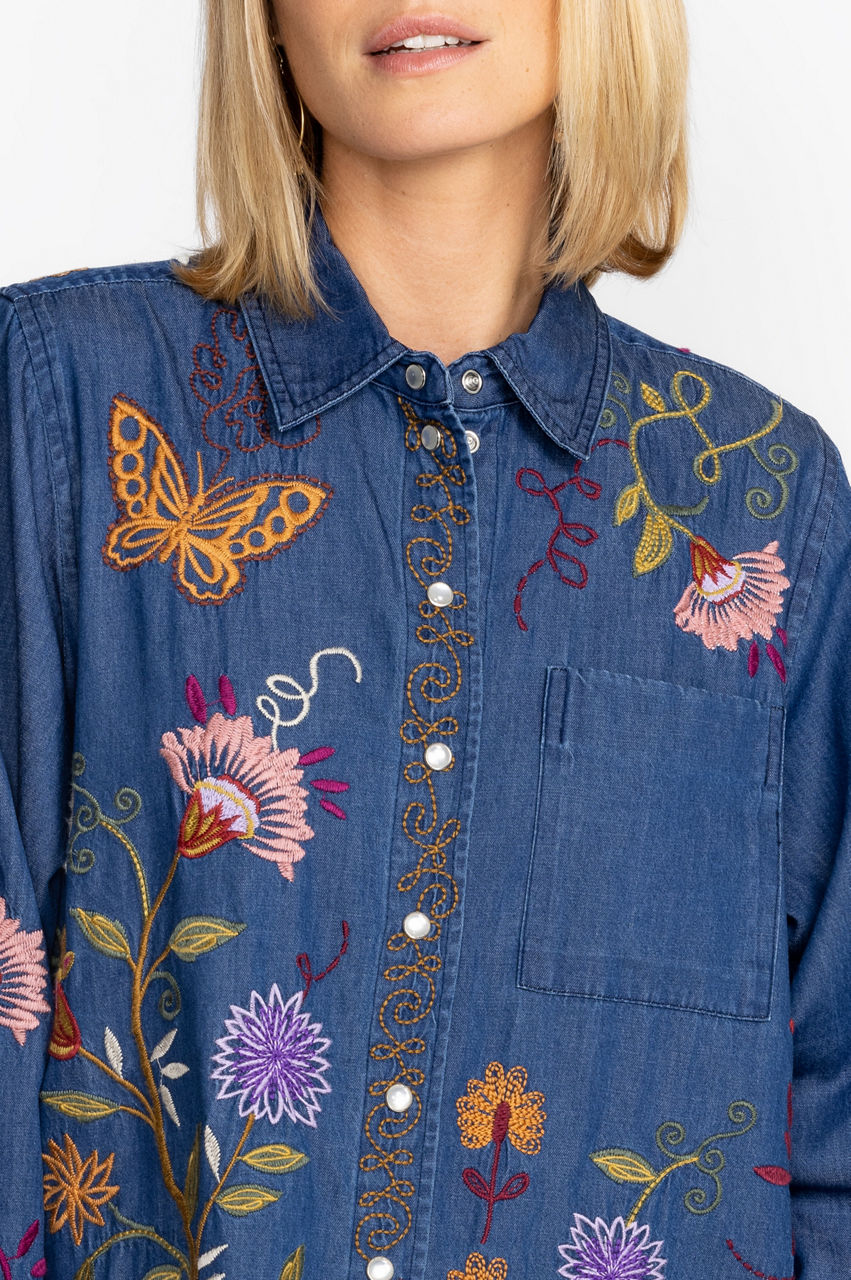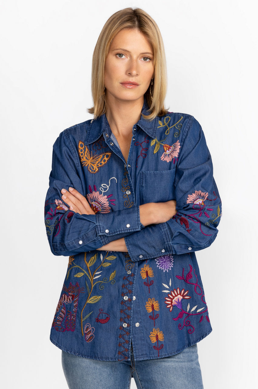 Denim is a tried-and-true casual staple, and the Toni Relaxed Denim Pocket Shirt is no exception. Crafted from 100% cotton and adorned with the colorful placement embroidery, this blouse features unique pearl snap buttons reminiscent of another time. Pair with bold pants and a simple tee for a memorable casual look.