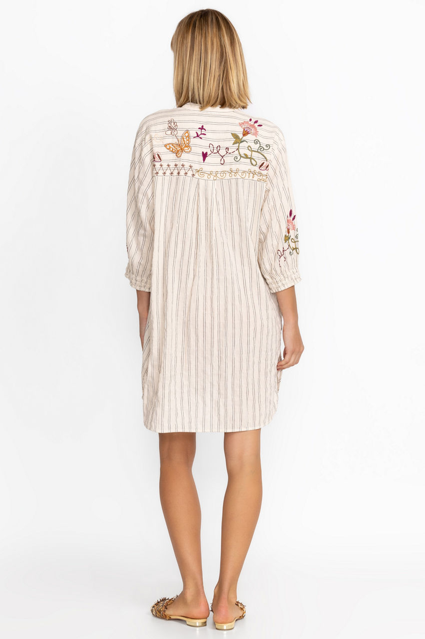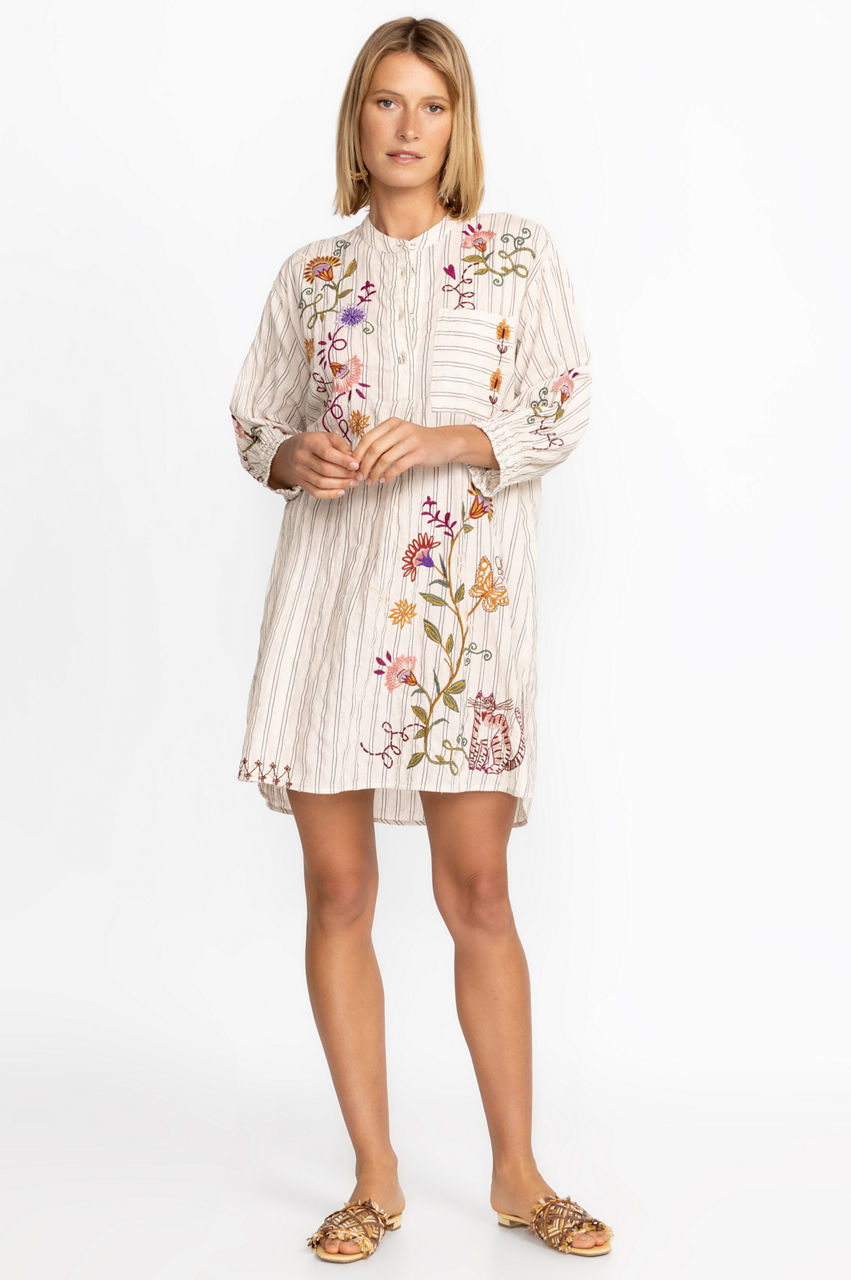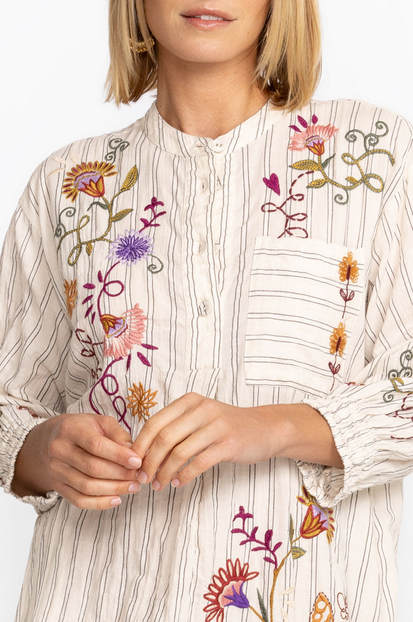 Channel your inner artist in the Toni Smocked Cuff Tunic as you soak up the season and all its beauty. Crafted from a breathable cotton blend and thoughtfully adorned with traces of floral embroidery, this relaxed top allows for ease of movement and elevated style. Pair with skinny jeans and ballet flats for a covetable casual look.