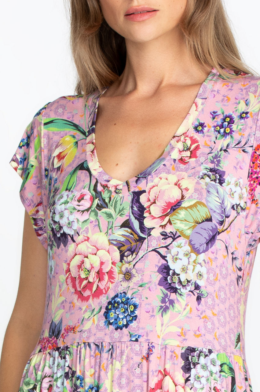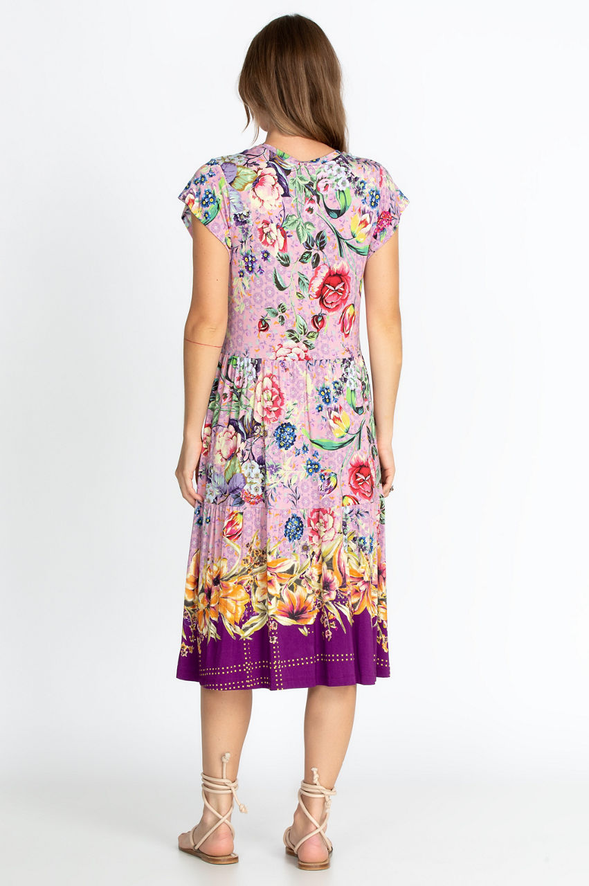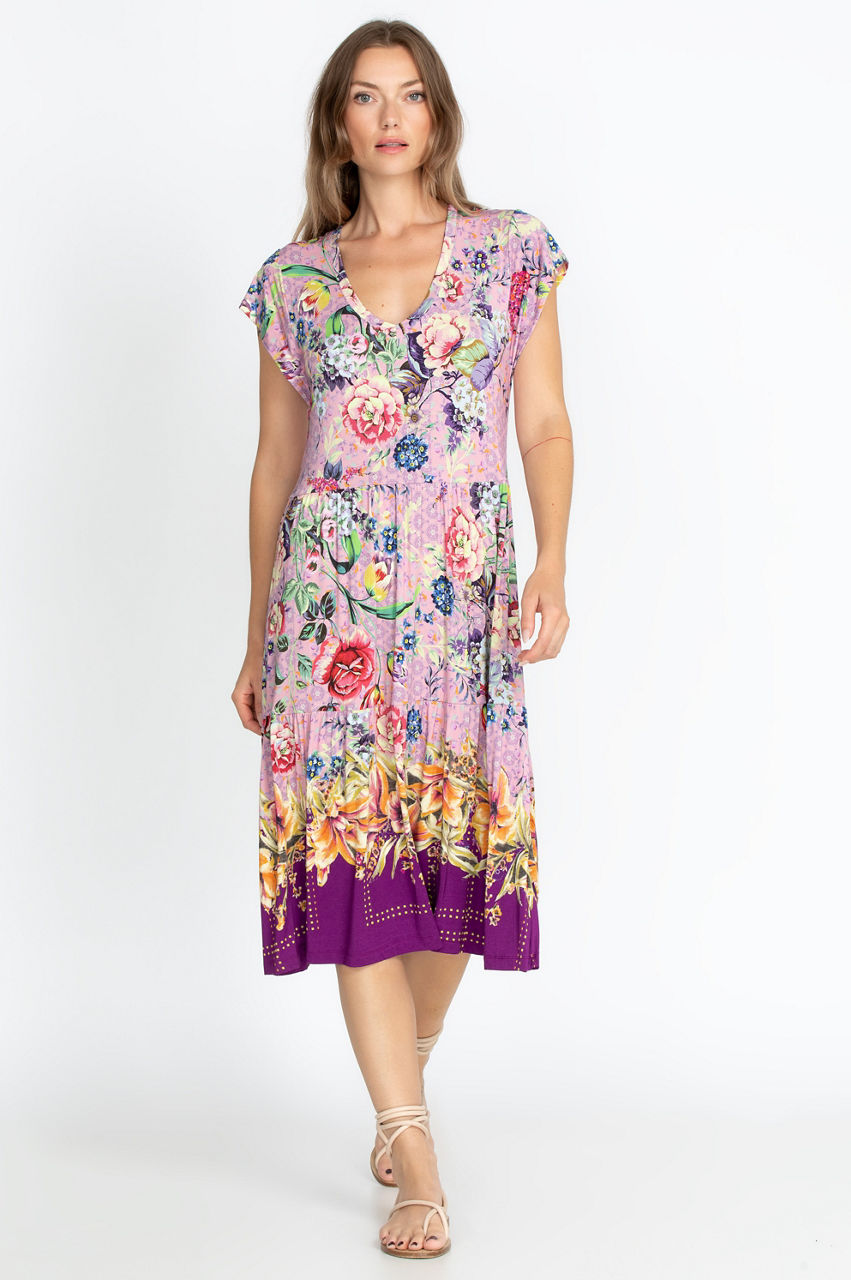 This tea-length dress will create plenty of movement with its flattering tiered design. The classic fit allows the gorgeous colors and floral motifs to take the center stage for a vibrant result. It s a versatile piece you can layer under a jean jacket for a modern look or accessorize with a belt to emphasize your silhouette.
