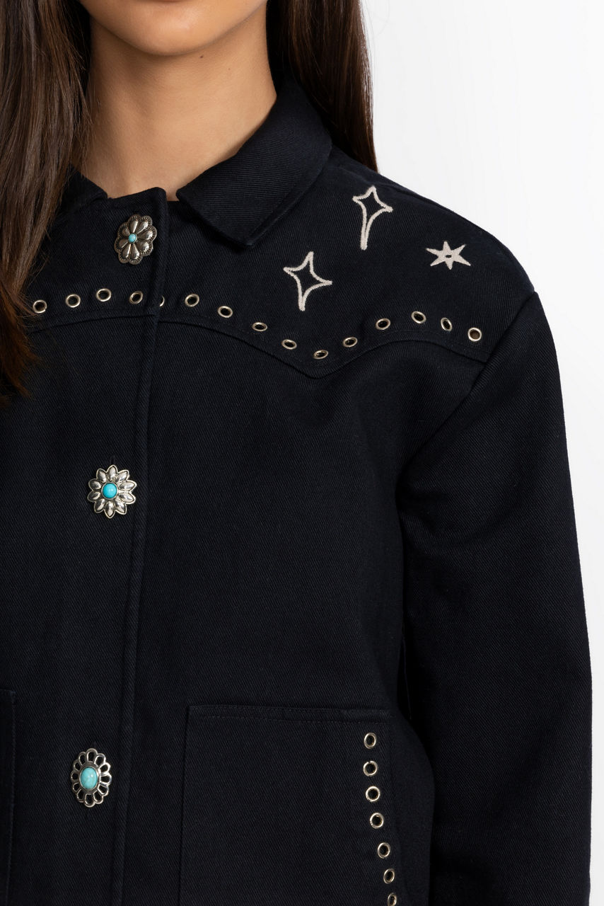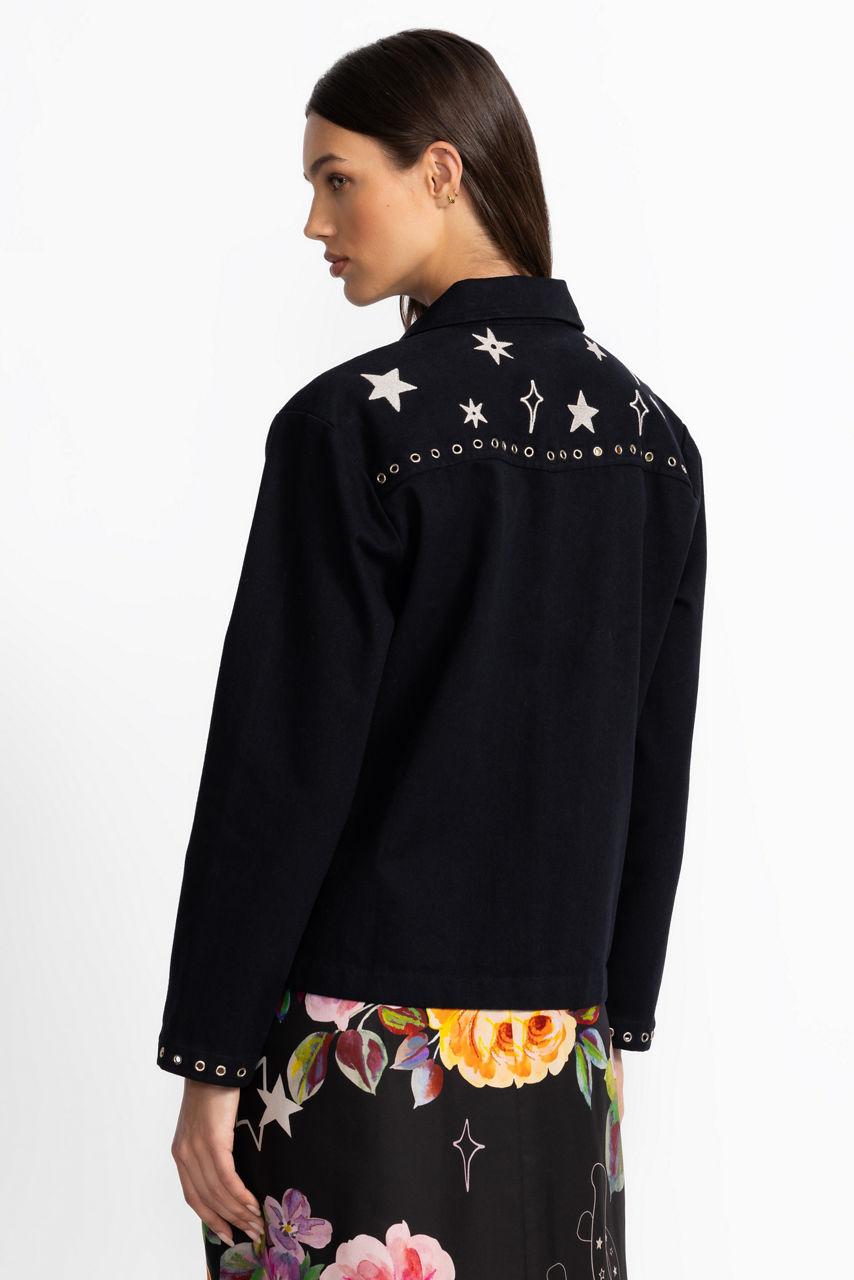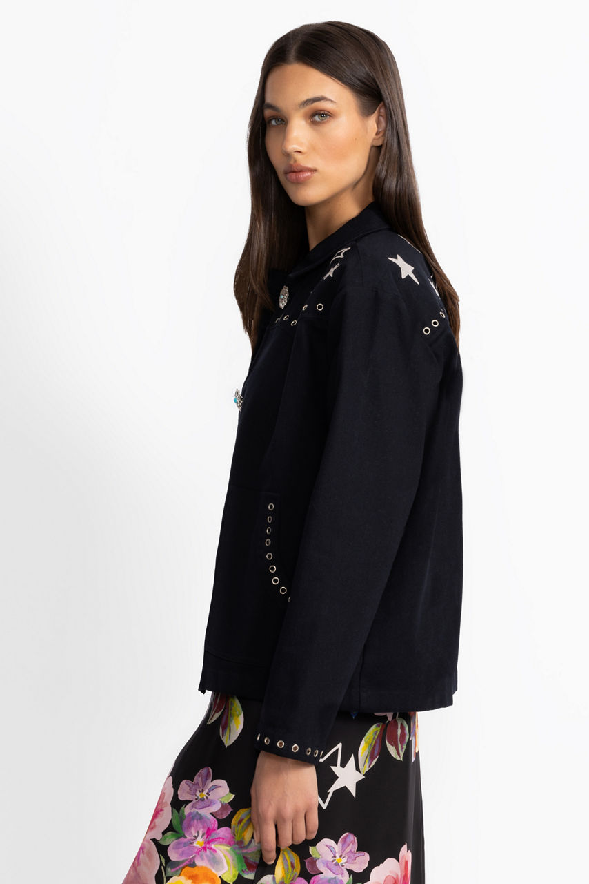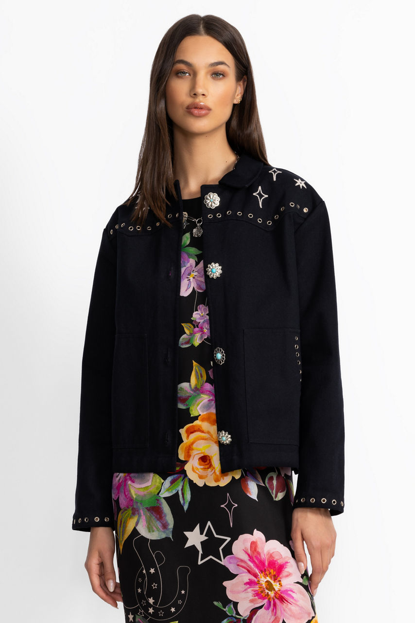 Perfectly combining rugged texture and soft accents, the Tory Jacket is a versatile layering piece. Crafted from 100% breathable cotton, this unique jacket features decorative grommets and intricate embroidered details and is finished with slip pockets and whimsical floral buttons. Layer over a classic tee and pair with linen pants for a timeless look.