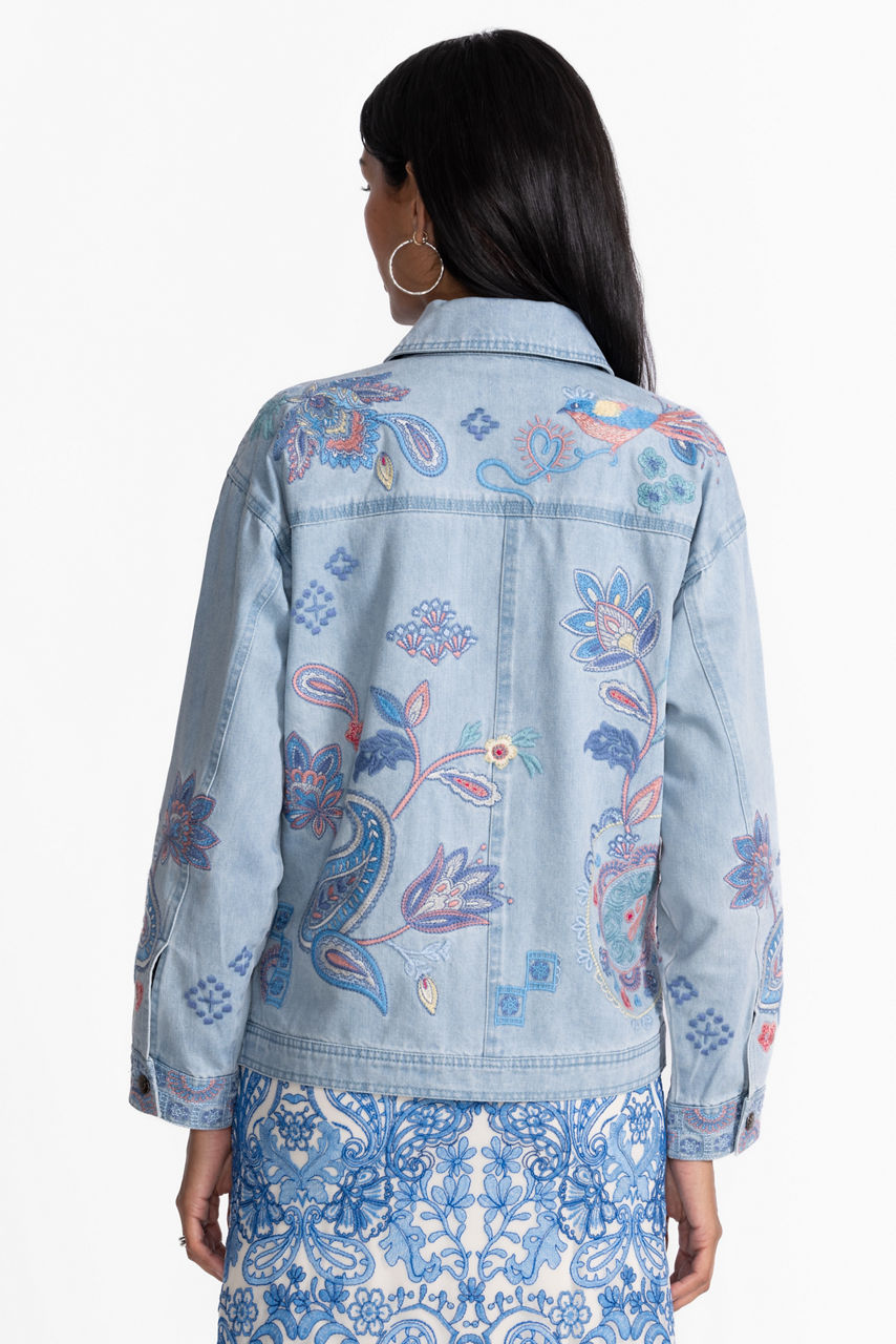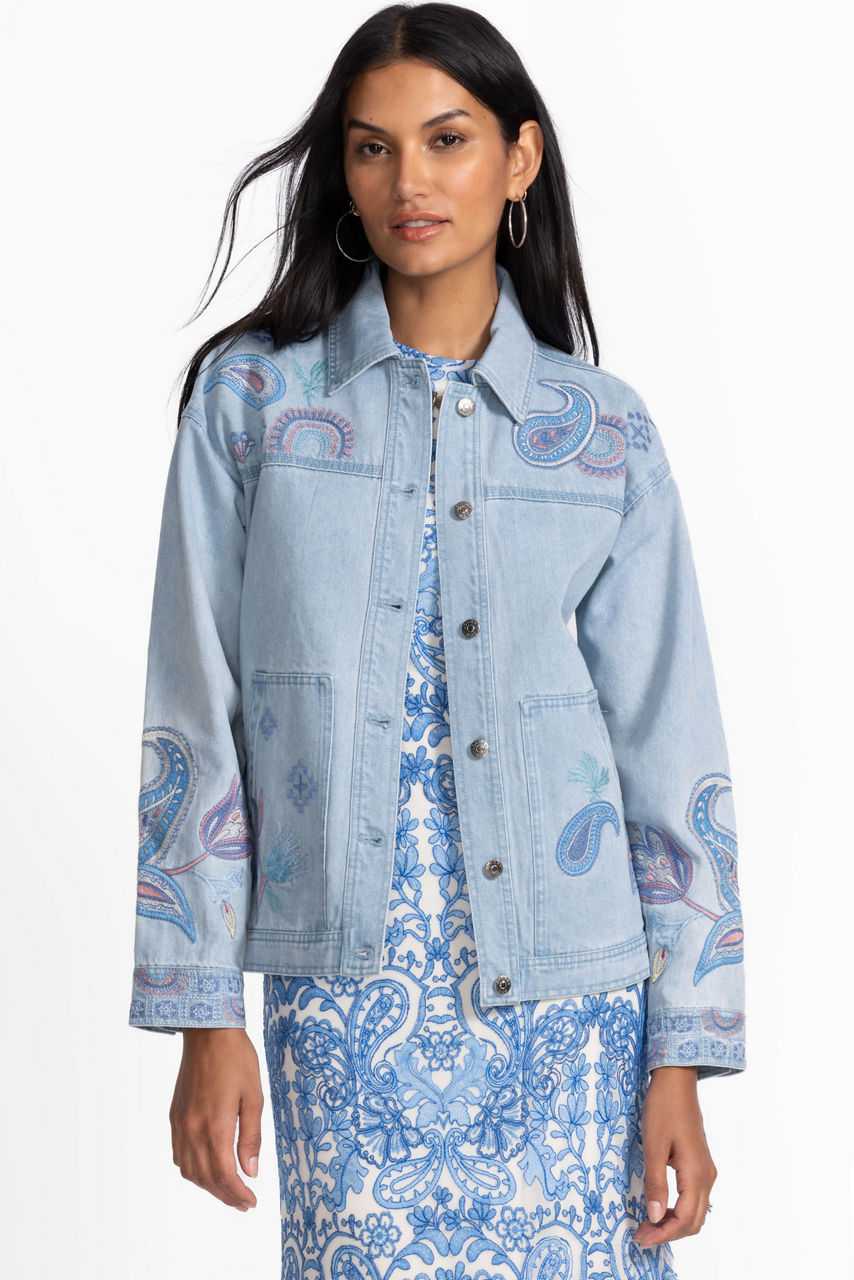 Crafted from 100% cotton denim, the Neilly Trapunto Denim Chore Jacket is the perfect outer layer to finish any casual look. Featuring a collared button-front closure and large front slip pockets, this unique jacket is finished with colorful floral and paisley embellishments. Layer over a cozy pullover paired with casual pants for a casual daily look.