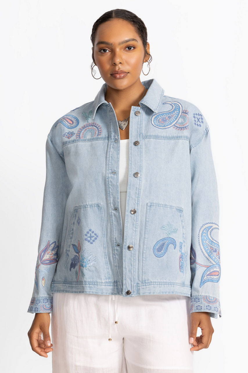 Crafted from 100% cotton denim, the Neilly Trapunto Denim Chore Jacket is the perfect outer layer to finish any casual look. Featuring a collared button-front closure and large front slip pockets, this unique jacket is finished with colorful floral and paisley embellishments. Layer over a cozy pullover paired with casual pants for a casual daily look.