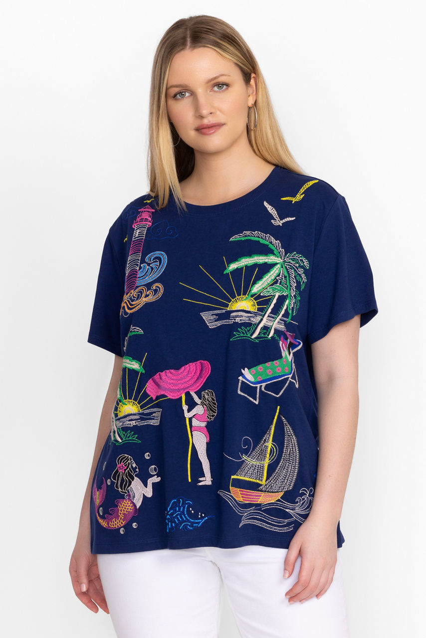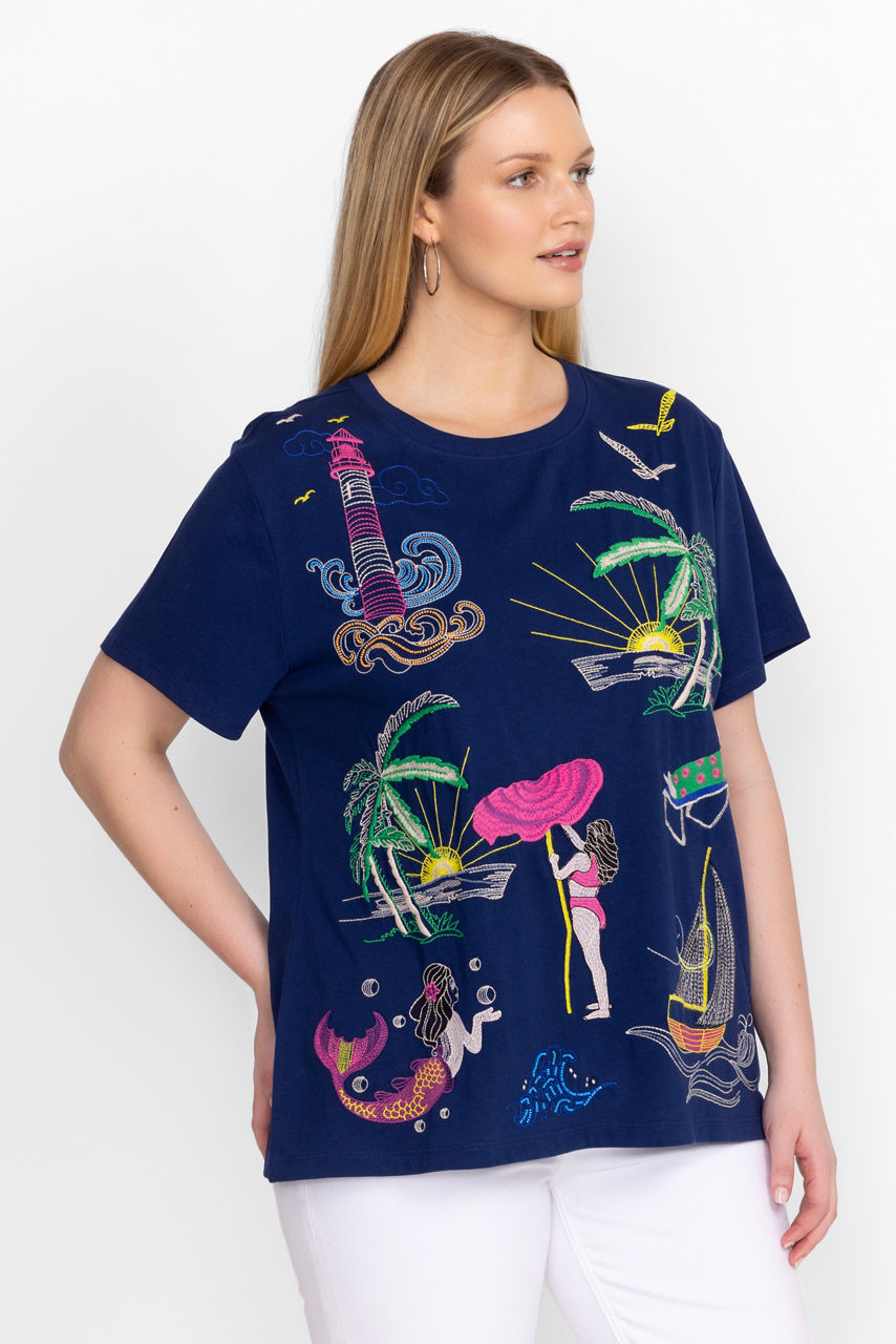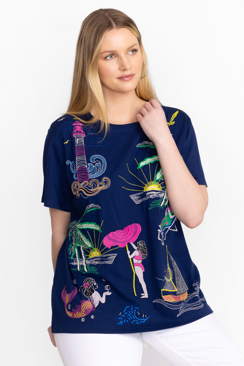 Crafted from 100% breathable cotton, the Travel Crew Neck Tee is adorned with vibrant color and pattern. Featuring a crew neckline and short sleeves, this relaxed fit tee is embellished with bold placement embroidery for a splash of color. Pair with an easy jogger and fashion sneakers for a relaxed travel look that is perfect for a day navigating to a vacation destination.