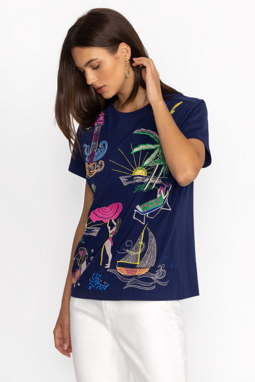 Crafted from 100% breathable cotton, the Travel Crew Neck Tee is adorned with vibrant color and pattern. Featuring a crew neckline and short sleeves, this relaxed fit tee is embellished with bold placement embroidery for a splash of color. Pair with an easy jogger and fashion sneakers for a relaxed travel look that is perfect for a day navigating to a vacation destination.