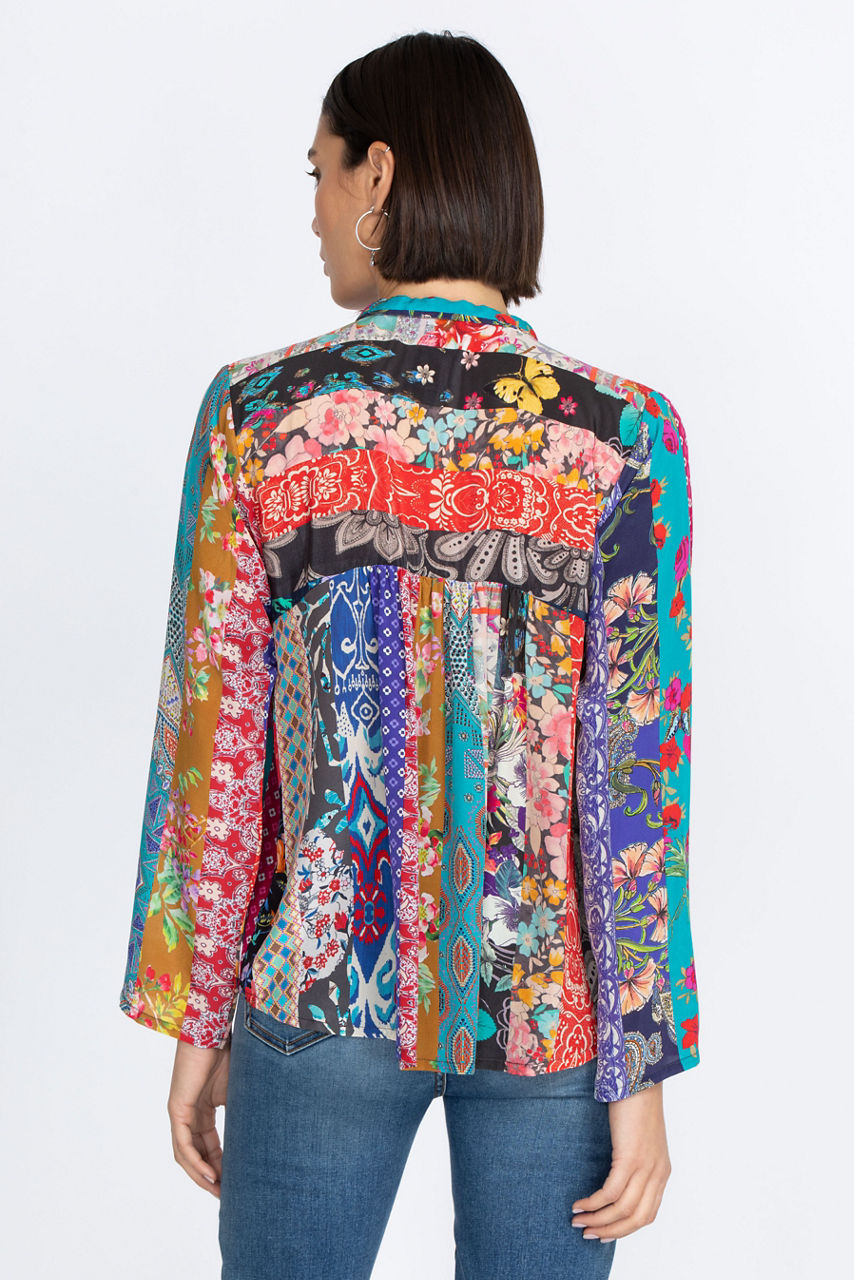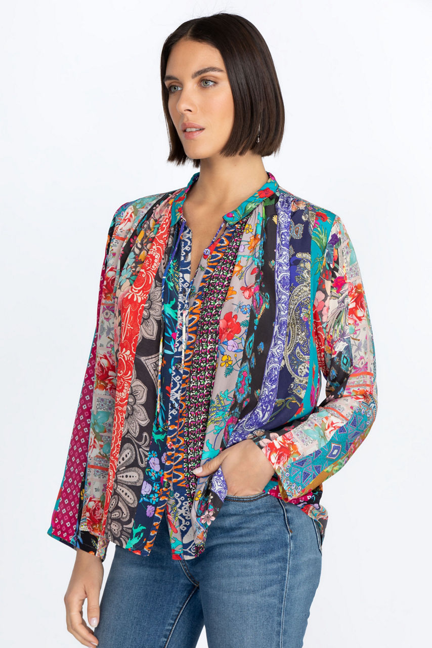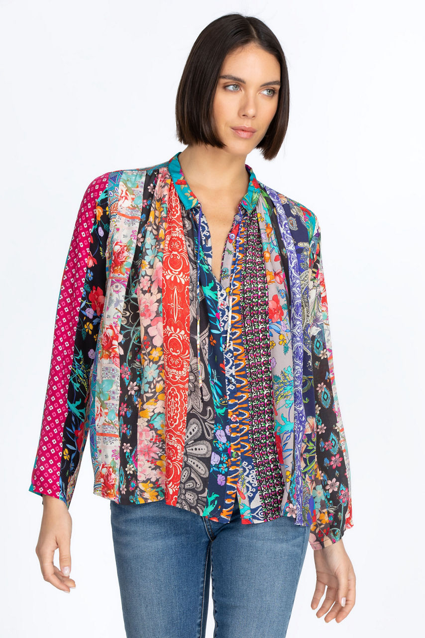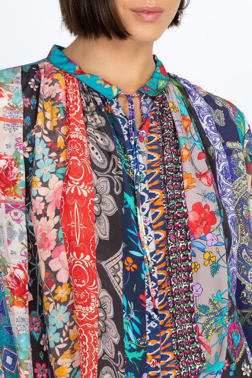 The Treble Sofia Button Up Blouse is imbued with a bohemian aesthetic, evoking a subtle feeling of nostalgia. Spun from pure silk, this breezy blouse plays with pattern and features a striped design throughout, complete with mixed floral motifs. Finished with long sleeves, the blouse can be styled with pants or shorts on sun-filled days.