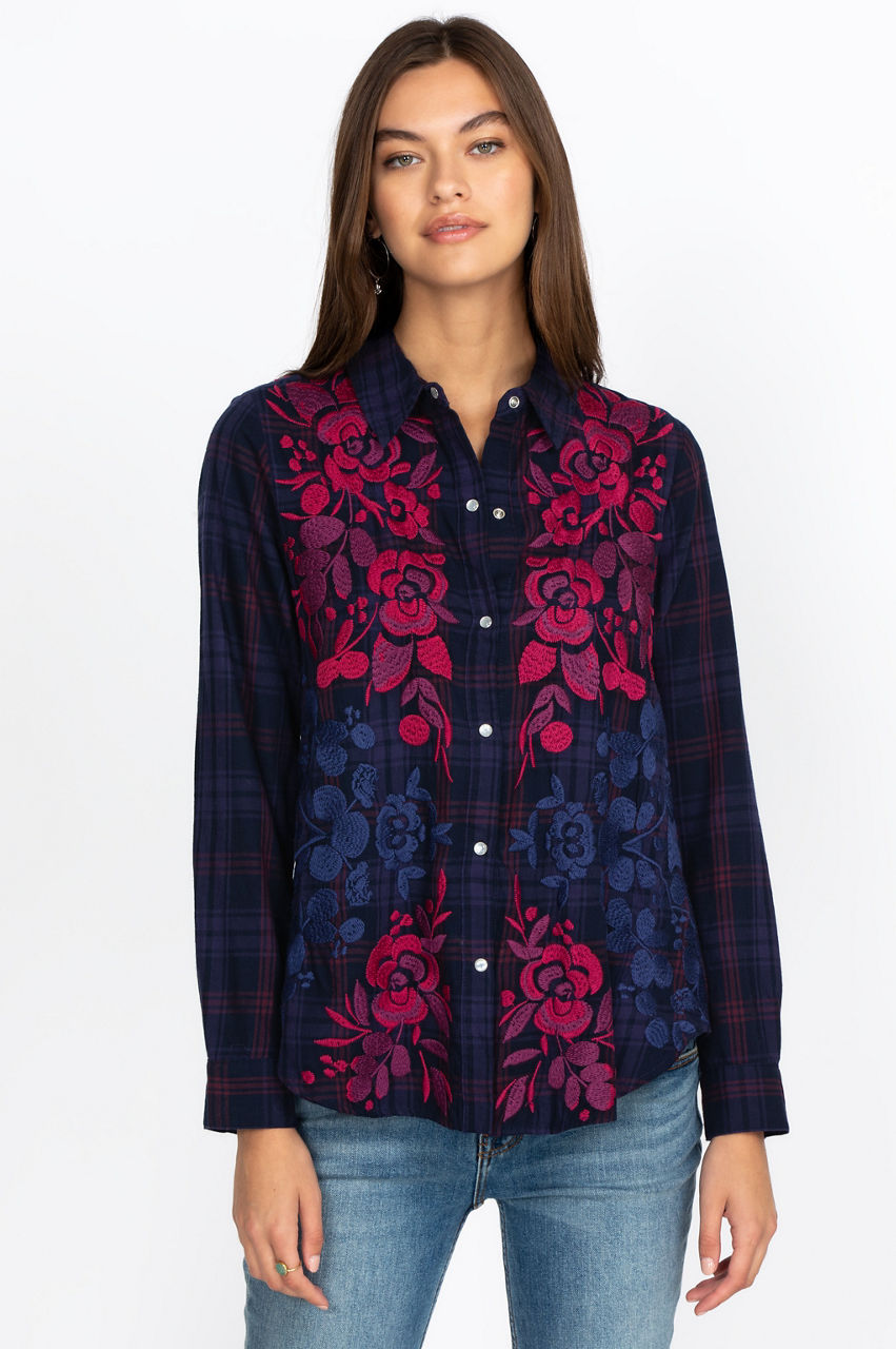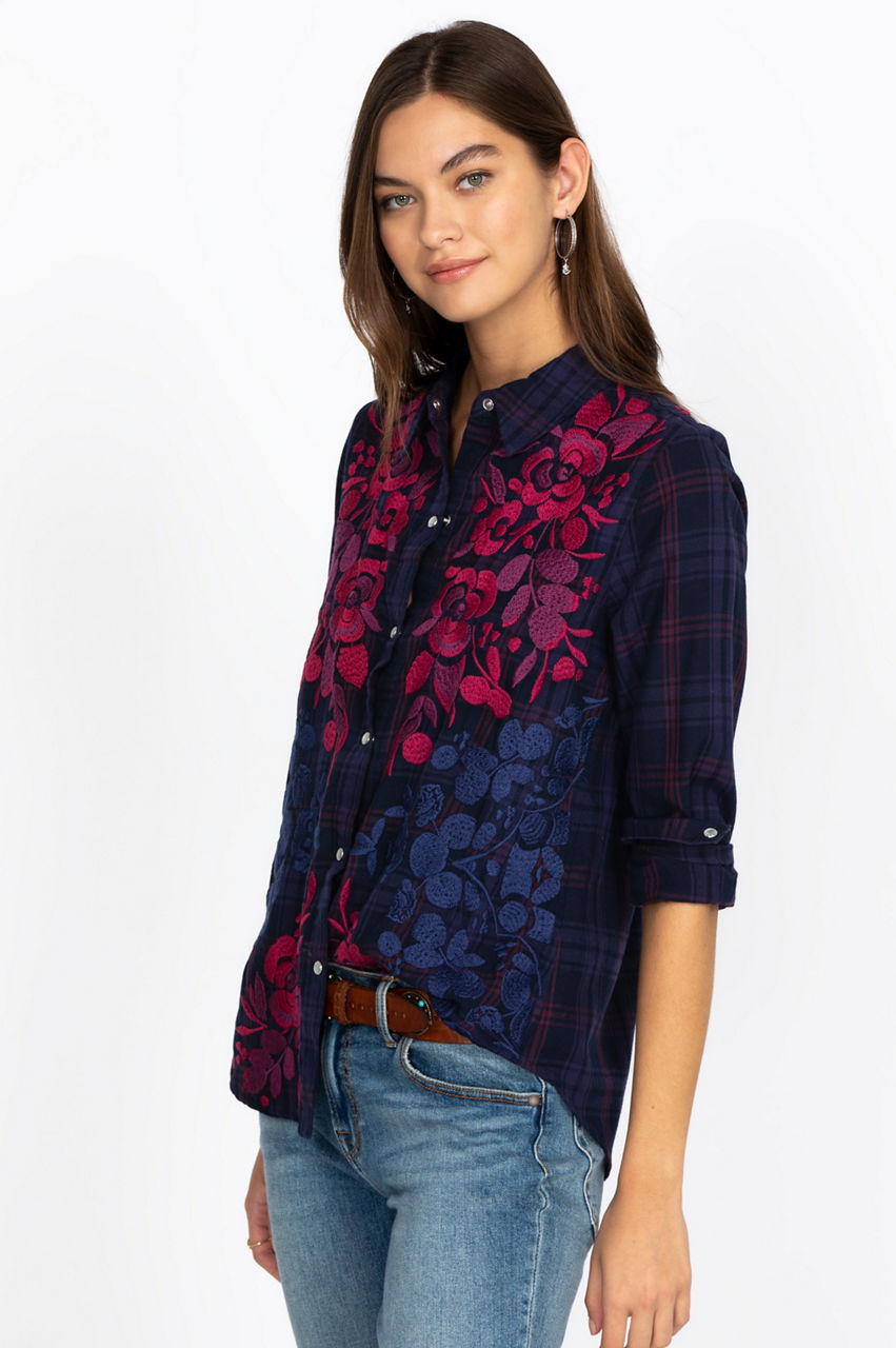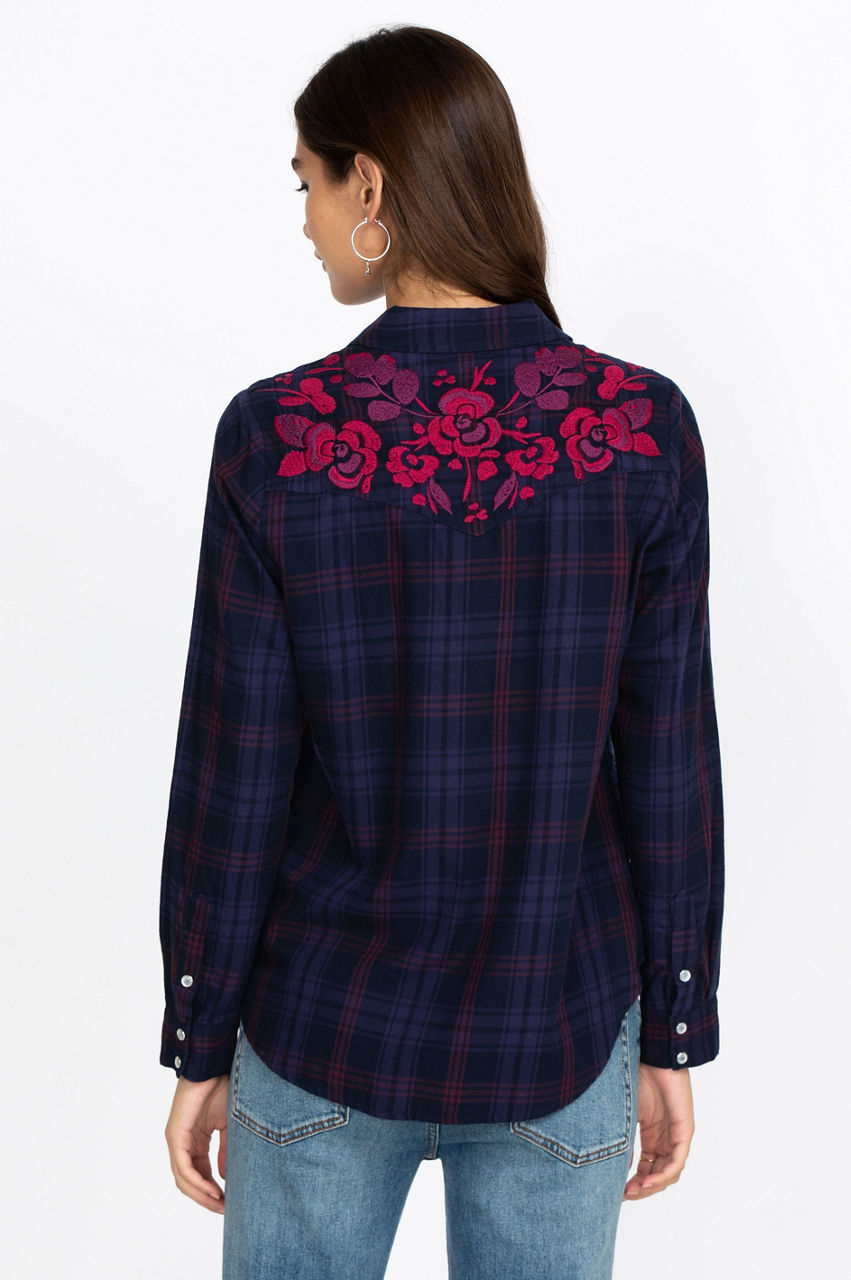 This laidback plaid shirt is a wardrobe essential with its soft fabric, timeless print, and flattering fit. The embroidery details add a touch of originality to the classic plaid shirt design while introducing some colors. Tuck this versatile shirt into some comfortable jeans and add some boots to complete the look.