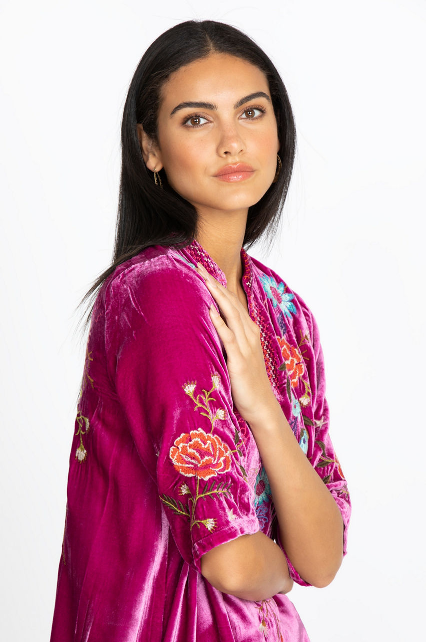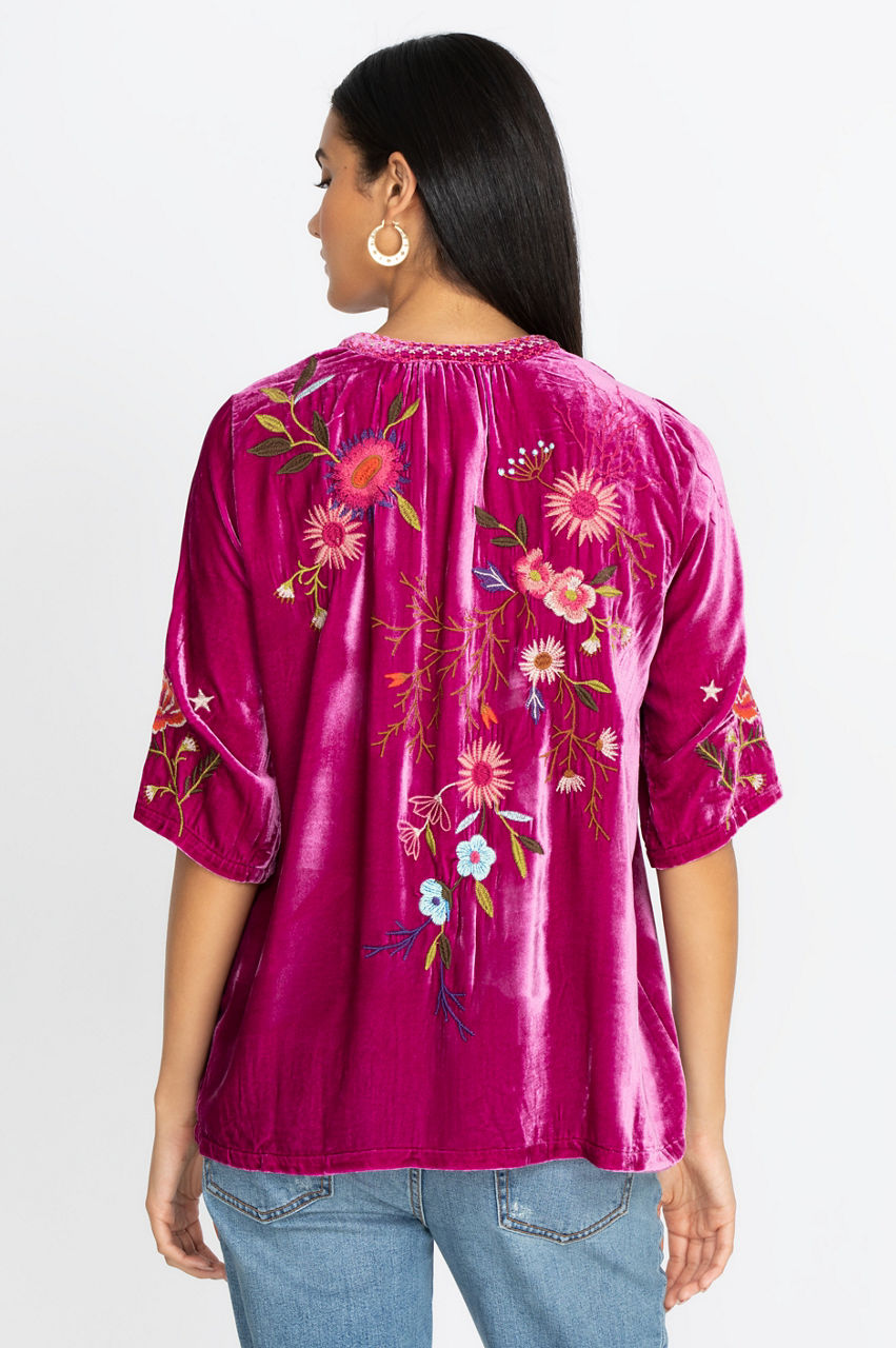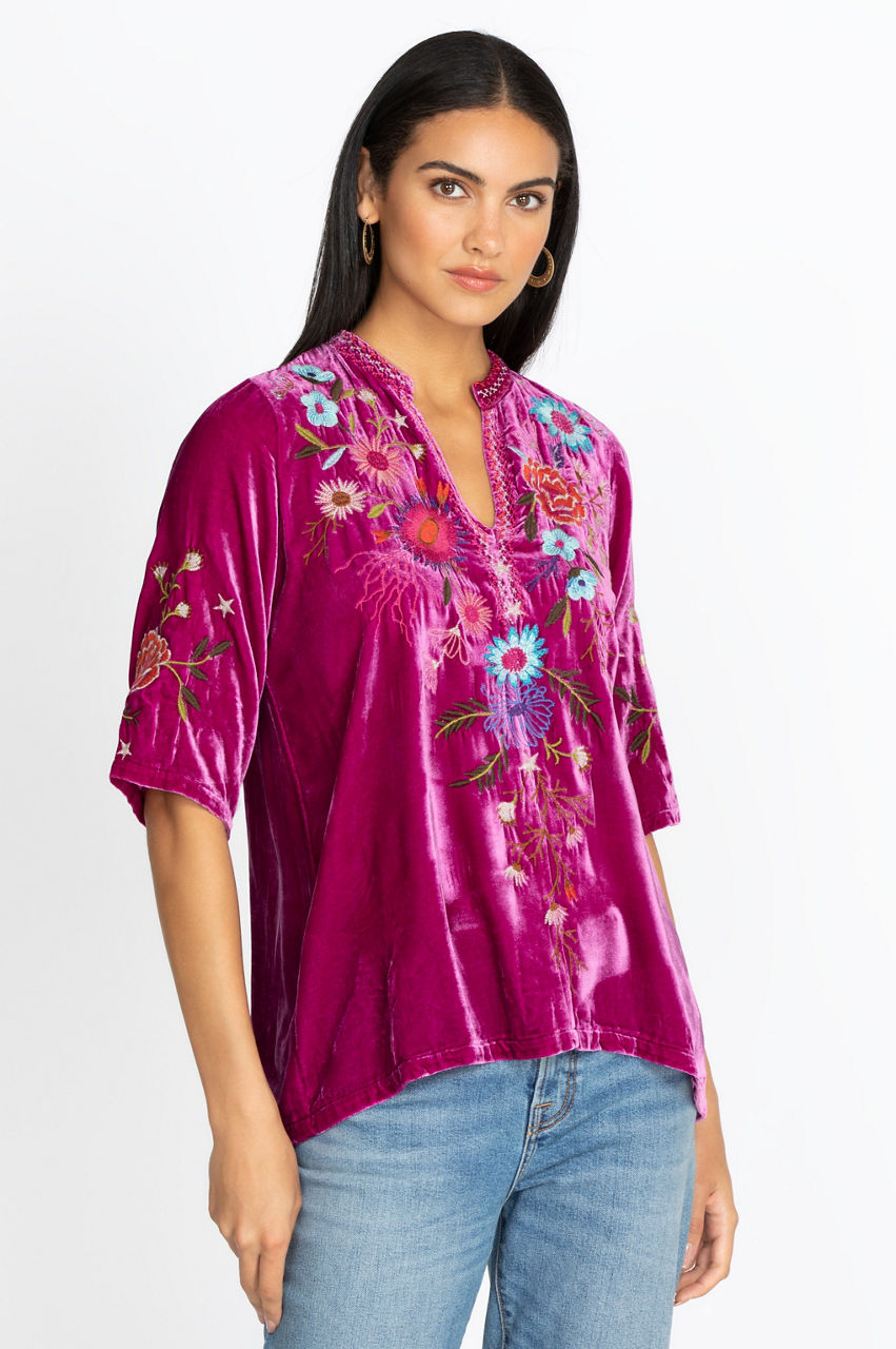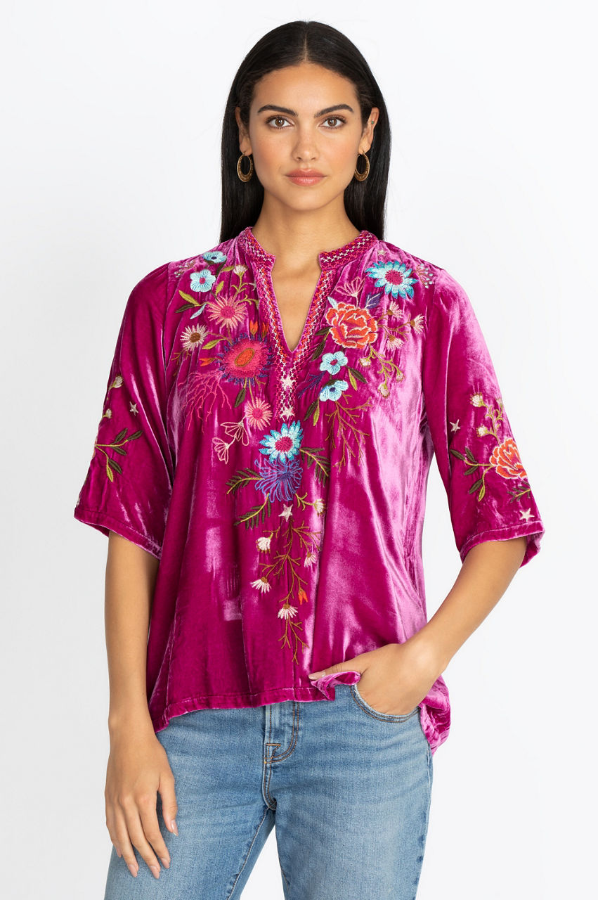 Show off your uniquely stunning style with our Ulla Velvet Easy V-Neck Top. This piece offers an oh-so-soft fabrication, an ultra-flowy design and impeccable embroidery to give you a wardrobe staple. Pair this top with your favorite skinny jeans and embroidered flats to make a fashion statement.