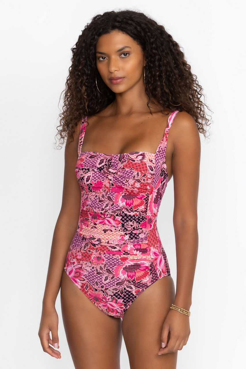 Adorned with vibrant blooms, the Valennis Ruched One Piece creates a distinctly feminine silhouette. Featuring a sweetheart neckline with wide adjustable straps, this unique swimsuit is finished with intricate ruching and the bust and front bodice for a rich textured appearance. Pair with the Valennis Ruffle Kimono and espadrilles for a look that is perfect for a poolside brunch.