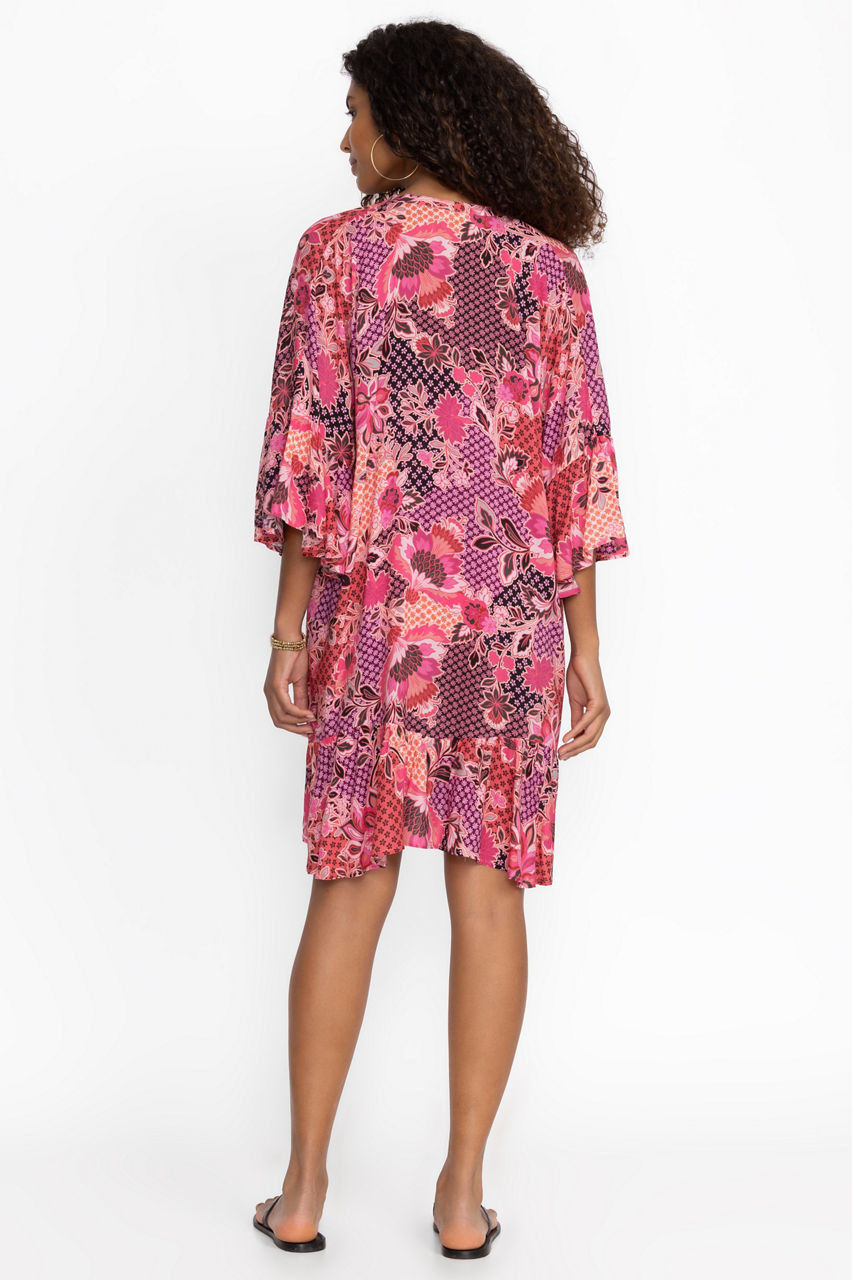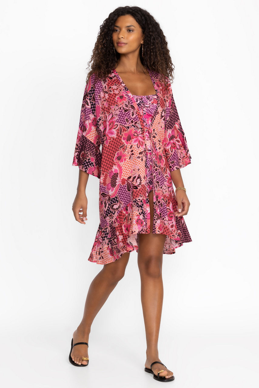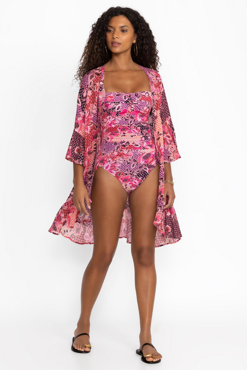 Beautifully adorned with vibrant blooms, the Valennis Ruffle Kimono adds a layer of sophistication to your poolside look. Featuring an open front and dropped shoulders, this midi-length kimono offers a tie closure and intricate ruffling at the sleeves and hemline. Layer over the Valennis Ruched One Piece and pair with espadrille wedges for a resort-ready look.