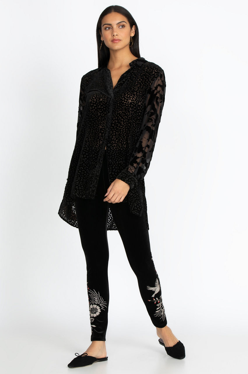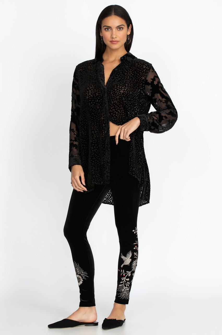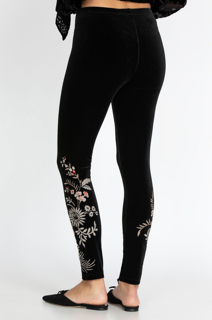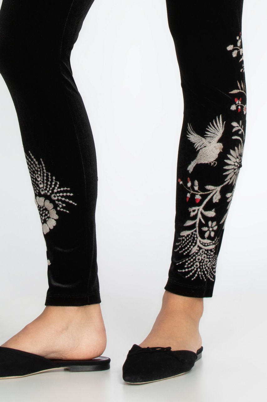 Our Valentina Cropped Velvet Kimono meets a perfect match with our Valentina Stretch Velvet Leggings. Gorgeous multi-colored embroidery of flowers, vines, and birds adorn our black leggings from knee to ankle. All that is required to complete this show-stopping look are a pair of black ballet flats.
