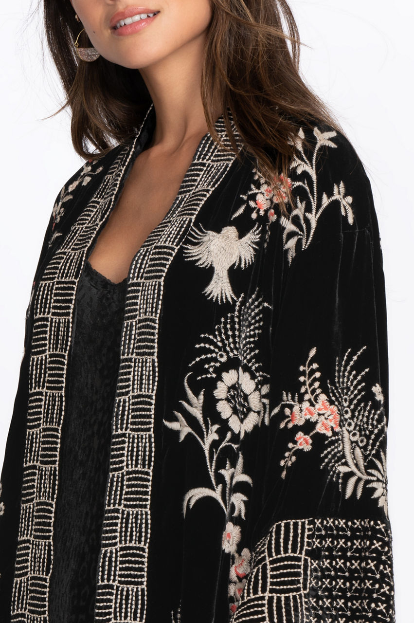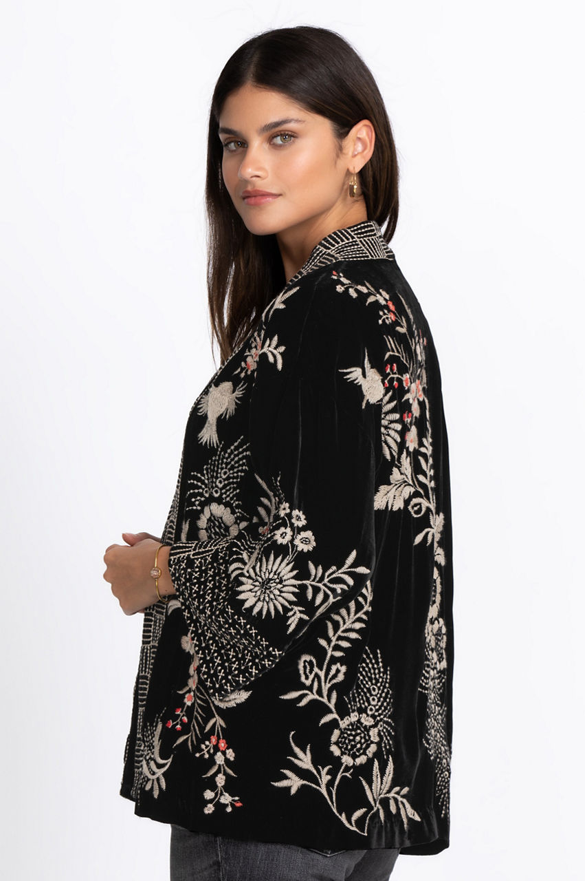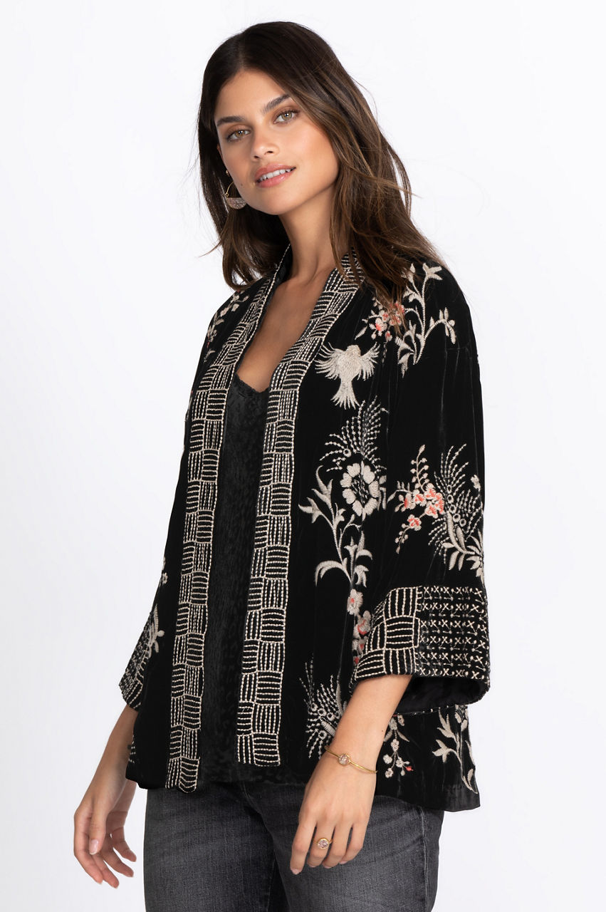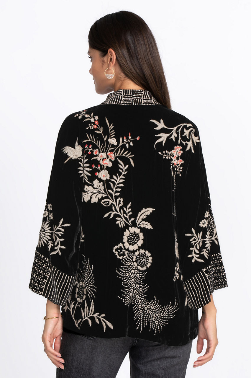 Make any day feel like a special occasion with our Valentina Cropped Velvet Kimono. The rich, black velvet embraces you with its warmth from your neck to your waist. Colorful embroidery decorates the front and the tops of the sleeves, giving you the option of donning a black tee for a dressy look or a colorful tee for more casual events. For an evening look, pair it with velvet leggings and velvet flats. For a daytime look, switch to jeans and flat booties.