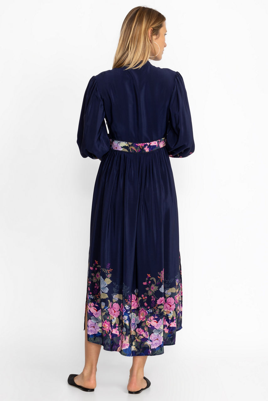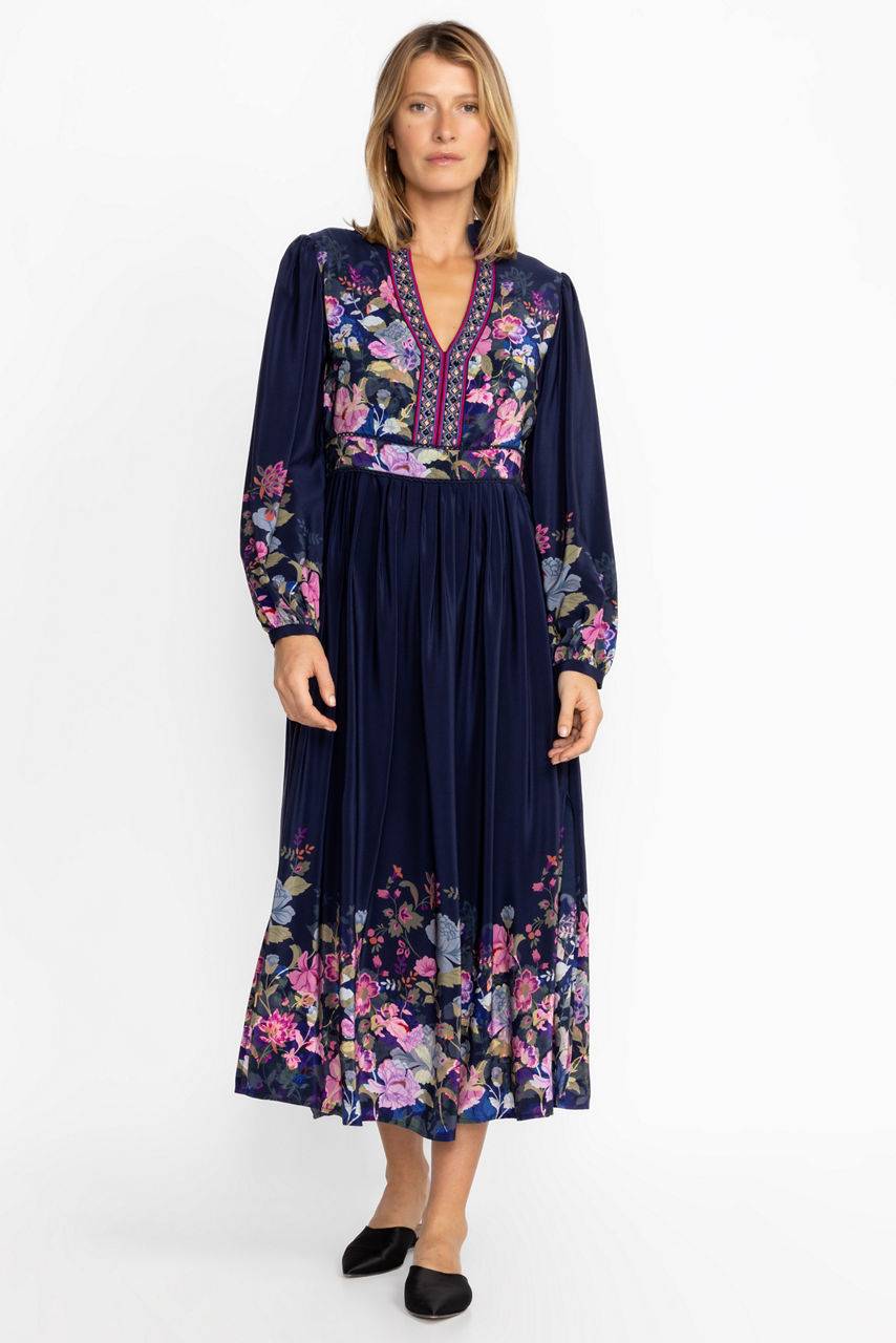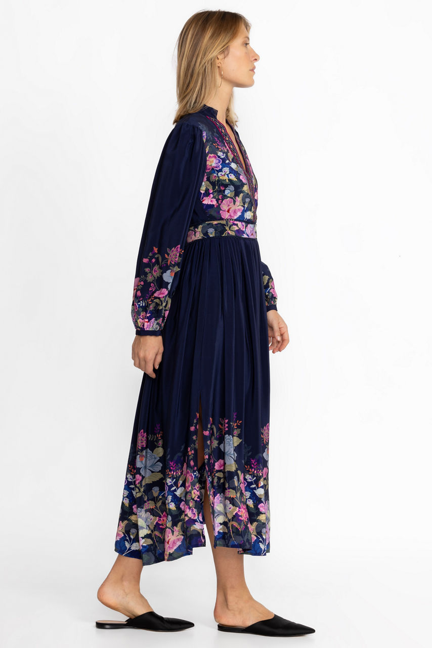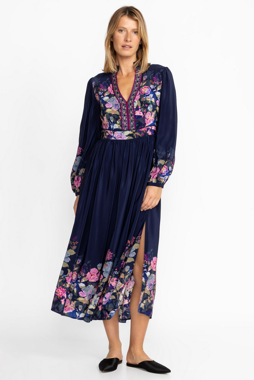 Crafted from 100% silk, the Valeria Silk Maxi Dress perfectly combines intricate detailing with polished casual wear. Featuring a unique embroidered trim at the neckline that leads to a Nehru collar this lovely dress offers an invisible zipper at the side as well as a classic empire silhouette. Pair with pointed flats for a versatile look.