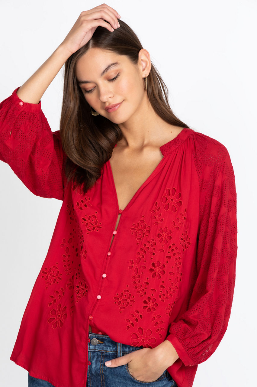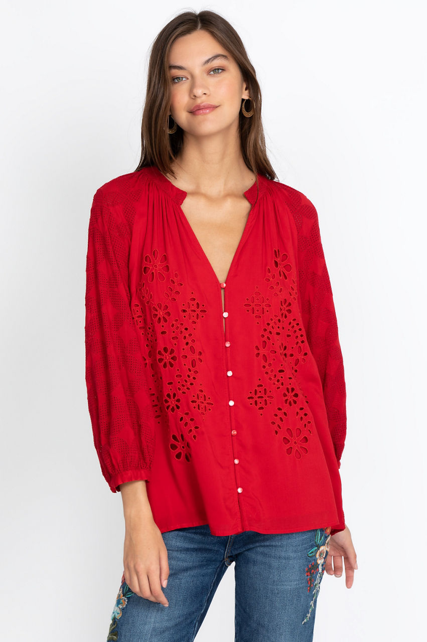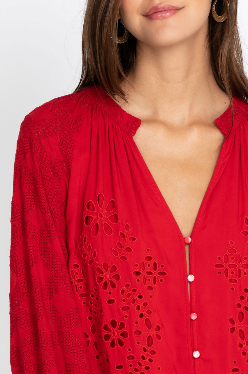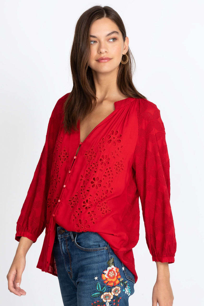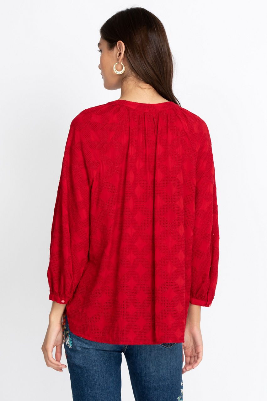 The artisan-inspired embroidery detail takes the center stage with this smart blouse. The V-neck construction, bishop sleeves, and flowy cut come together to create a fun boho-chic look. This flattering blouse is also a great way to add a pop of color to your outfits. Wear it with jeans and ankle boots for a stylish boho-inspired look.