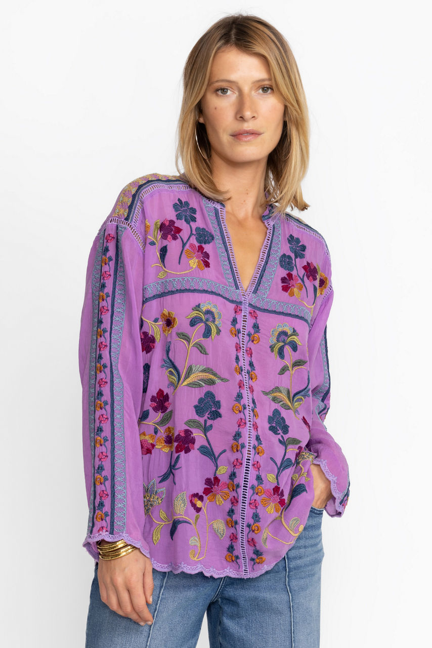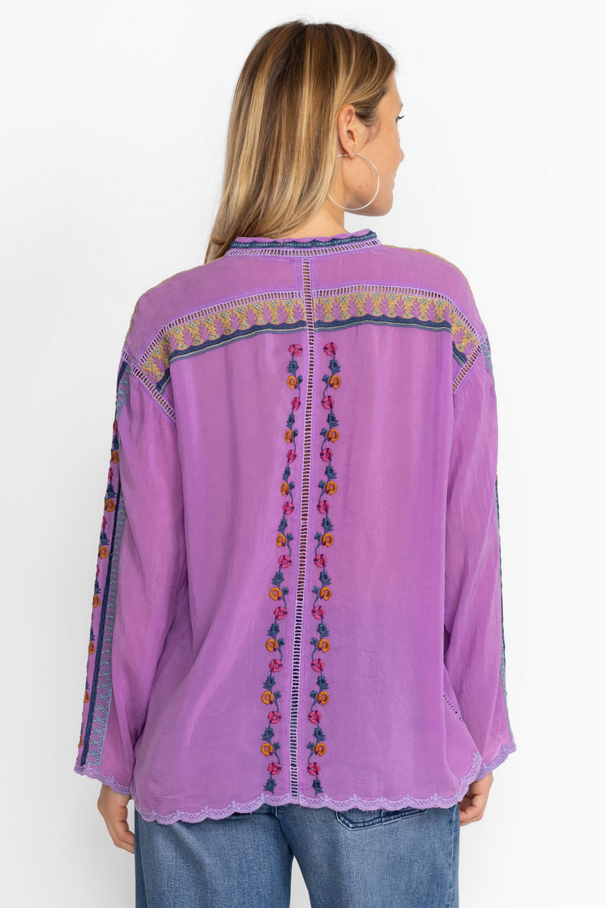 Crafted from a lightweight fabric, the Vanessa Blouse delights with its striking color scheme. Imagined in purple, this blouse boasts a collar, long sleeves, and a detailed placement embroidery comprising romantic blooms. Keep this blouse as the main focus by pairing with simple separates and accessories.