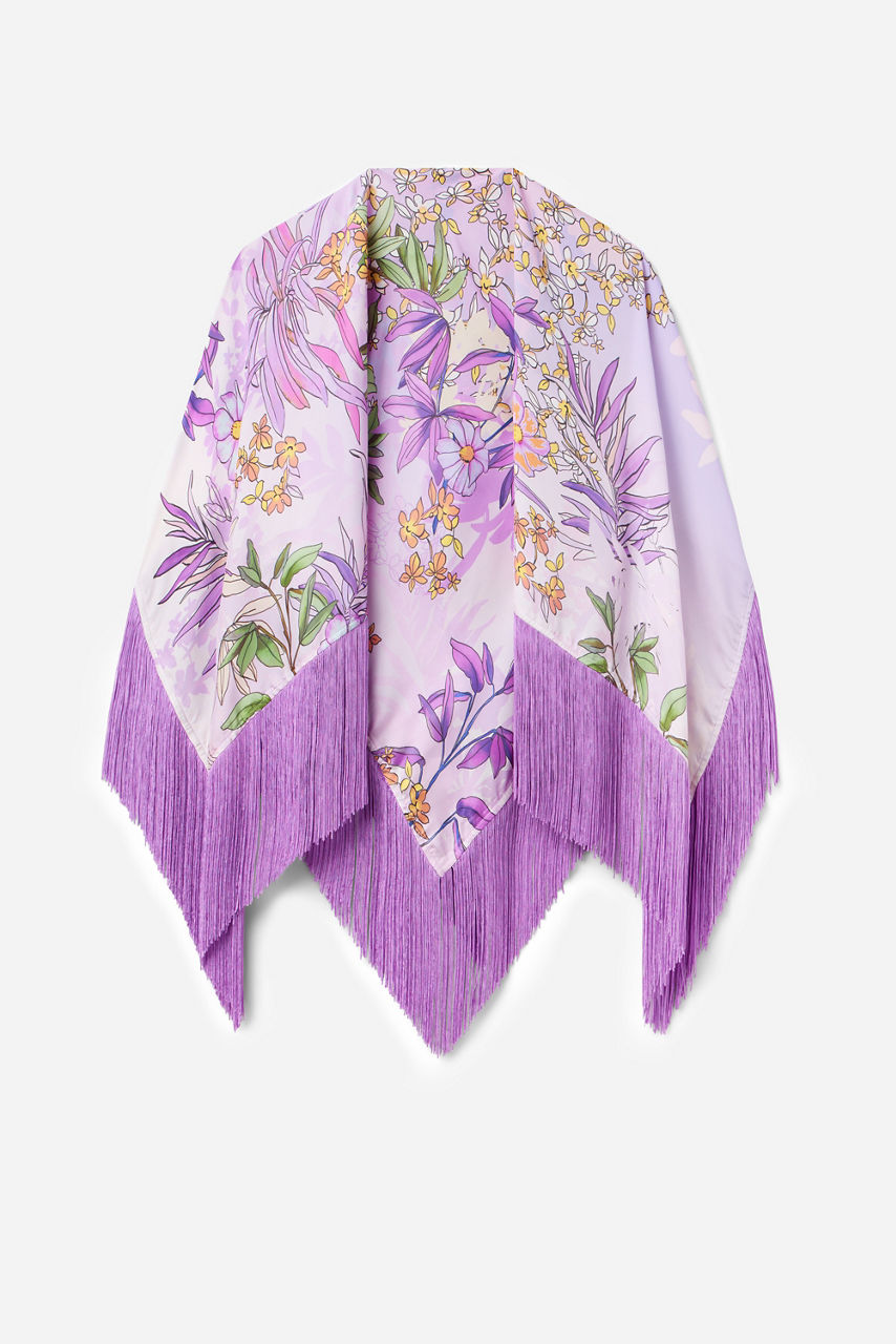 The Vanetta Fringe Wrap is crafted from a rich silk blend and is adorned with a vibrant floral print in hues of purple and green. Designed to be worn draped over the shoulders, this stunning wrap features an open front and is finished with a delicate fringe at the hem adding movement to this beautiful layering piece. Drape over the perfect little black dress and pair with a coordinating clutch for a posh evening look.