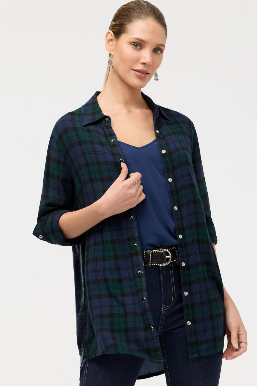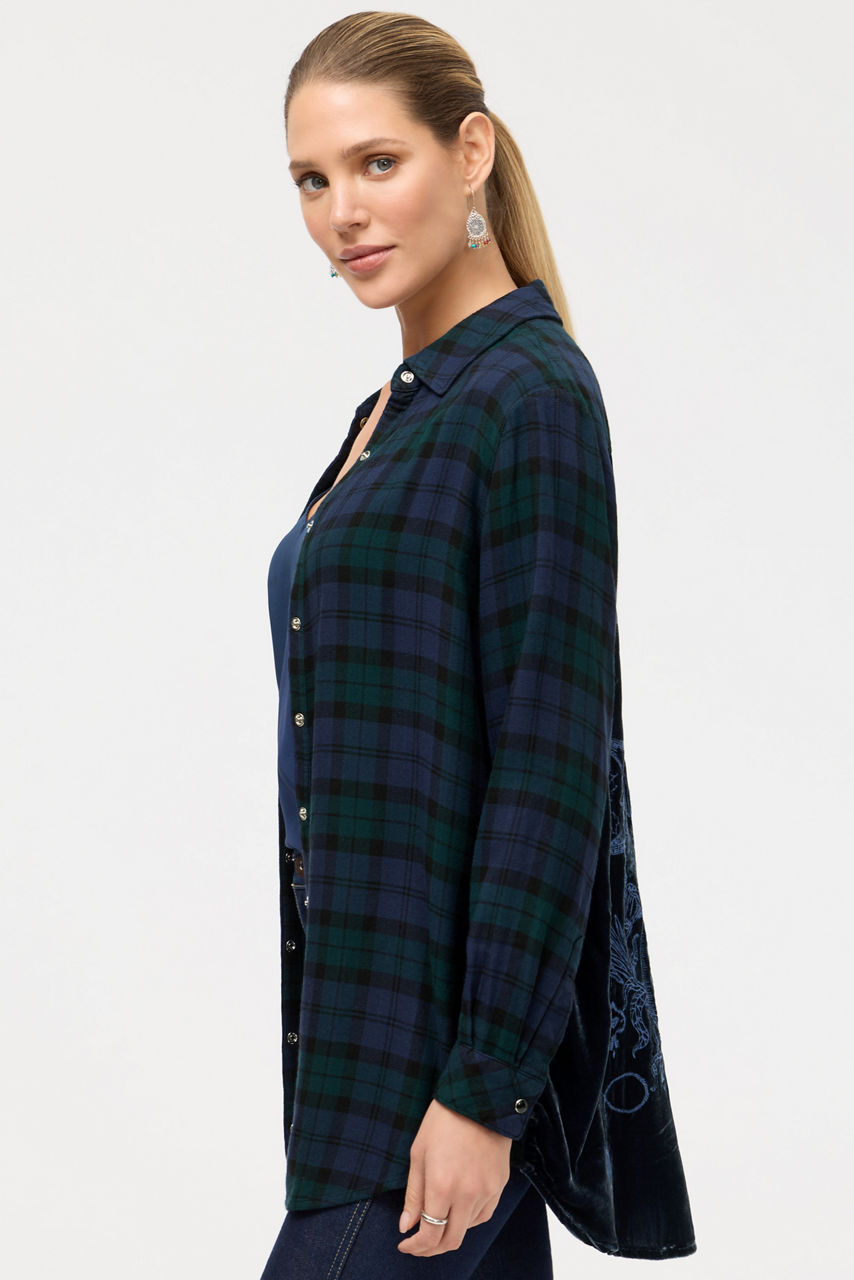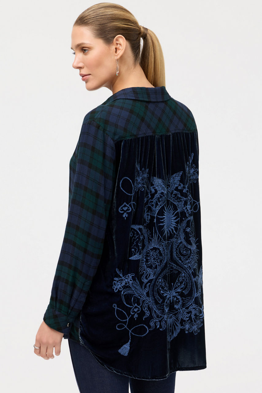 Crafted from a lightweight plaid fabric, the Velvet Back Oversized Shirt features a unique velvet panel at the back. Designed with a classic collared button-front and long sleeves, this shirt features pearlized snap buttons, and is finished with intricately embroidered detailing for a unique finish. Layer over a silk cami and pair with bootcut denim for a casual weekend look with a western flair.