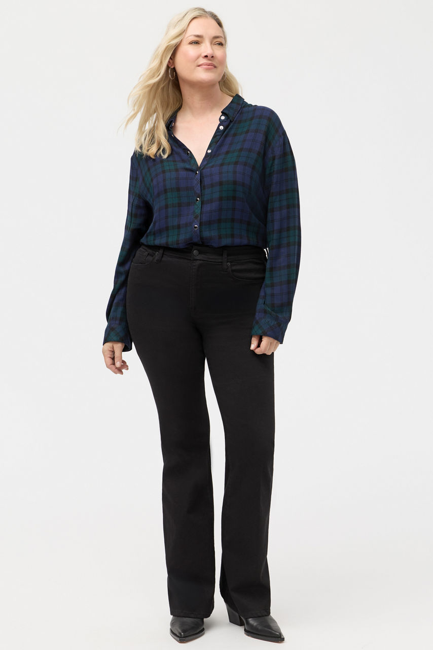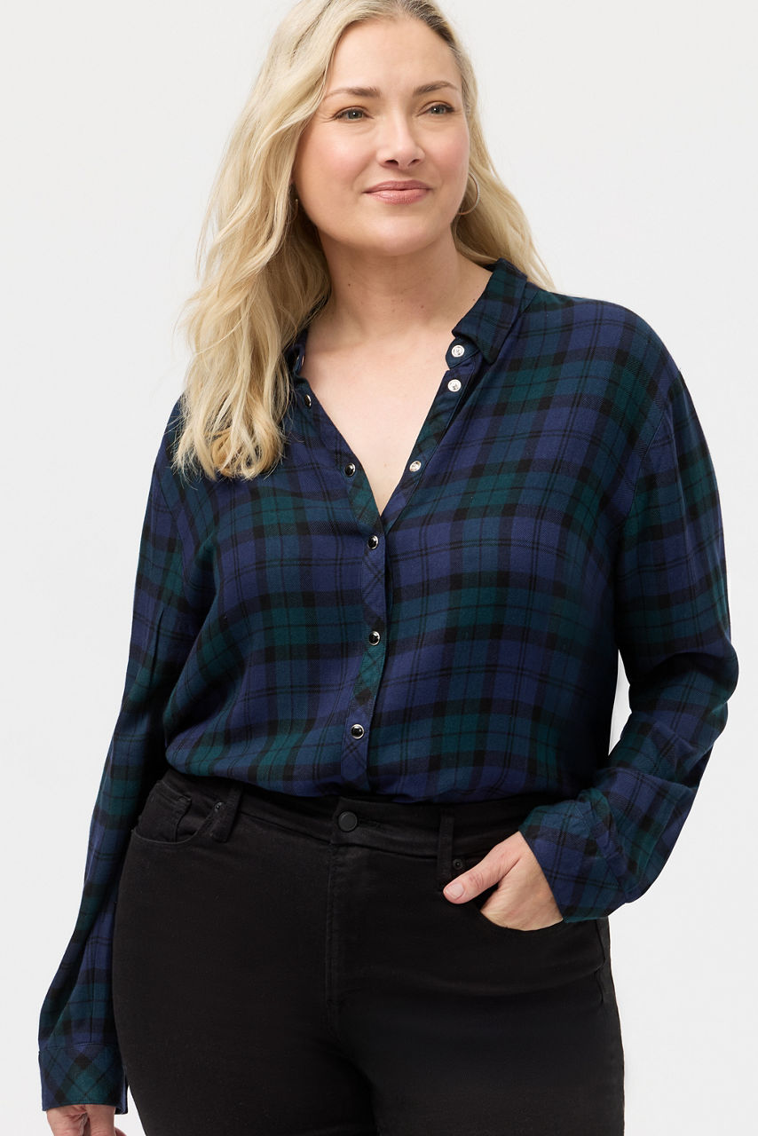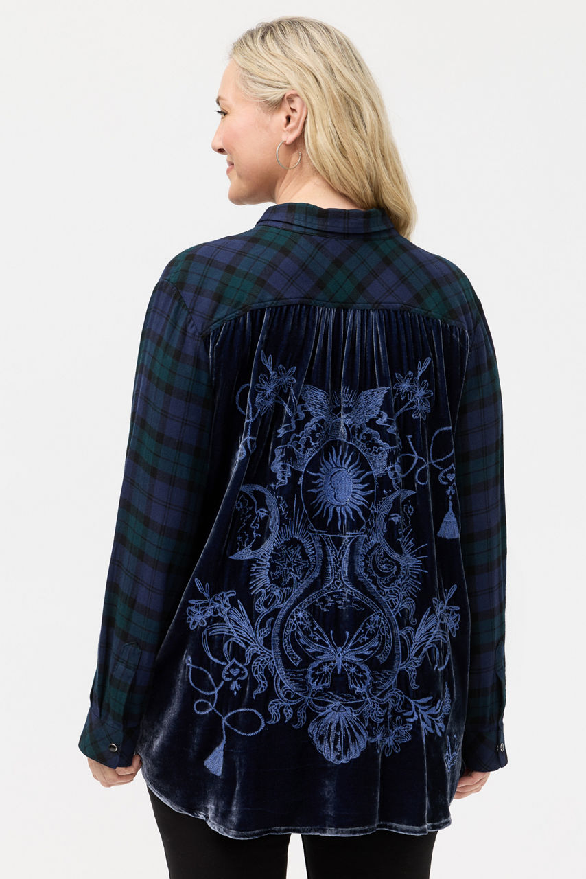 Crafted from a lightweight plaid fabric, the Velvet Back Oversized Shirt features a unique velvet panel at the back. Designed with a classic collared button-front and long sleeves, this shirt features pearlized snap buttons, and is finished with intricately embroidered detailing for a unique finish. Layer over a silk cami and pair with bootcut denim for a casual weekend look with a western flair.