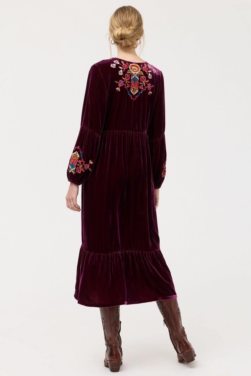 The Anaya Velvet Bishop Sleeve Dress is crafted from a rich silk blend and embellished with intricately embroidered florals at the neck and sleeves. Designed with a split V-neck front with tassels, this dress features Bishop sleeves and a dramatic tiered skirt. Pair with layered jewelry and a raffia bag for an eclectic look.