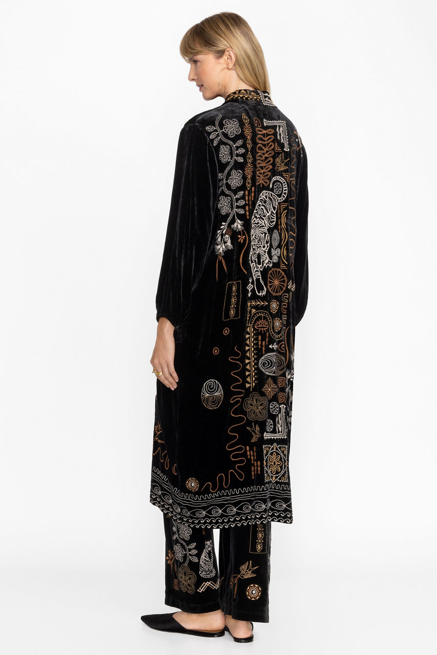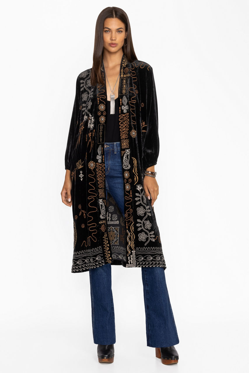 With its alluring fabrication and embroidered details, the Velvet Bishop Sleeve Kimono Coat brings bohemian flair to any outfit. Dress up a casual t-shirt and jeans look with this standout garment, or layer it over a camisole and trousers for a dressier look. Whatever your occasion, it's an ideal piece for fall styling.