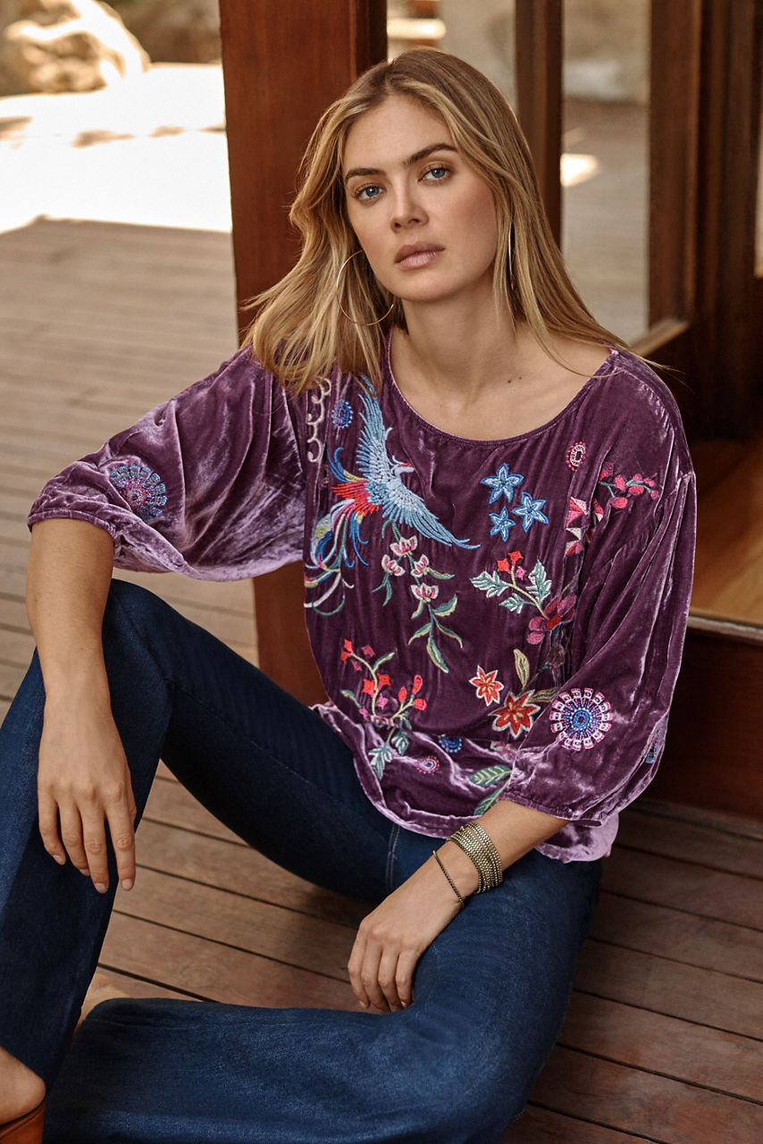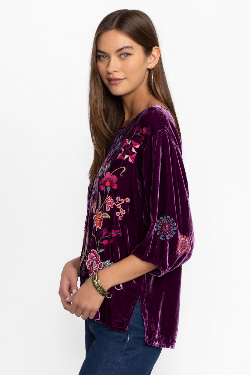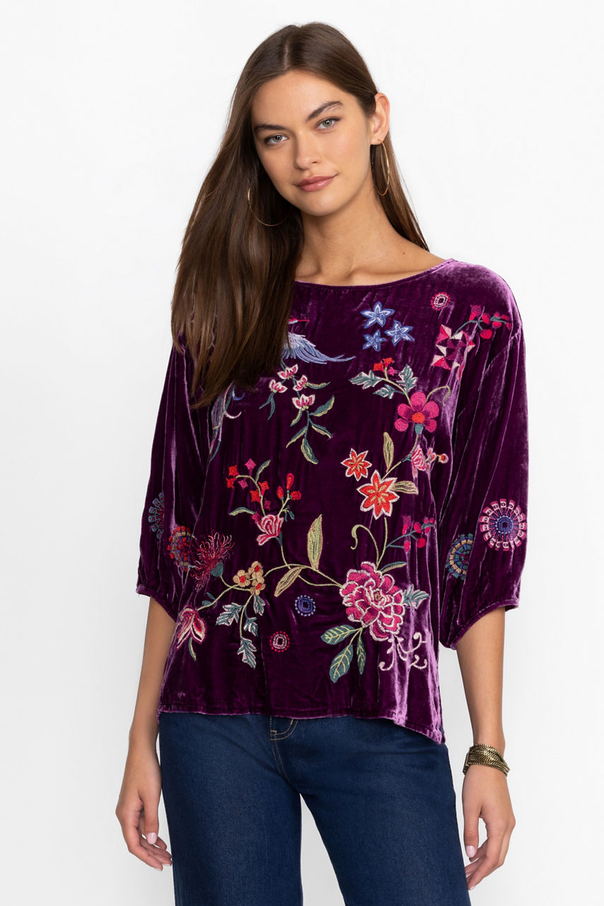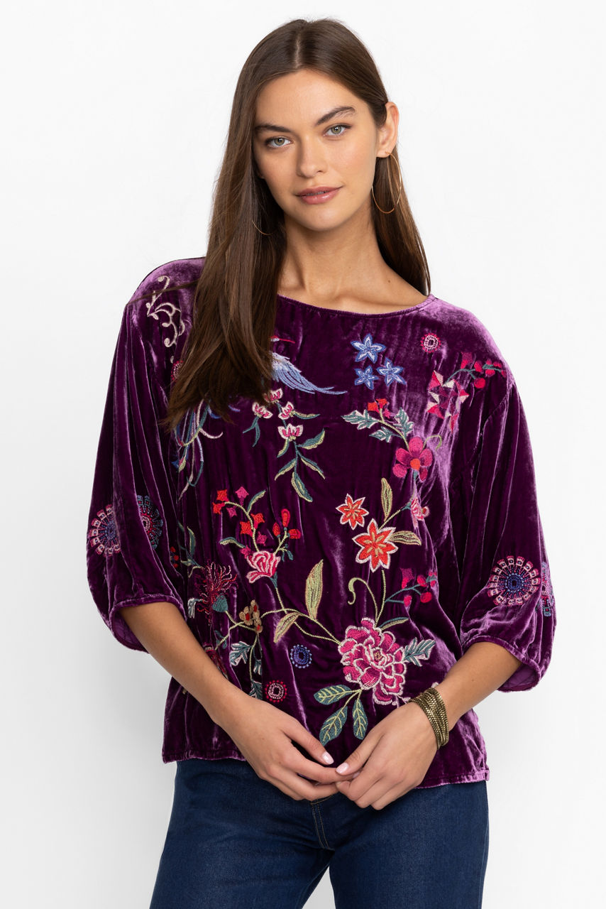 Crafted from a rich velvet in deep plum, the Velvet Boatneck Blouse is the perfect blend of comfort and style. Featuring a wide boatneck and gently puffed 3/4 lantern sleeves, this top is finished with vibrant floral embroidered detailing. Pair with a black pencil skirt and classic pumps for an elegant evening out.