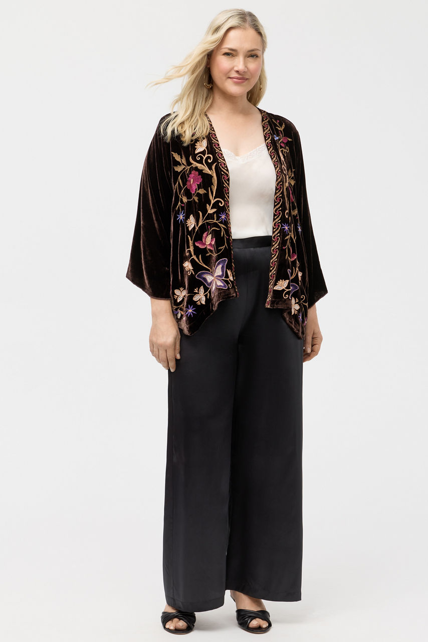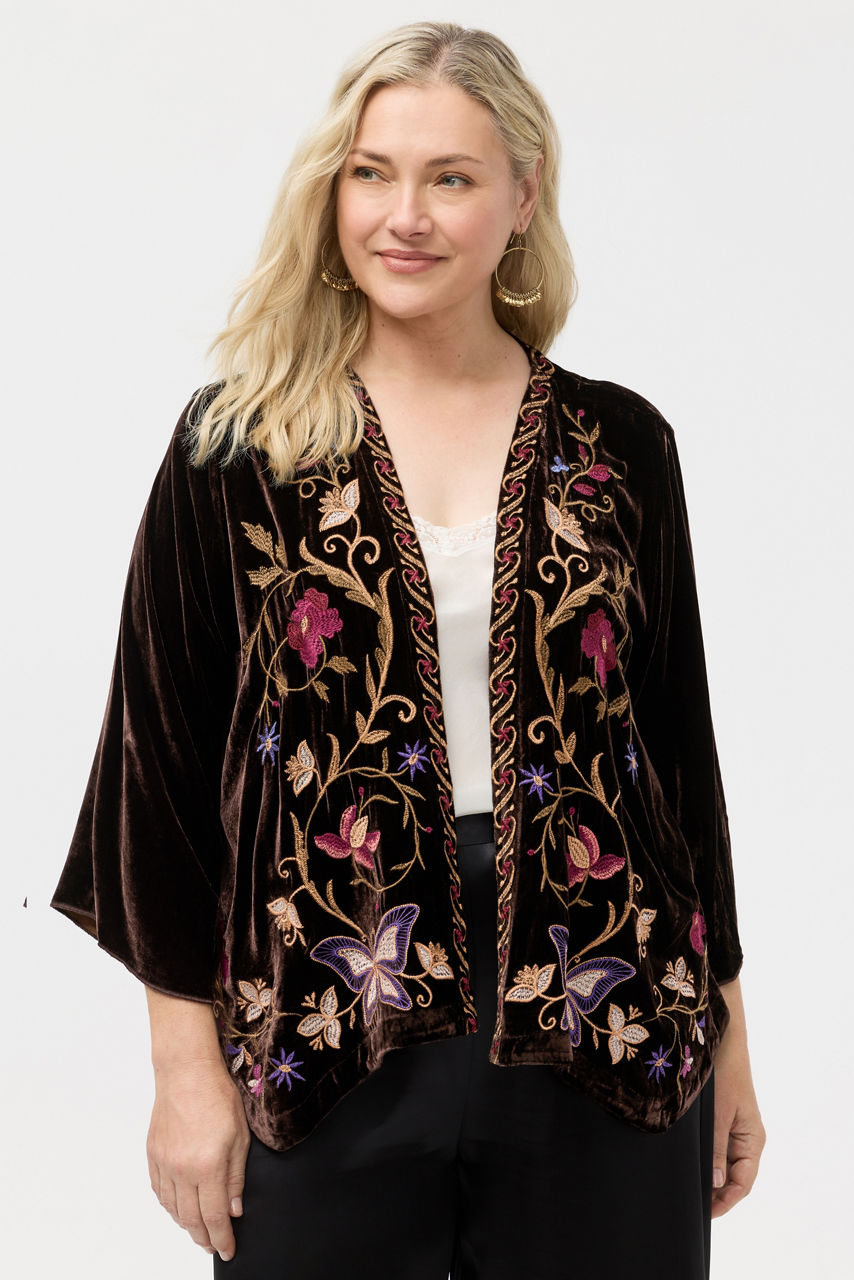Crafted from a soft silk blend, the Carmina Velvet Bolero is accented by intricate embroidered florals in vibrant color. Designed with an open front with a curved hemline, this jacket features a contrasting trim and long sleeves. Layer over a coordinating sheath dress and pair with strappy heels for an elegant dinner out.