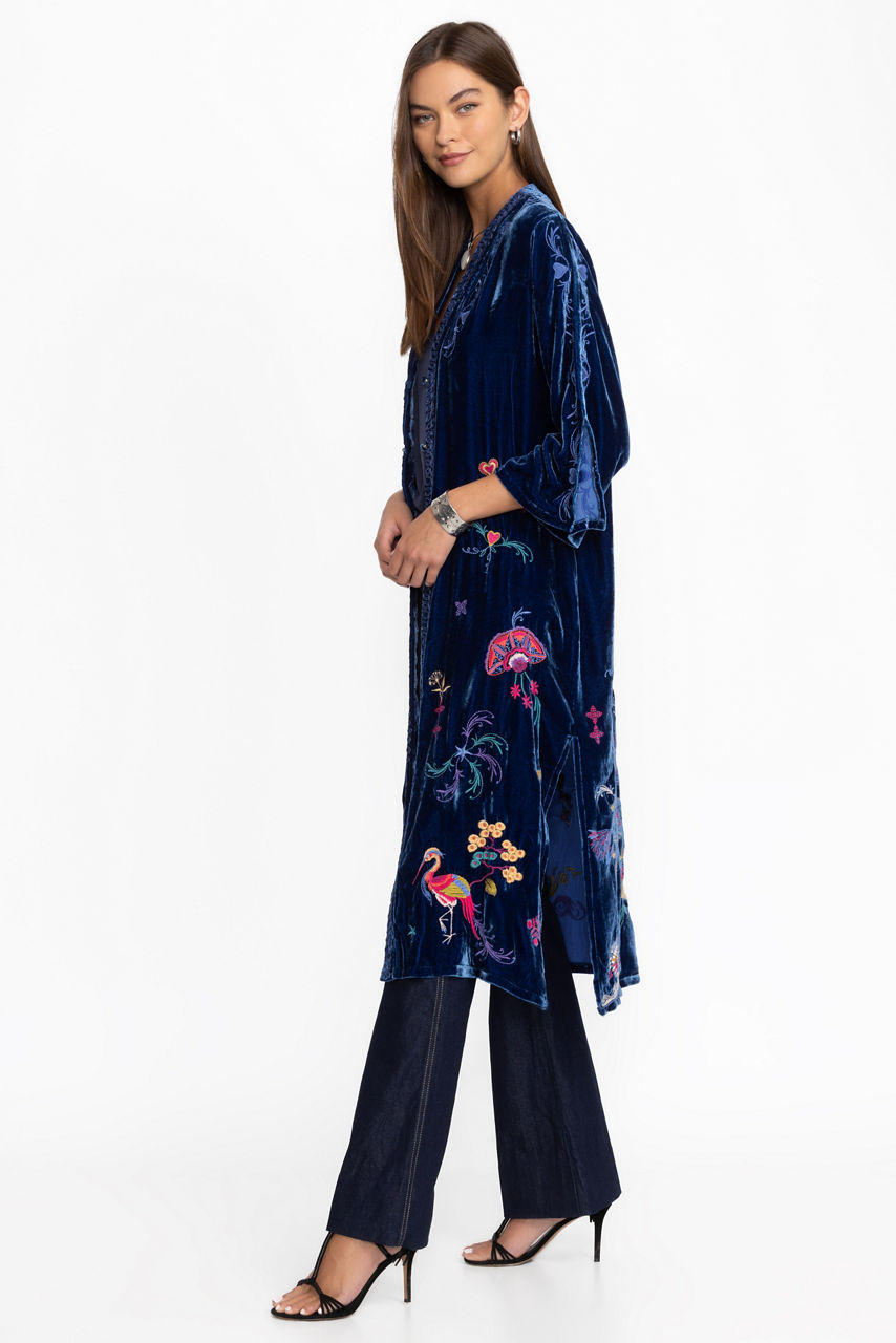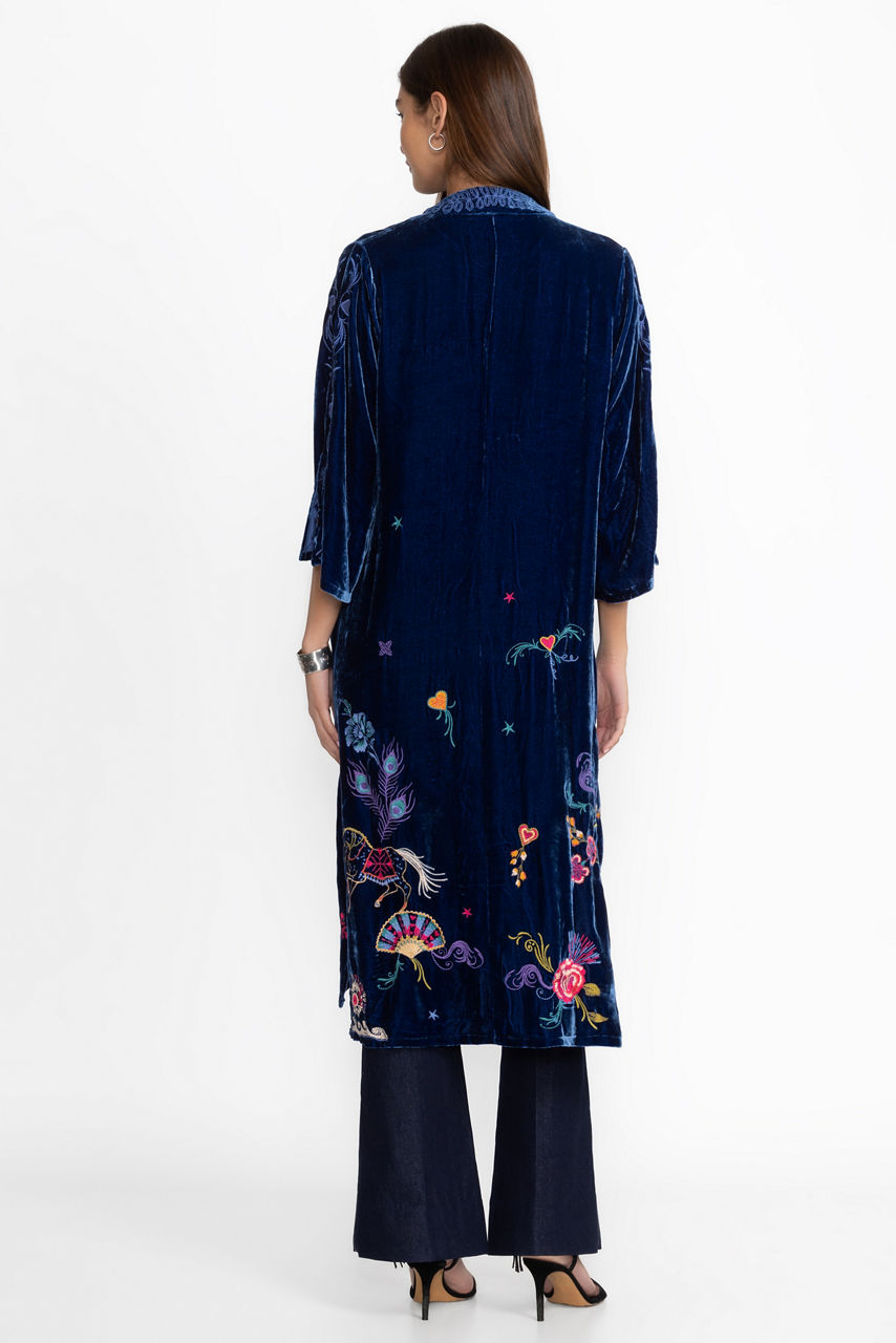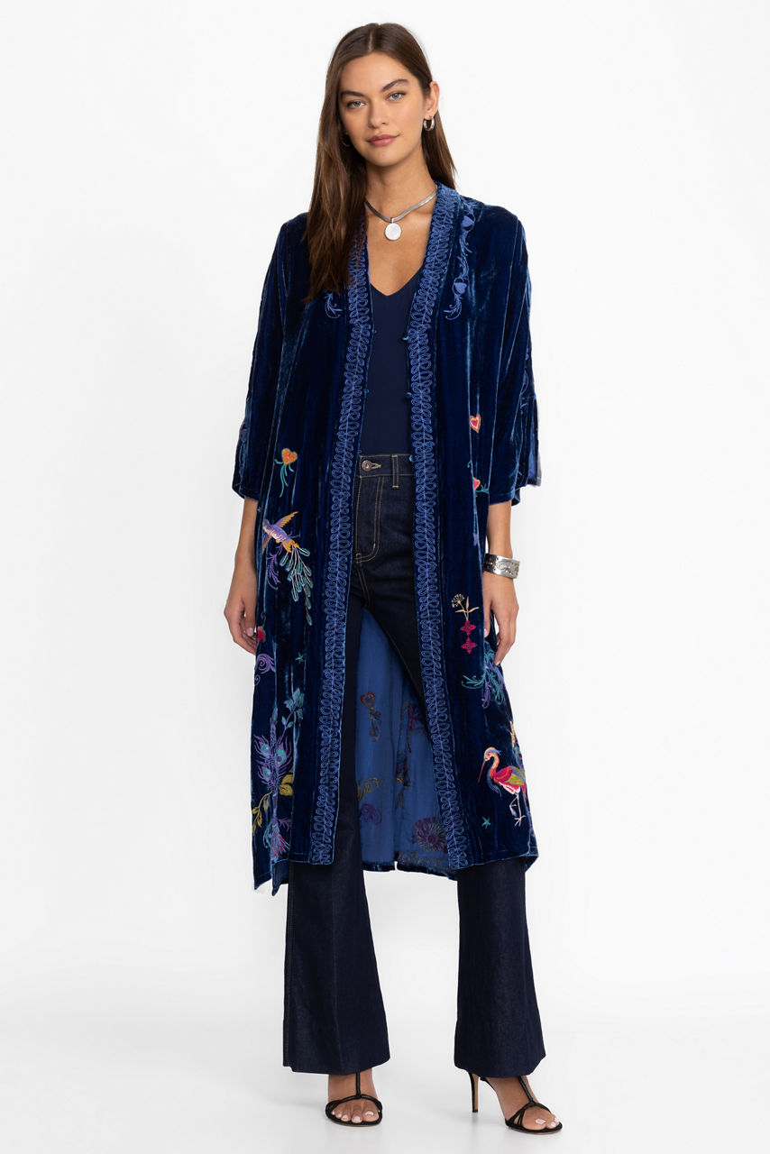 Crafted from a silk blend velvet, the Ariela Velvet Button Front Kimono is a versatile statement style. Featuring a V-neckline and sleeve slits, this button-front kimono is enhanced with vibrant embroidered detailing for a splash of bold color. Layer over a silk cami and fitted pants for an eclectic and eye-catching look.