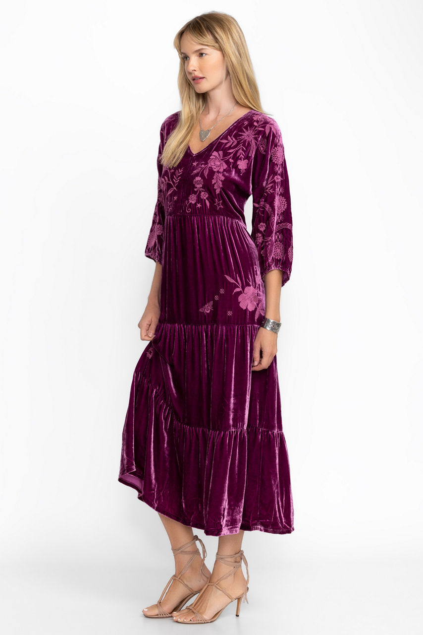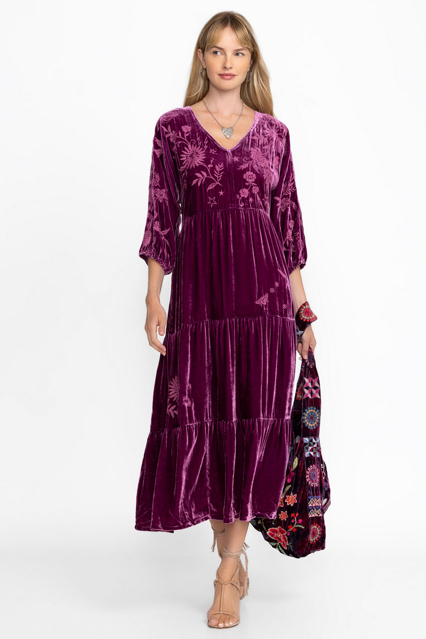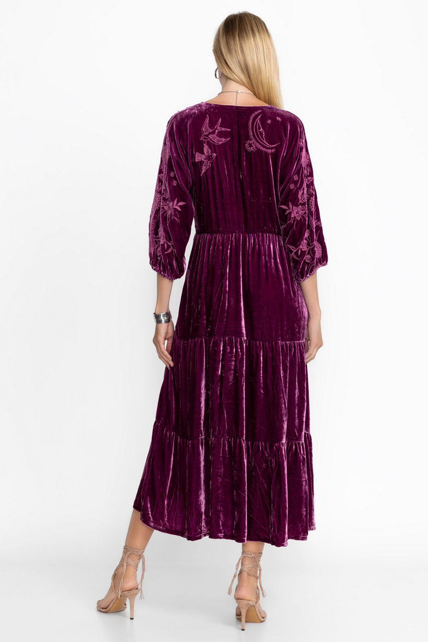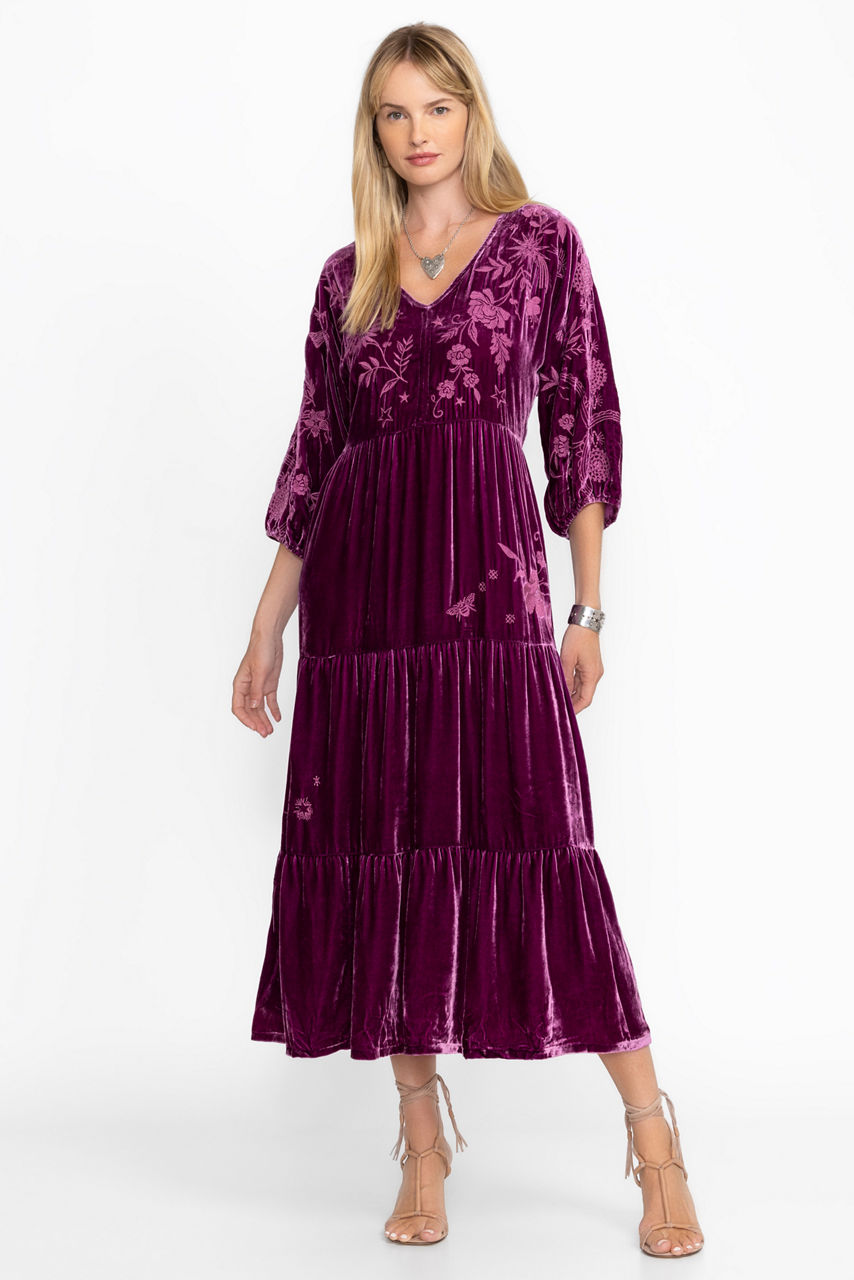 Crafted from a rich, silk-blend velvet, the Velvet Dolman Tiered Dress is a stunning and luxurious piece. Featuring a split V-neckline and gently puffed sleeves, this dress is finished with a tiered skirt and intricate placement embroidery. Pair with a classic clutch and strappy heels for dinner out or a special occasion.