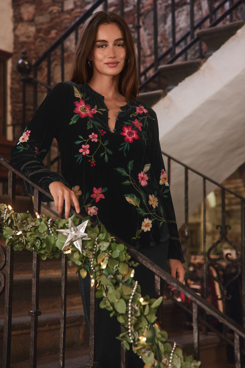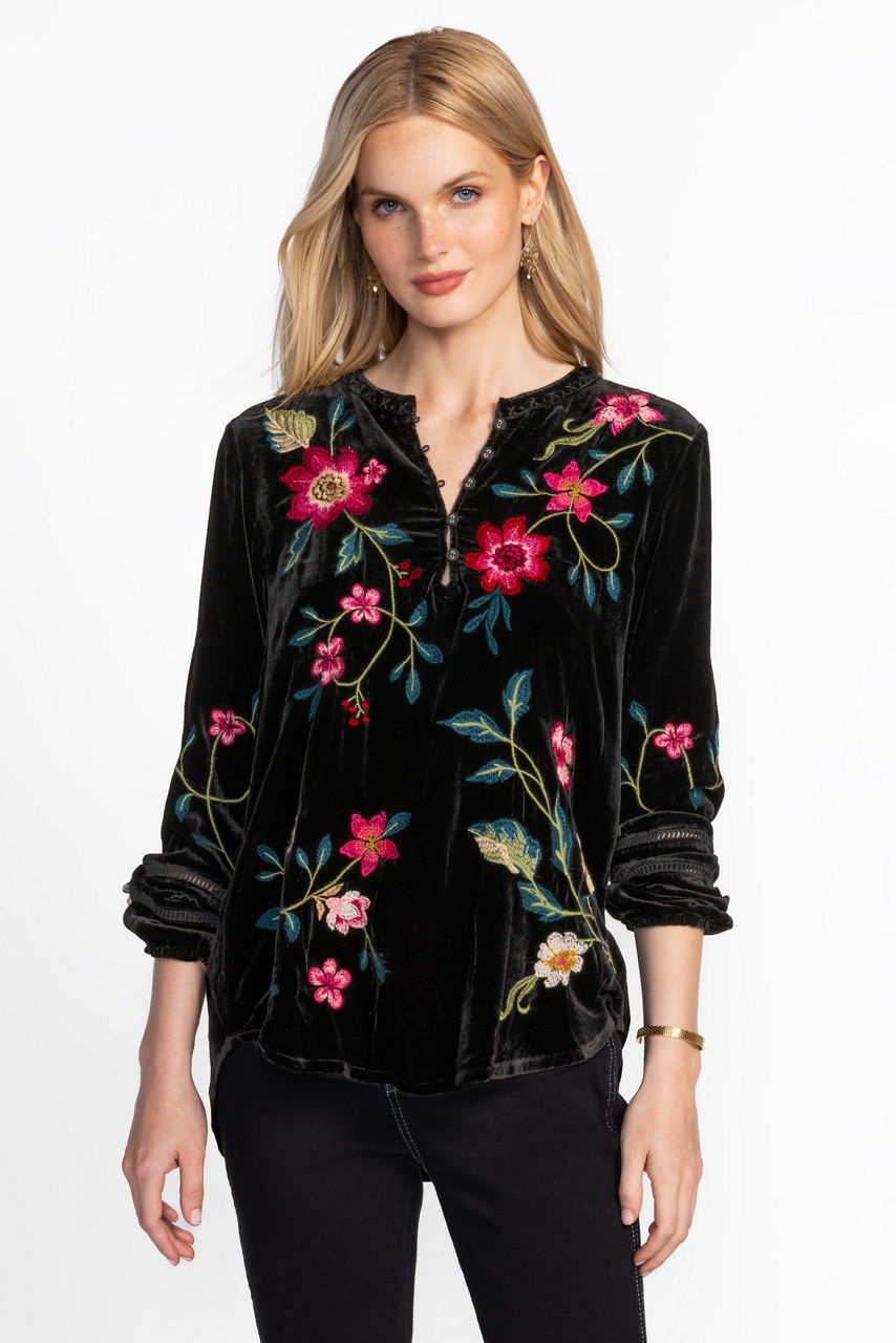 Embellished with brilliant floral placement embroidery, the Rhoda Velvet Estate Blouse is equal parts sophisticated and fun. Featuring a standing collar and Henley neckline, this silk-blend blouse is finished with Bishop sleeves and gathered details. Pair with a sleek pair of pants and flats to complete the look.