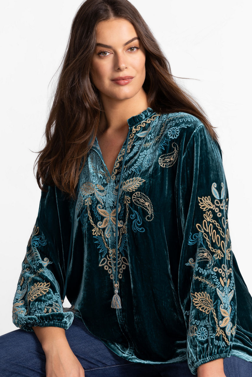 The Shira Velvet Field Blouse is crafted from a soft silk blend and finished with intricate embroidered detailing. Featuring a ruffled collar and a split V-neckline with a tassel tie, this bold blouse offers a relaxed fit for classic comfort. Pair with skinny jeans and trendy ankle boots for a casual combination.