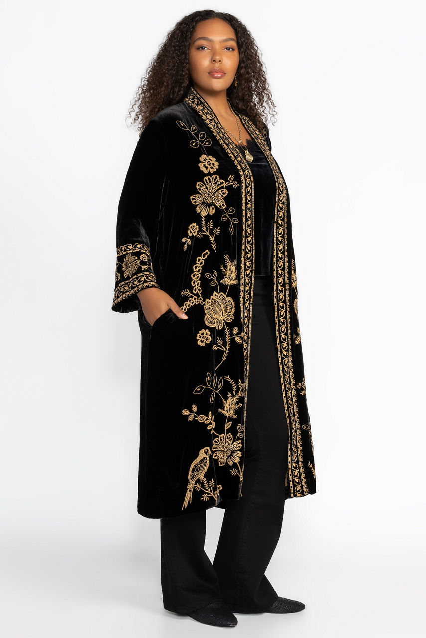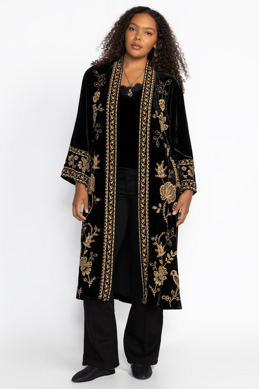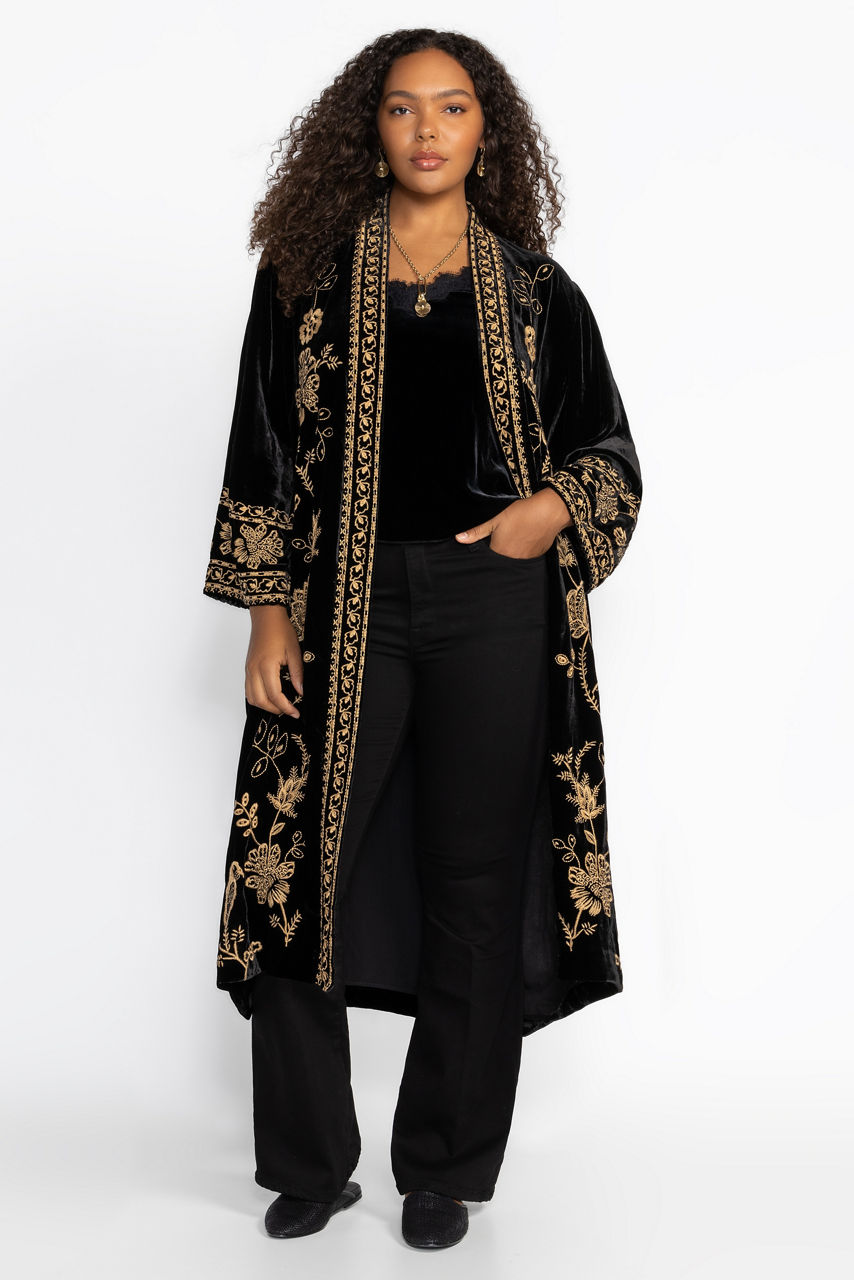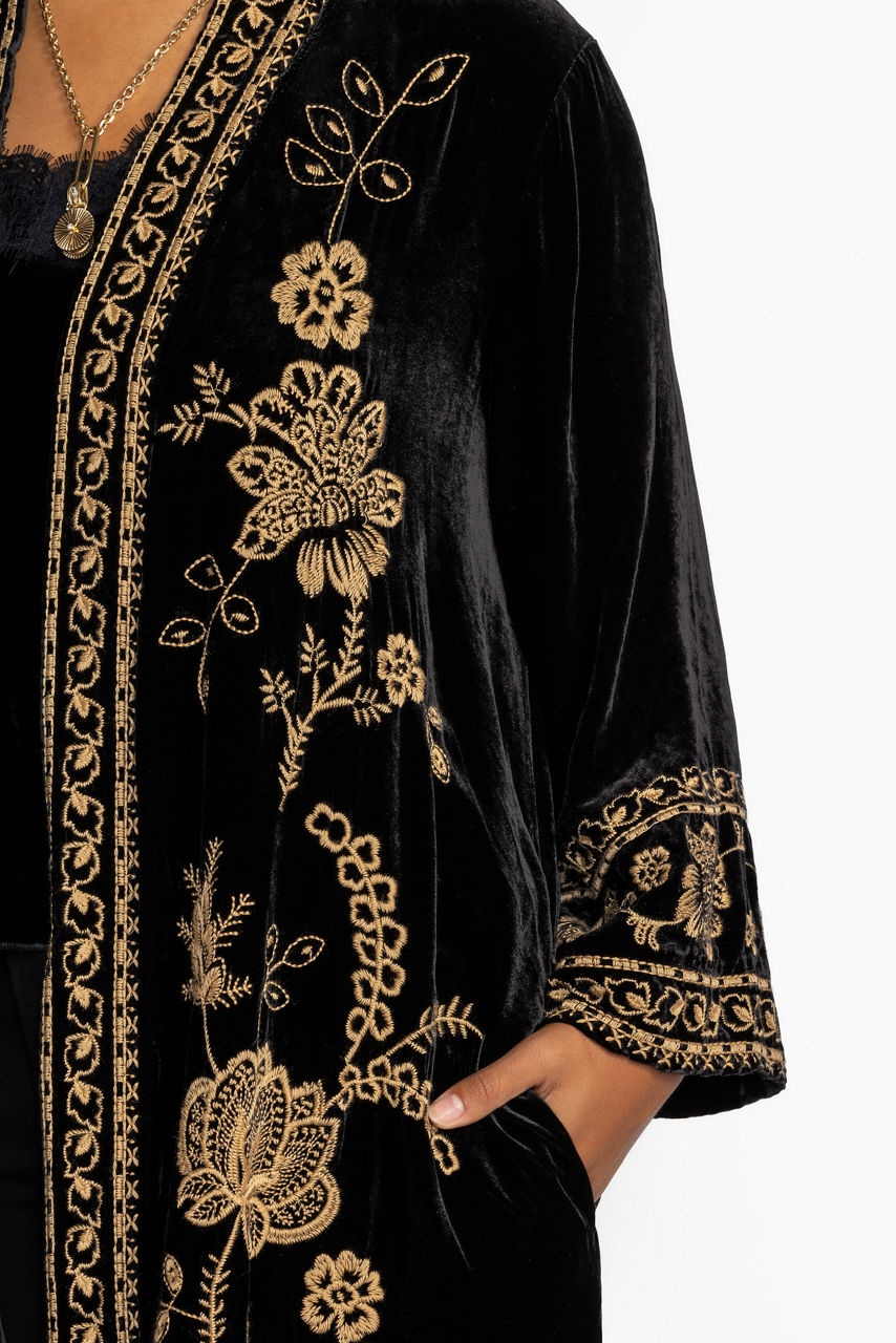 Enhanced with intricate embroidered detailing, the Velvet Kimono Coat adds a hint of drama to your style. Crafted from a rich silk blend, this flowing kimono features 3/4 sleeves and an open front bordered with delicate embroidery. Layer over a sleek, monochromatic look and pair with wedge heels for an elegant night out.
