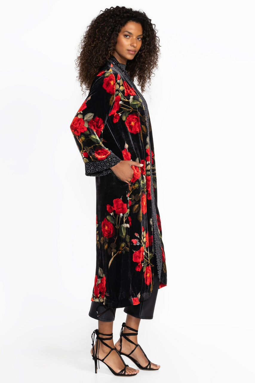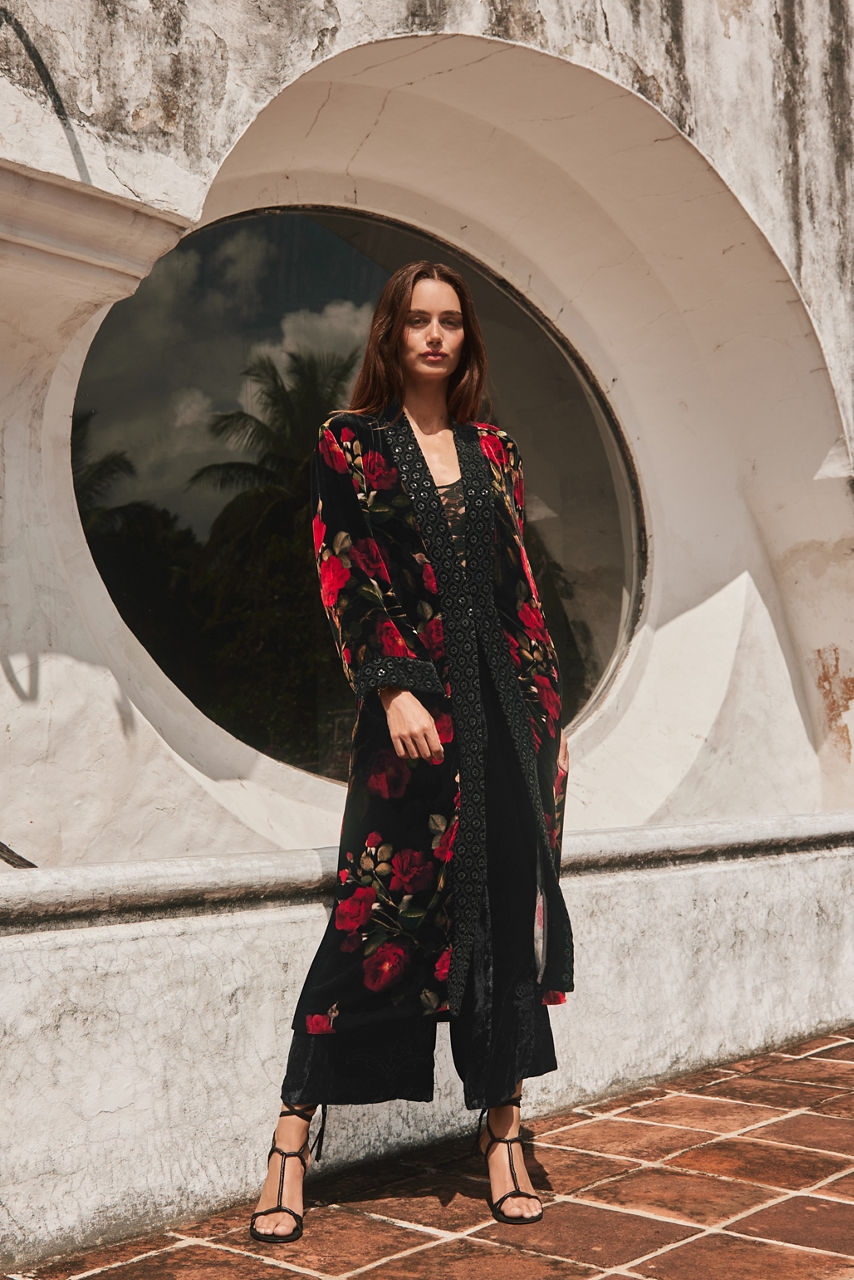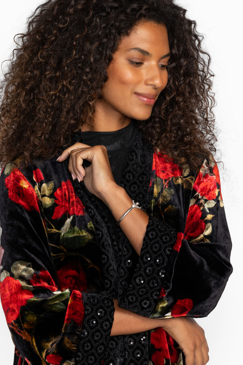 Enhanced with ornate embroidered detailing and bold florals, the Rosana Velvet Kimono Coat adds a hint of drama to your style. Crafted from a rich silk blend, this flowing kimono features 3/4 sleeves and an open front adorned with rich red florals. Layer over a sleek monochromatic look and pair with wedge heels for an elegant night out.