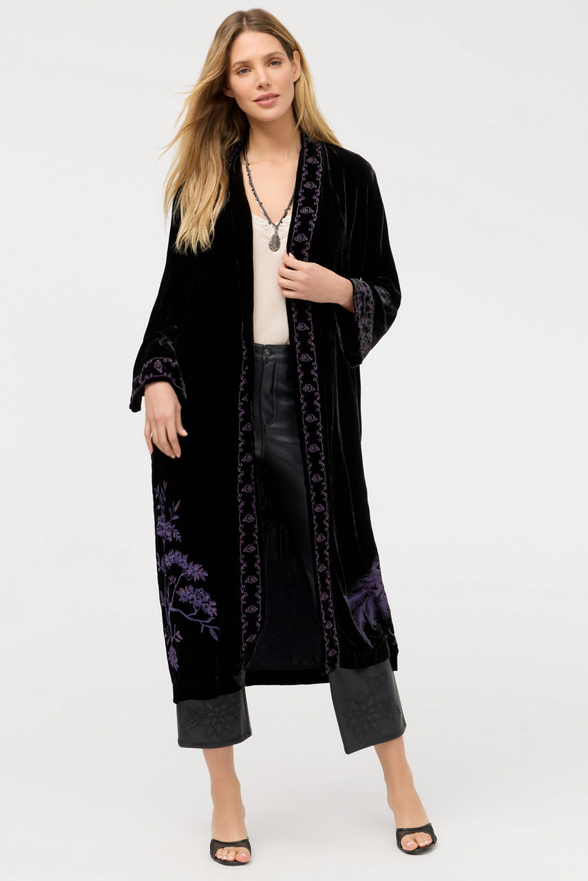Crafted from a sumptuous silk blend, the Molly Velvet Kimono Coat features a stunning embroidered depiction of the wondrous peacock. Designed with an open front and a contrasting trim, this full-length kimono is finished with classic kimono-style sleeves. Layer over a silk cami and the Marik Velvet Pants for a timeless look with an eclectic feel.