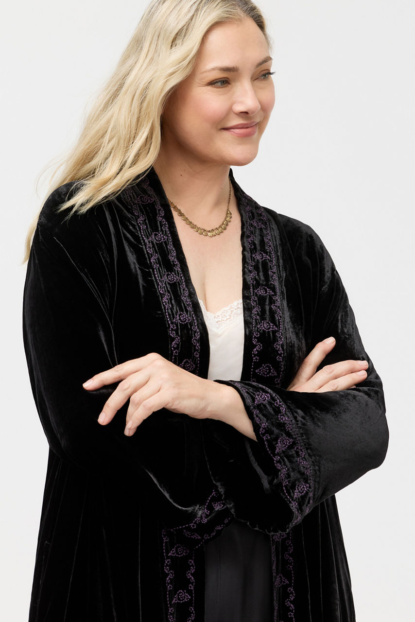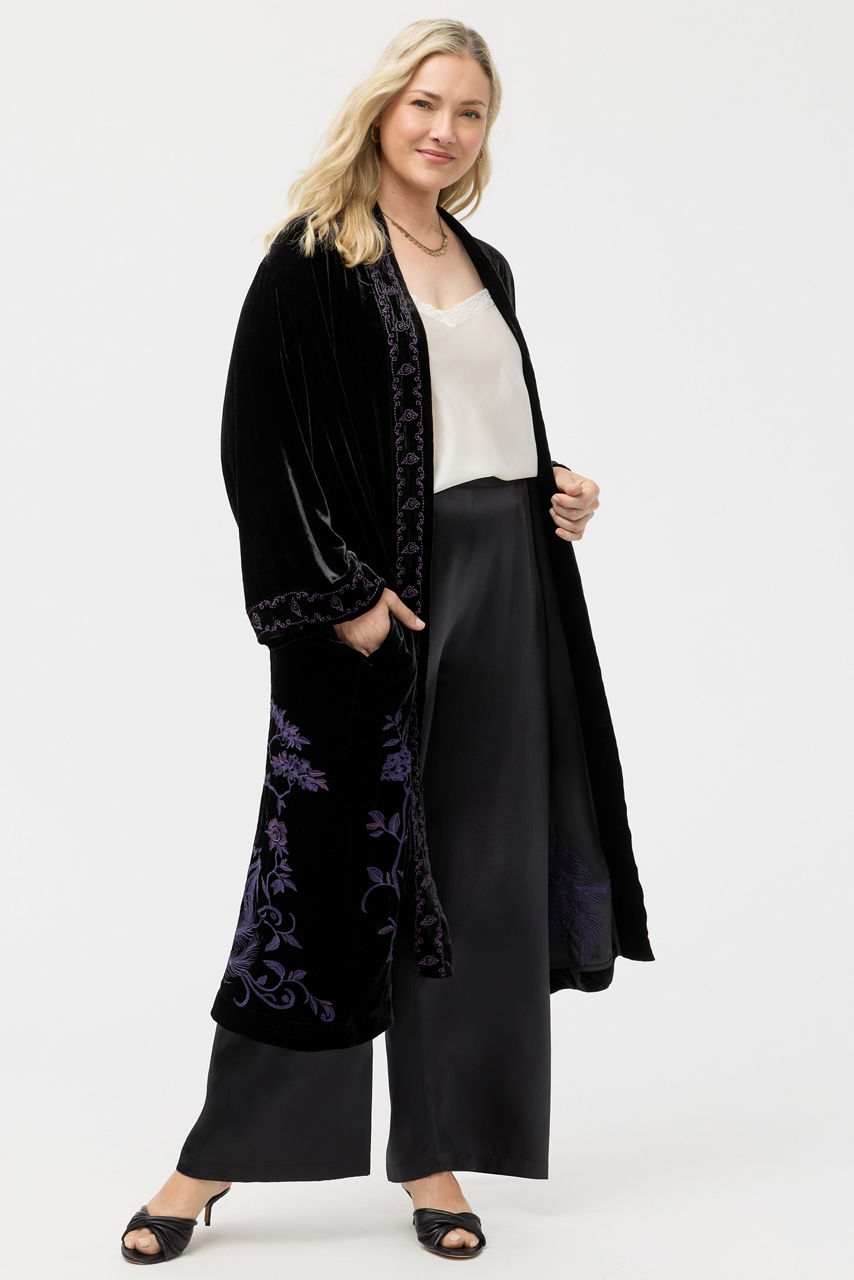 Crafted from a sumptuous silk blend, the Molly Velvet Kimono Coat features a stunning embroidered depiction of the wondrous peacock. Designed with an open front and a contrasting trim, this full-length kimono is finished with classic kimono-style sleeves. Layer over a silk cami and the Marik Velvet Pants for a timeless look with an eclectic feel.