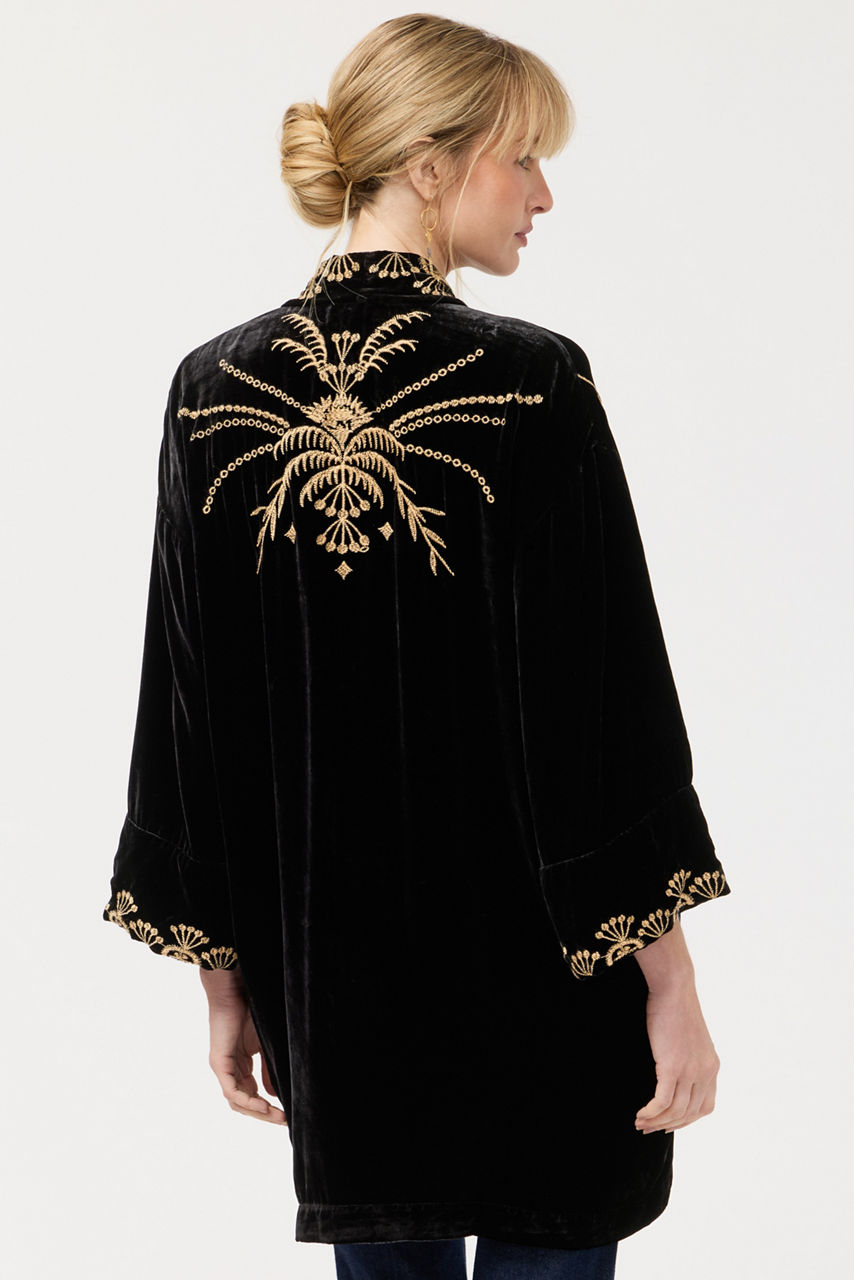Intricately embellished with vibrant gold embroidery on a lush black backdrop, the Lara Velvet Kimono is crafted from a soft silk blend. Featuring an open front and wide 3/4 sleeves, this elegant kimono elevates any look. Layer over an evening dress and pair with delicate gold jewelry for a polished evening aesthetic.