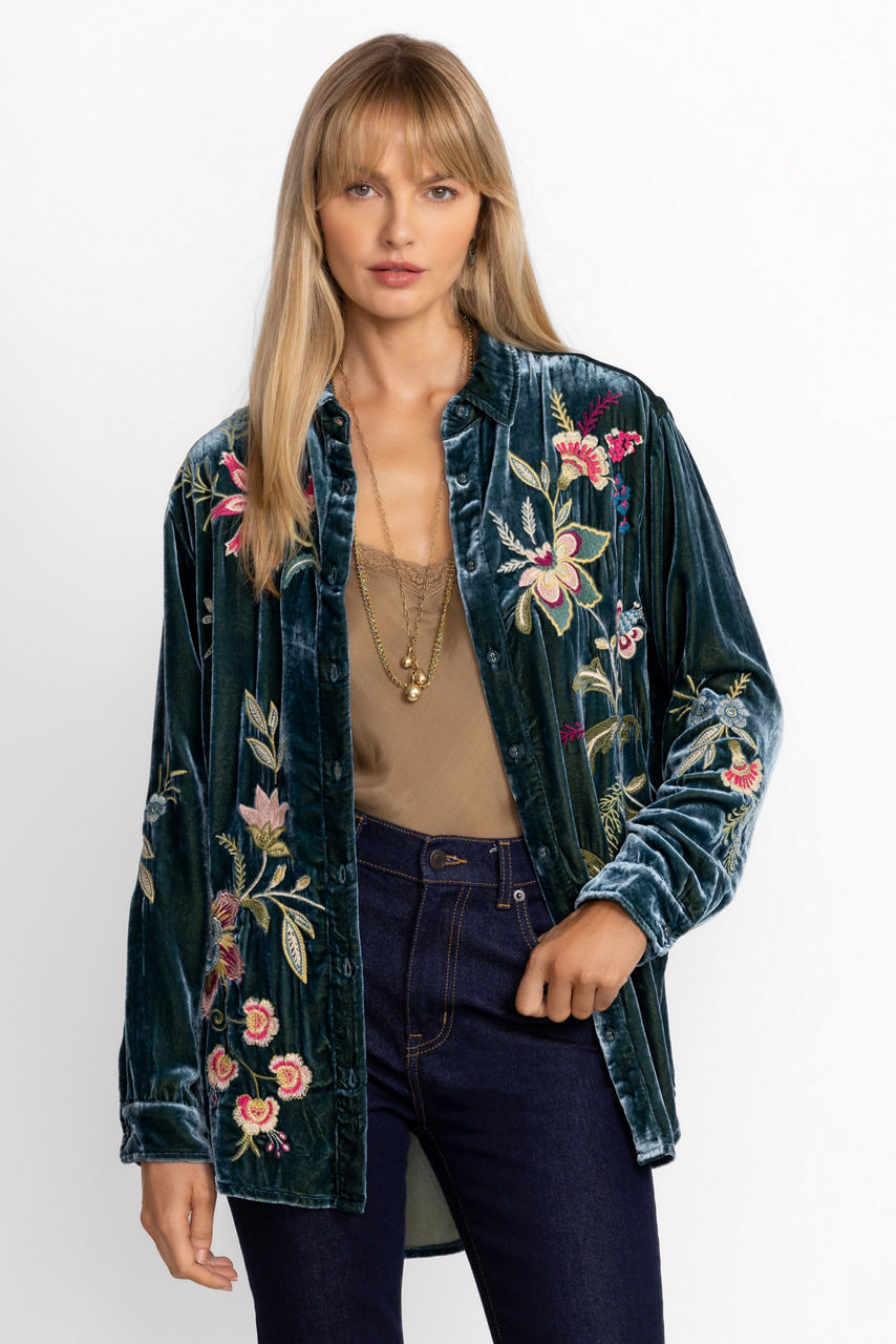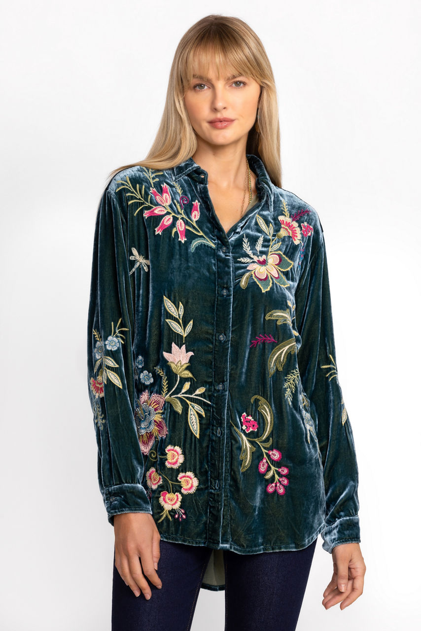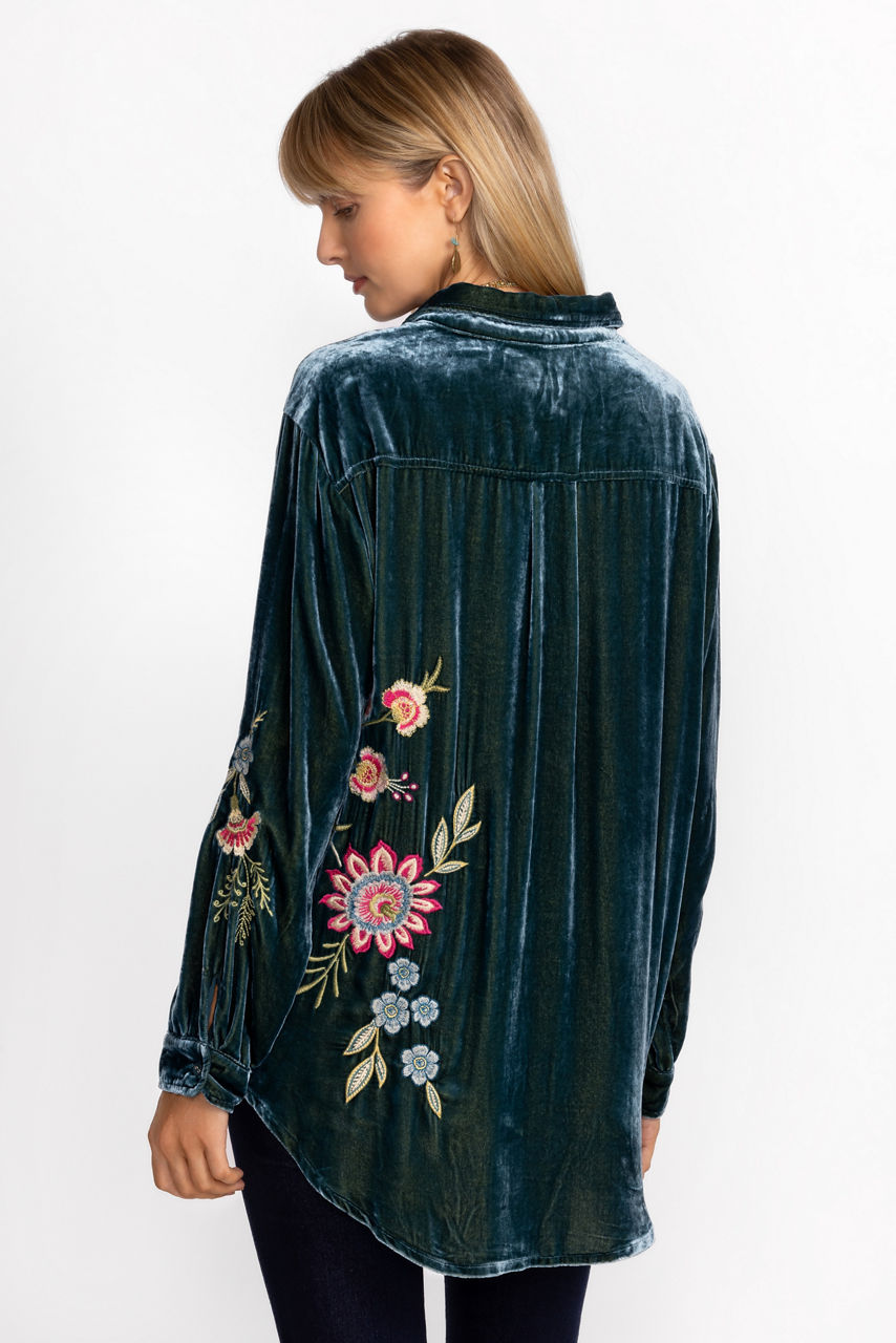 Crafted from a unique silk velvet blend fabric, the Julianna Velvet Oversized Shirt is rich in texture and color. Featuring a classic collared button front and long sleeves, this luxurious top is embellished with intricate embroidered detailing for a splash of color. Pair with fitted pants and coordinating jewelry for an eclectic look.